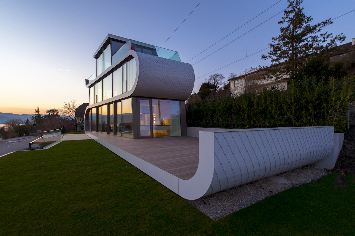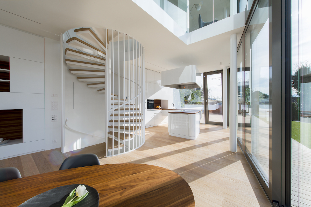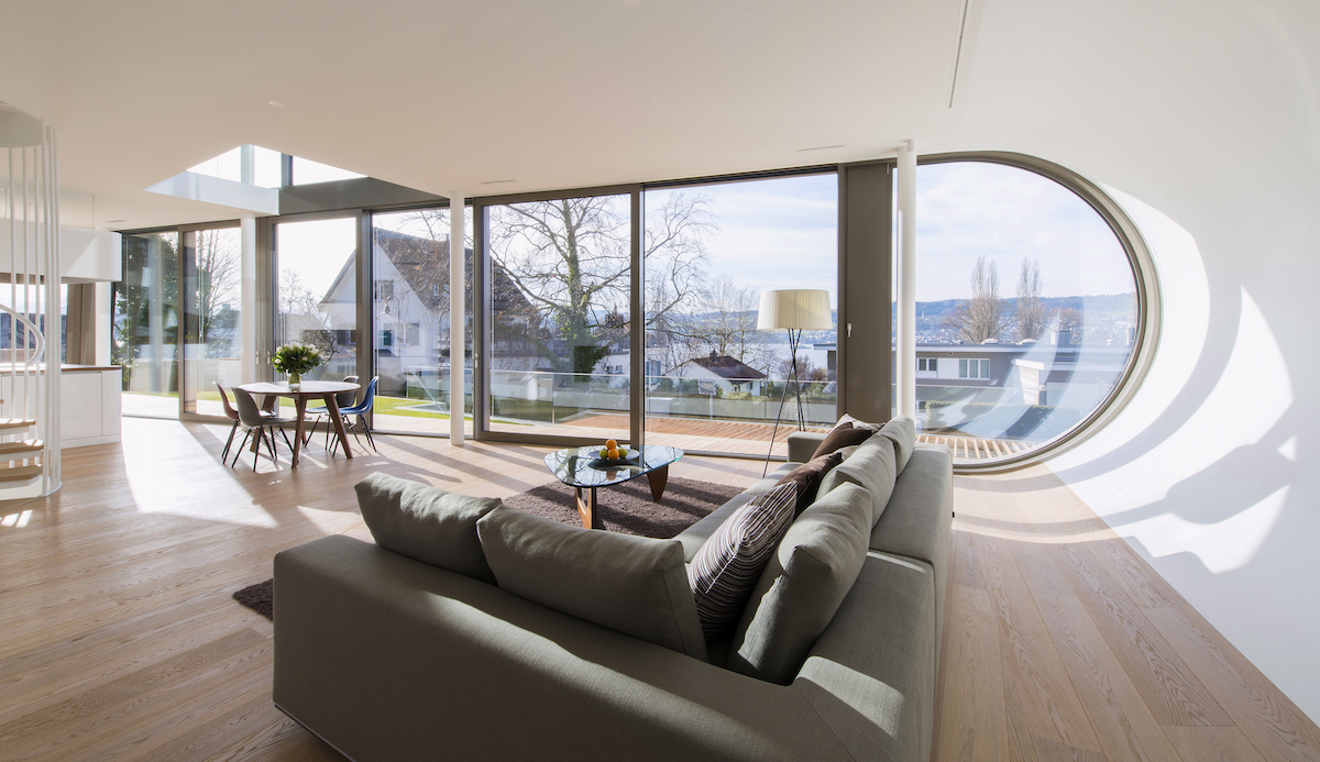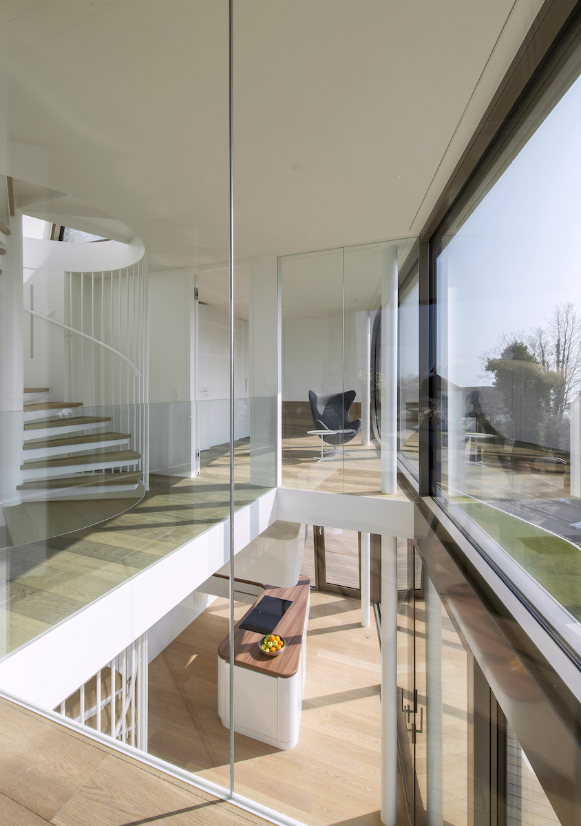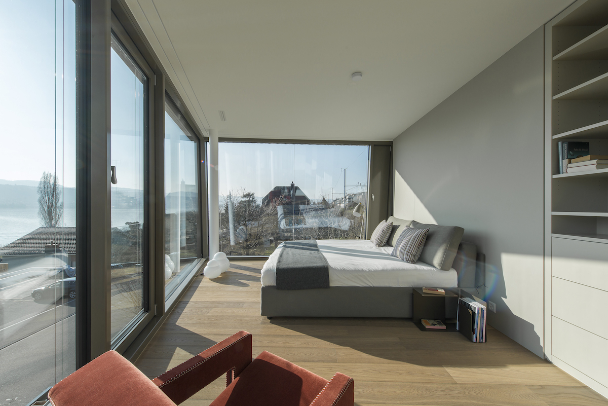 Das Innenraumkonzept maximiert nicht die Fläche, sondern die visuellen Verbindungen und die Vernetzung mit dem Aussen. Zwischen den Geschossen fliesst der Raum offen in der Vertikale und gibt Blickbeziehungen in die beiden Schlafzimmer frei. Voll verglaste Innenwände, bei welchen die gewünschte Transparenz oder Privatsphäre mit Vorhängen individuell geregelt werden kann, erzeugen den Effekt der visuellen Öffnung, ermöglichen eine 180° Durch- und Aussicht im 1. Obergeschoss und verbinden die Geschosse durch das Licht und den Aussenraumbezug miteinander. Den Höhepunkt in der Verzahnung von Innen und Aussen stellt das dreiseitig verglaste, mit zwei Dachterrassen ausgestattete Studio im Dachgeschoss dar, das zudem einen Panoramablick über den Zürichsee bis hin zu den Bergen bietet.