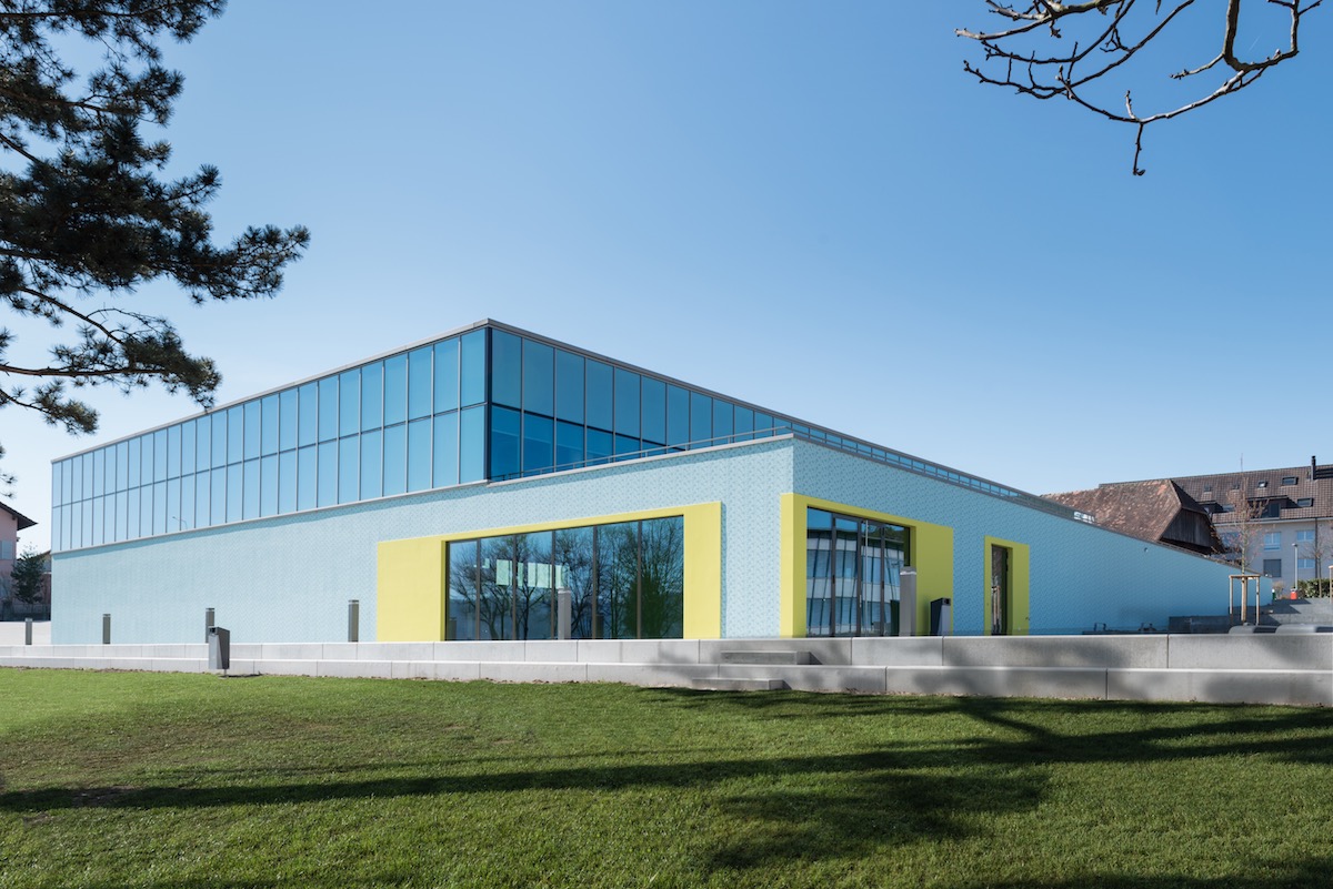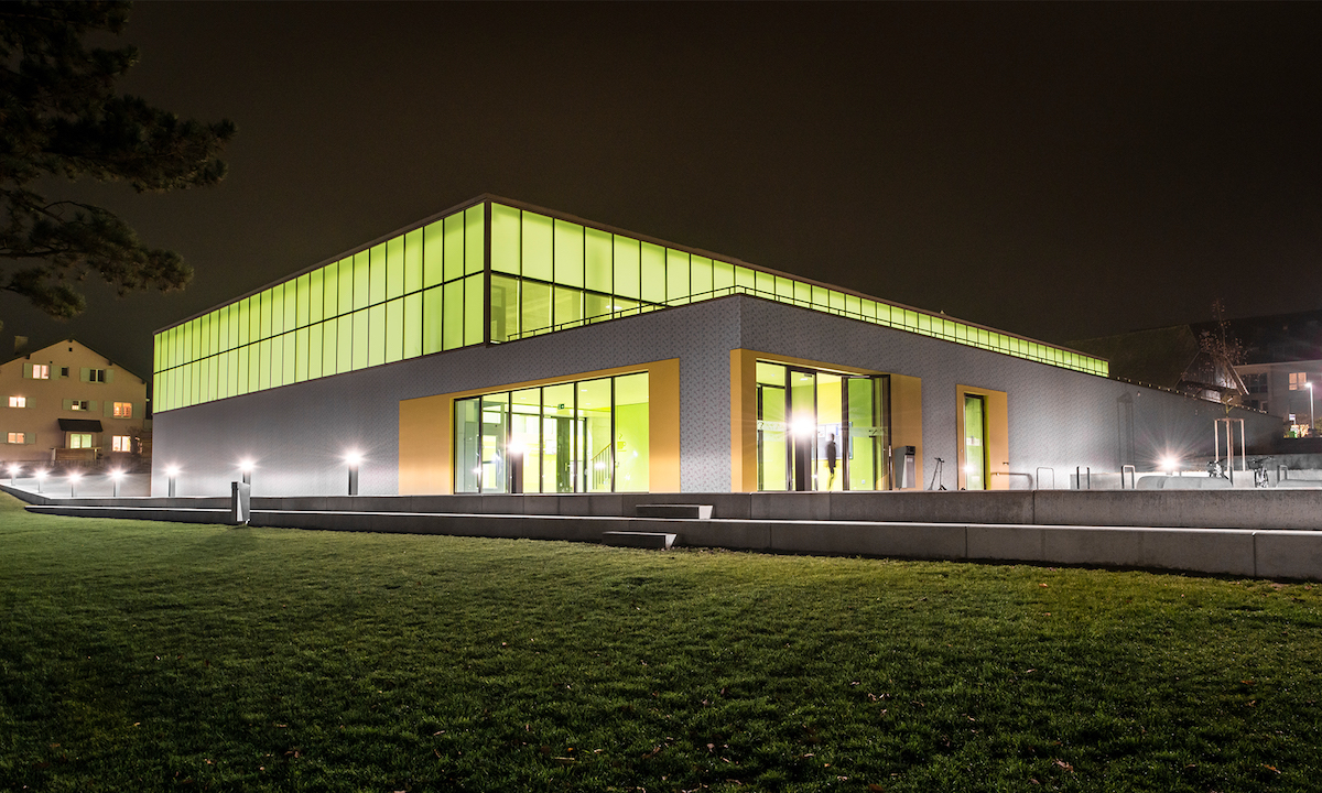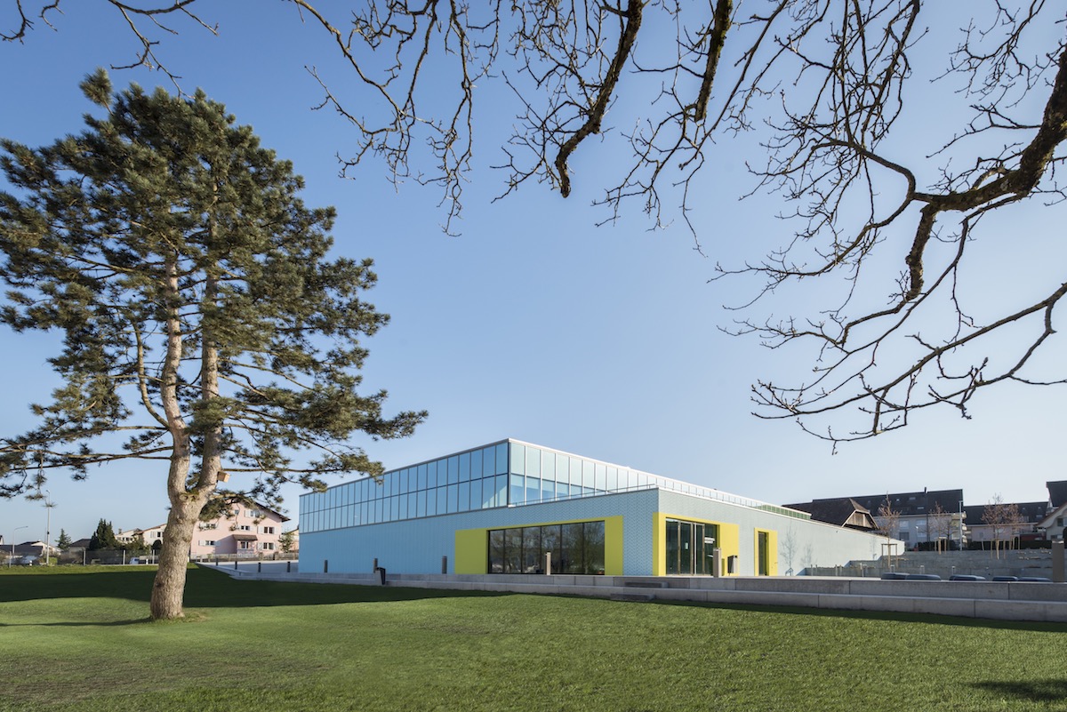 Im kompakten Sockel sind sämtliche für den Betrieb erforderlichen Nutzungen zusammengefasst. Über einen behindertengerechten Lift und eine großzügige Treppe wird die Zuschauergalerie erreicht. Der aufgesetzte Glaskörper mit lichtstreuendem Isolierglas in Kombination mit textilem Blendschutz holt die Natur in die Halle und auf die Galerie und versorgt das Innere mit Tageslicht. Der ins Glas integrierte Sonnenschutz schirmt die Sportler vor Sonne und Hitze ab. Dabei fängt die Glasfassade den Lauf des Tages und der Jahreszeiten ein. Gemäß Minergiestandard realisiert, kommt für die Beheizung der Sporthalle eine Erdsonden-Wärmepumpe zum Einsatz, die im Sommer außerdem eine kühlende Funktion nach dem Prinzip des Freecooling übernimmt. Weiters sind eine mechanische Lüftung für Sporthalle und Garderoben und LED-Leuchten für Halle und Außenanlagen Teil des ökologischen Konzepts.