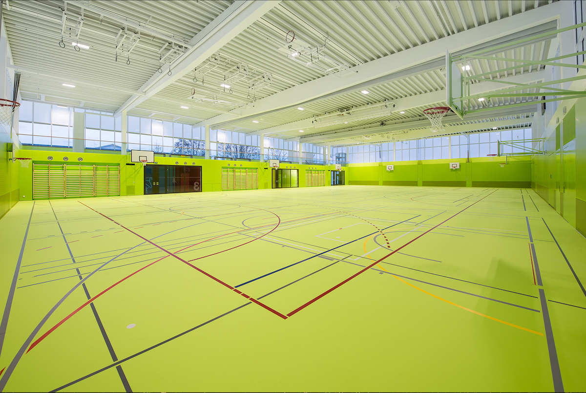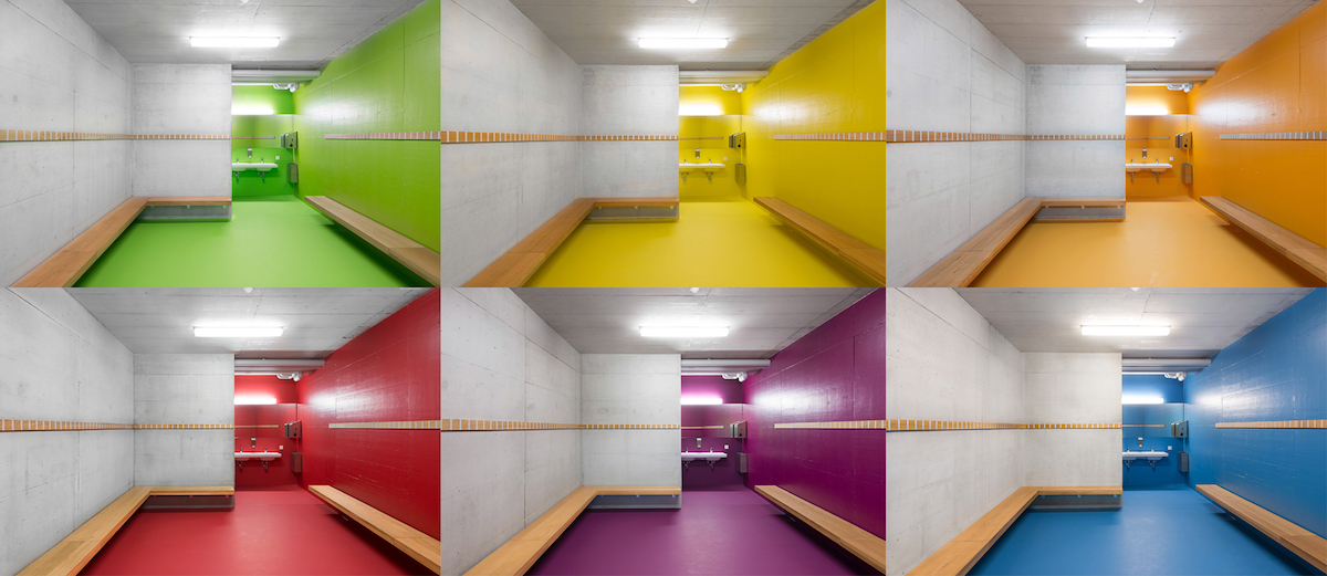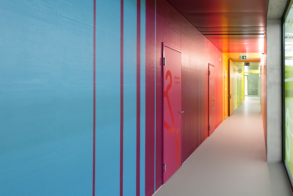Das Farbenkonzept des Gebäudes überzeugt nicht nur optisch, es hilft auch bei der Orientierung: Die einzelnen Umkleidekabinen sind farblich unterschieden, Betonwände, sowie Tür- und Fensterrahmen greifen die Töne der Spielfeldmarkierungen auf: gelb, orange, rot und blau – so finden auch jüngste Sportler sich zurecht. (Text: Regine Koth-Afzelius nach einem Text des Architekten)