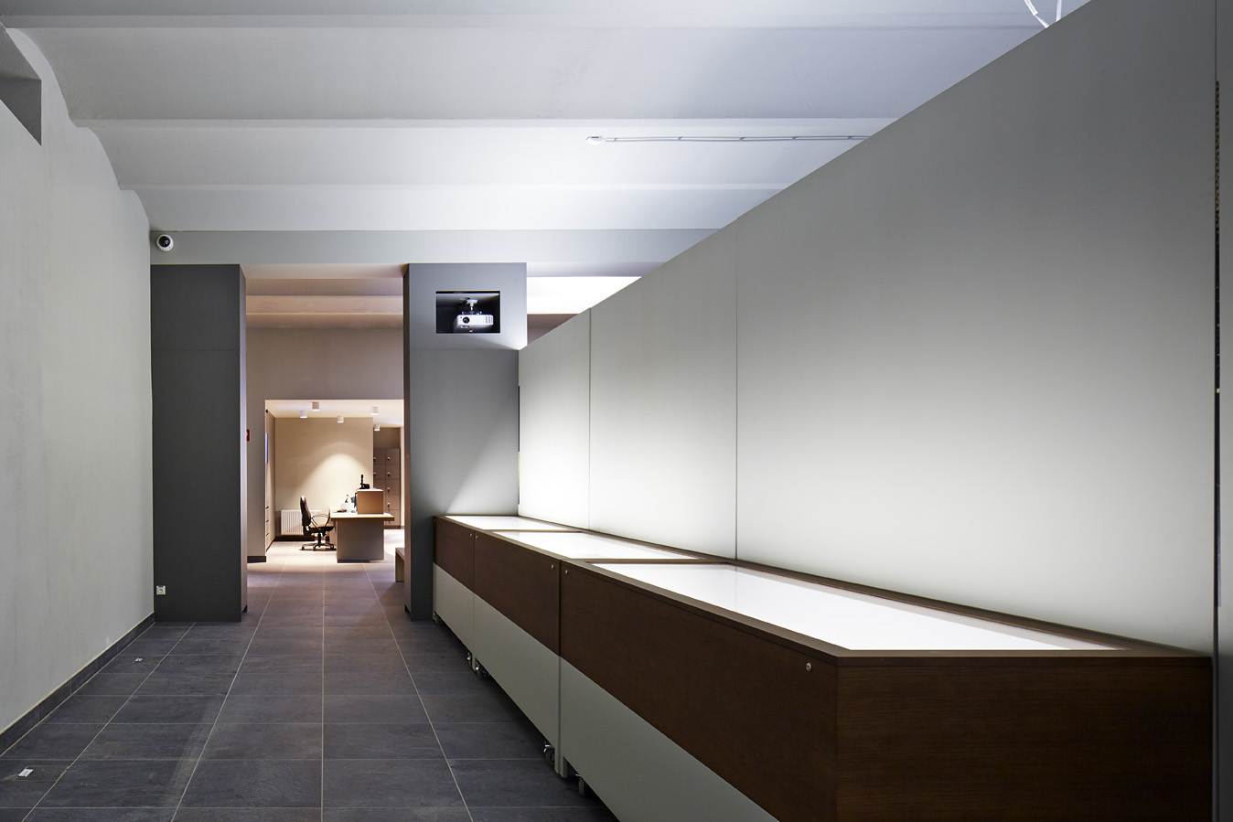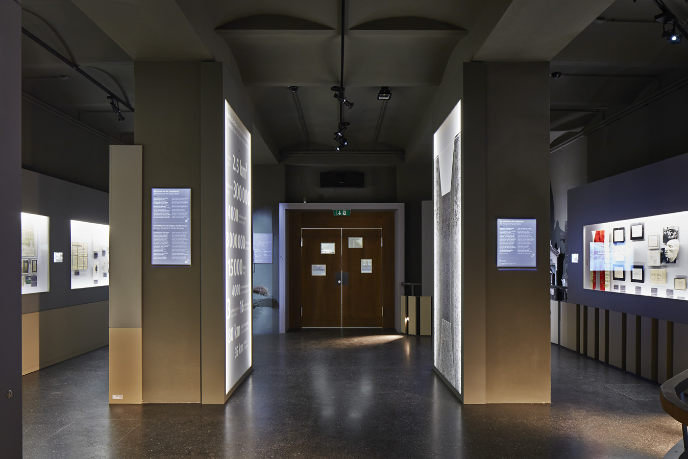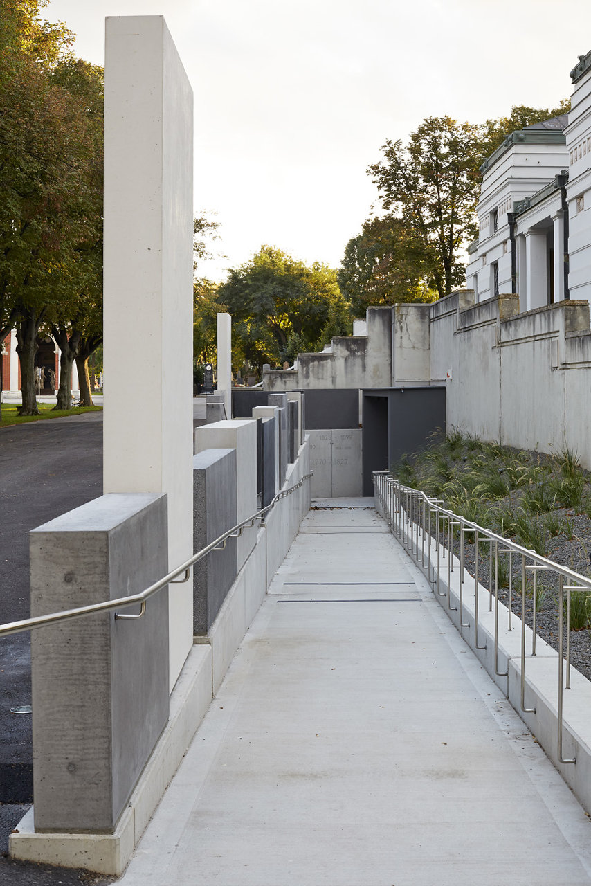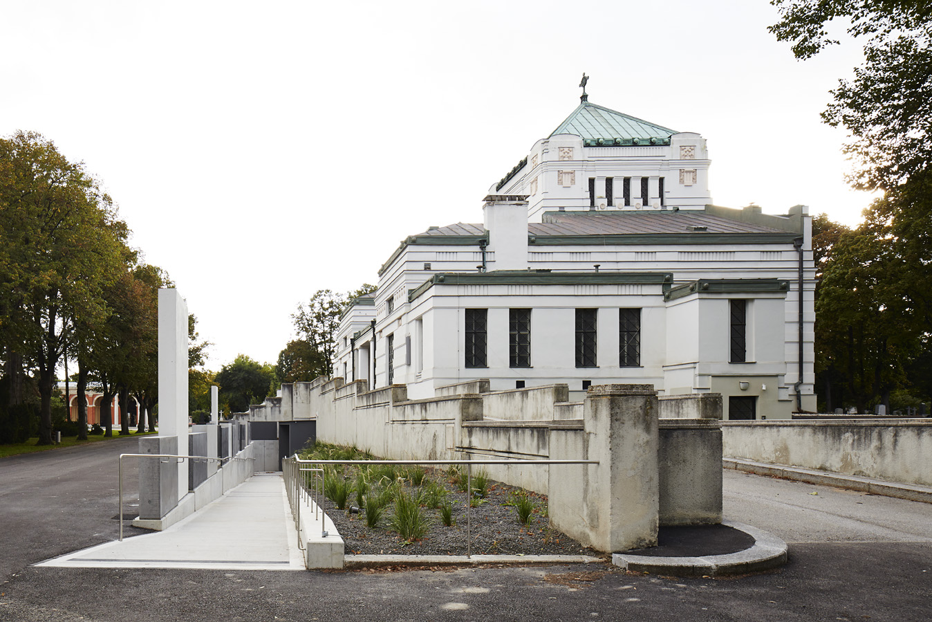 Das Bestattungsmuseum Wien wurde 2014 im Tiefparterre eines der bedeutendsten sakralen Jugendstilgebäude aus dem Jahre 1905 errichtet. Der Zugang zum Museum erfolgt über eine neue Rampe sowie über eine parallel zur Rampe laufenden kleinen Treppenanlage. Beide vertikalen Zugänge sind durch Stelen markiert. Diese sind sowohl Beschriftungsträger als auch neues Signal und Zeichen für den Zutritt. Die Konstruktion will sich nicht über das Bestandsgebäude hinweg setzen, aber doch sichtbar machen, dass in dem Gebäude ein neuer Inhalt implantiert wurde. Das Konzept setzt sowohl auf das Erlebnis als auch auf eine fundierte Aufarbeitung und Präsentation der Sammlung. Auf der Informationsebene werden Fakten rund um die Themen „Tod in Wien” und „Bestattung Wien” auf zeitgemäße Weise vermittelt.Besucher „schweben” auf einem Steg ca. 40cm über den Ausstellungsobjekten und begehen den Weg des vorgegebenen Erzählungsstranges. Die Präsentationsmöbel in der Ausstellung (mit eingelassenen Vitrinen) passen sich dem jeweiligen Verwendungszweck an. Sie können bei Bedarf über den Handlauf des Stegs ragen oder sogar zum Handlauf des Stegs werden. (Text: Architekt)