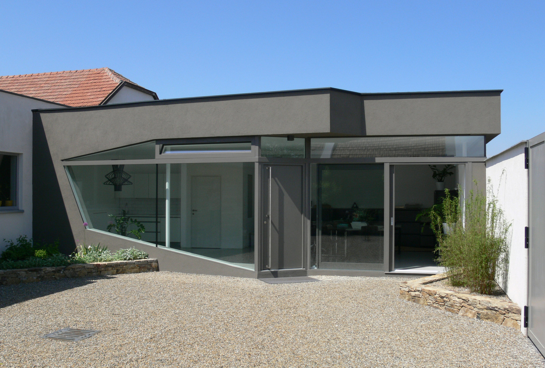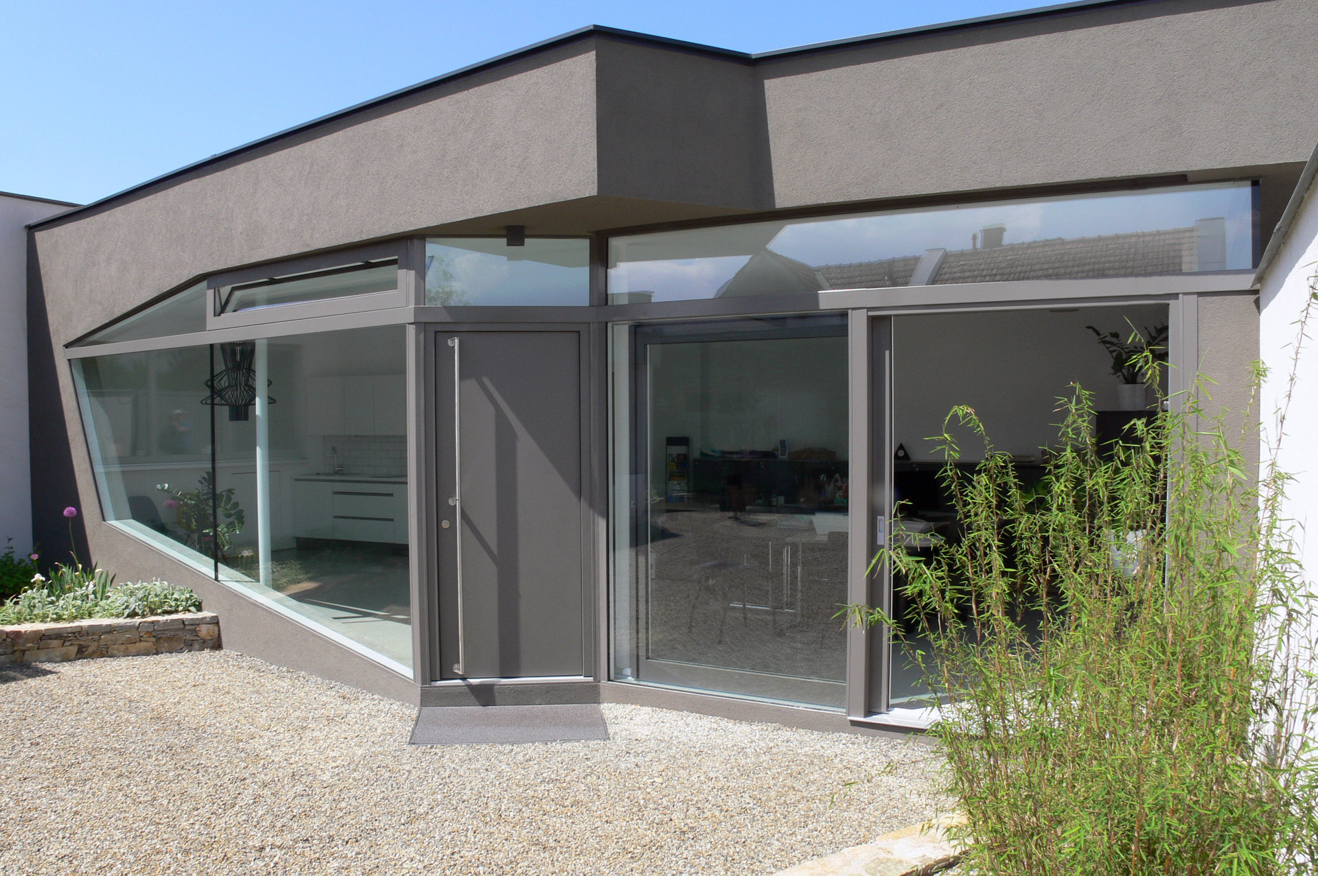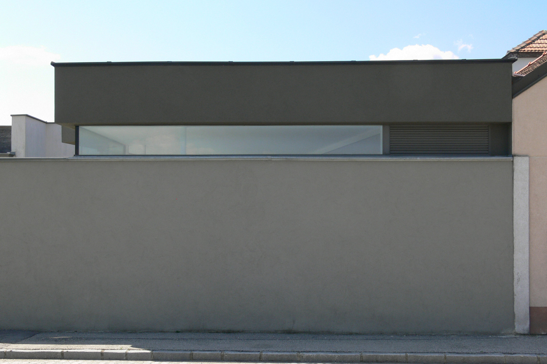 Der Arbeitsraum öffnet sich vollständig zum Hof, das Schiebeelement erlaubt ein Arbeiten im Freien. Nach Süden, zum Wohnhaus hin zieht die Fassade nach oben an und geht in die Attika über, die sich zum Eingang hin vertieft, das Vordach bildet und straßenseitig das Fensterband über der Einfriedungsmauer betont.