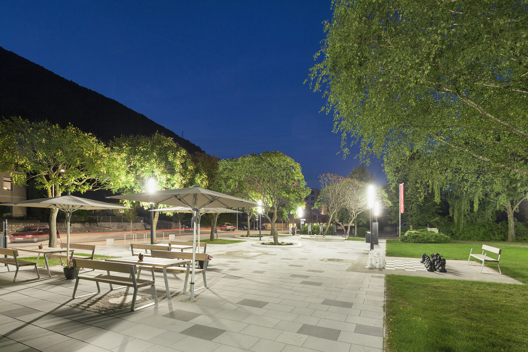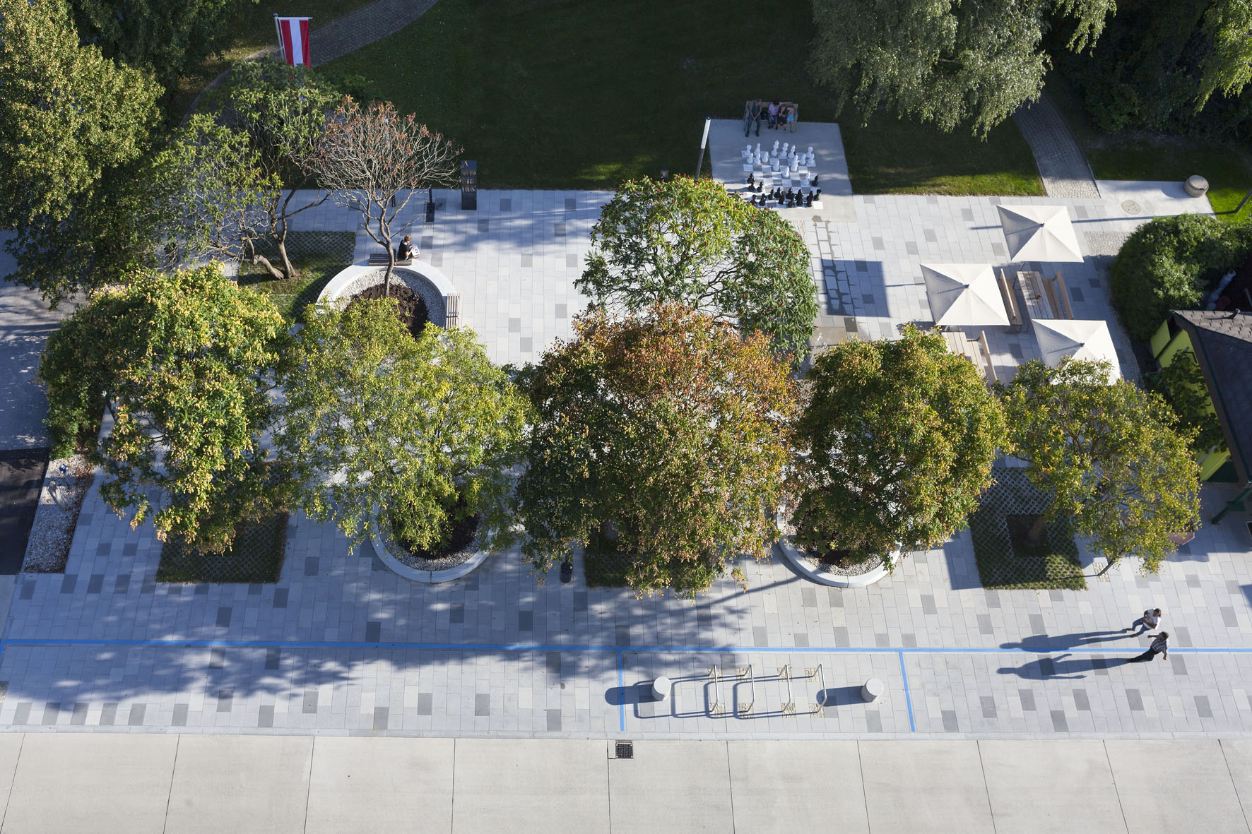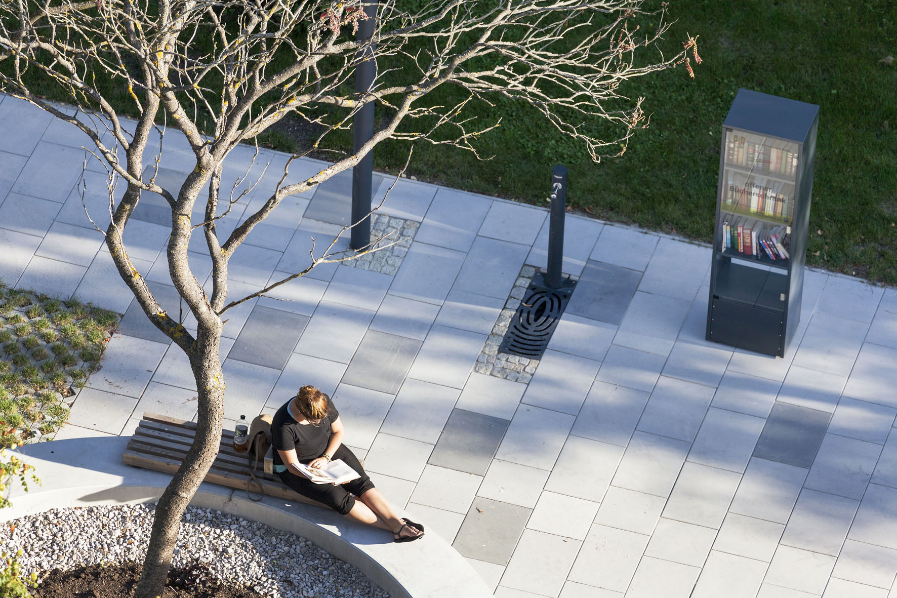 Die Stadtmöblierung wird sorgfältig aufeinander abgestimmt. Sie umfasst Infotafeln, Schirme, Sitzbänke, Tische, Abfalleimer, Aschenbecher und Fahrradständer. WLAN, eine E-Tankstelle, Wasser- und Stromanschlüsse, Leerverrohrung für Breitband-Internet, ein Wasserspiel, ein Schachspiel, ein Trinkbrunnen und ein offener Bücherschrank ergänzen das vielfältige Angebot. (Text: Architekt)