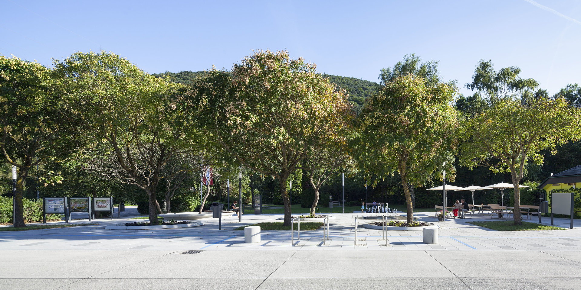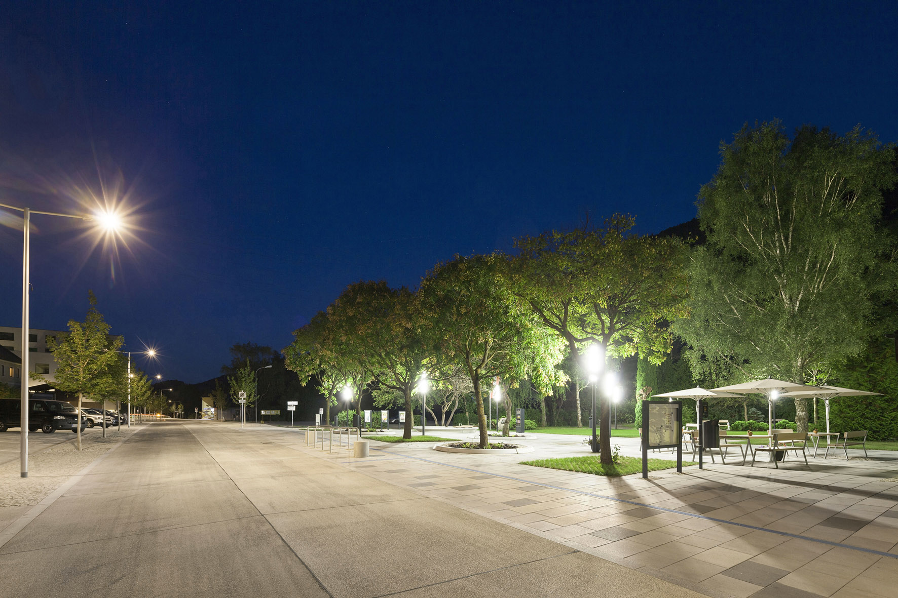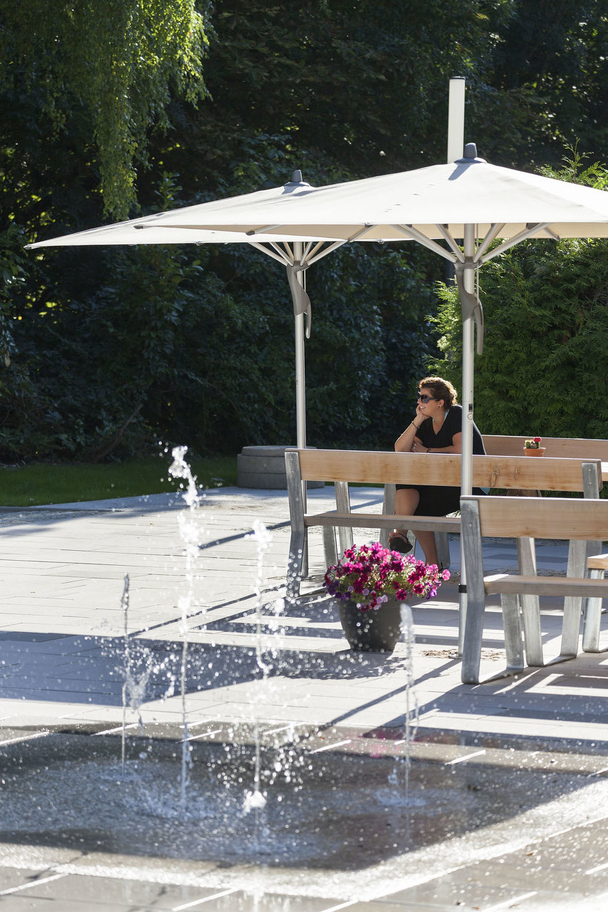 Die Stadtmöblierung wird sorgfältig aufeinander abgestimmt. Sie umfasst Infotafeln, Schirme, Sitzbänke, Tische, Abfalleimer, Aschenbecher und Fahrradständer. WLAN, eine E-Tankstelle, Wasser- und Stromanschlüsse, Leerverrohrung für Breitband-Internet, ein Wasserspiel, ein Schachspiel, ein Trinkbrunnen und ein offener Bücherschrank ergänzen das vielfältige Angebot. (Text: Architekt)