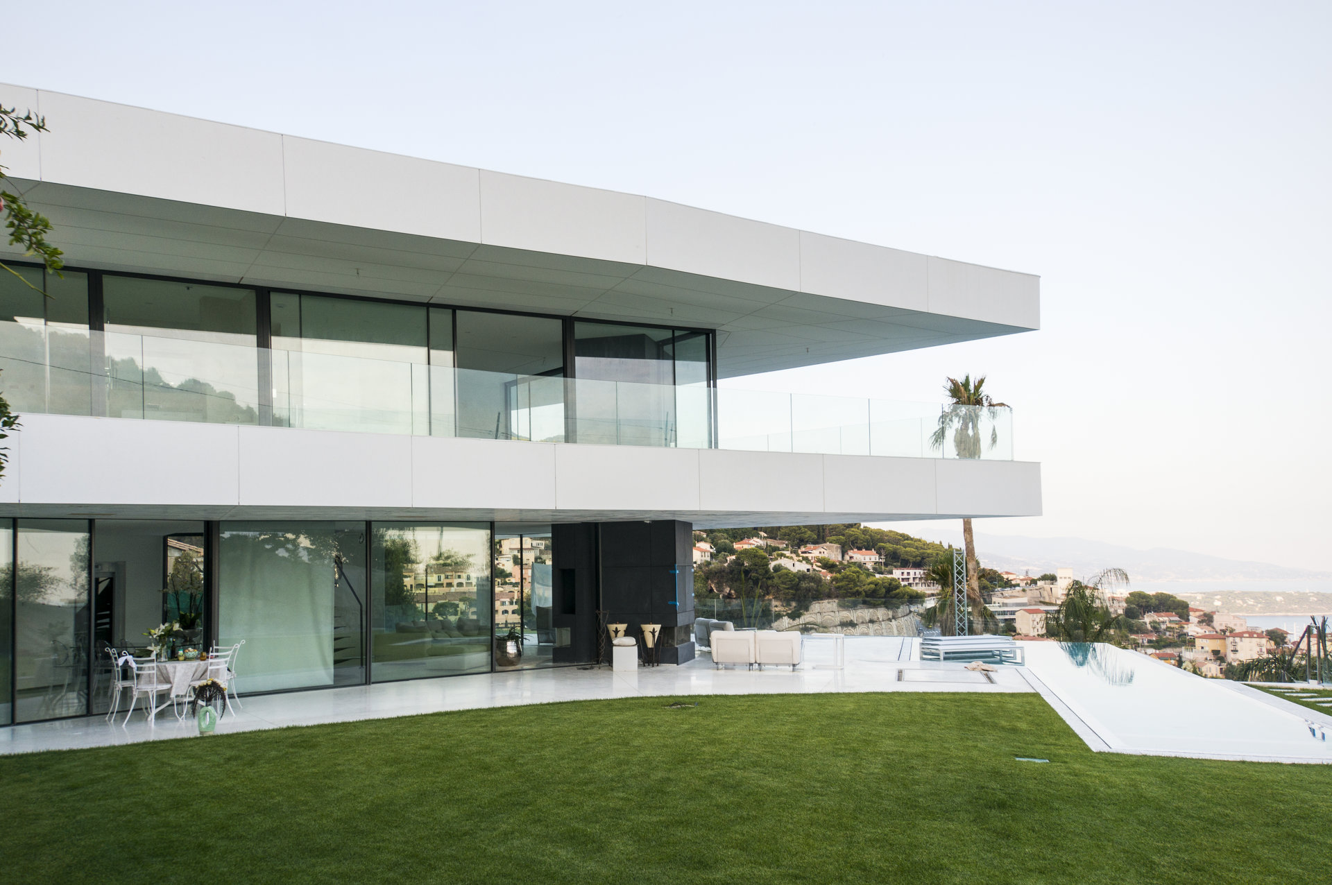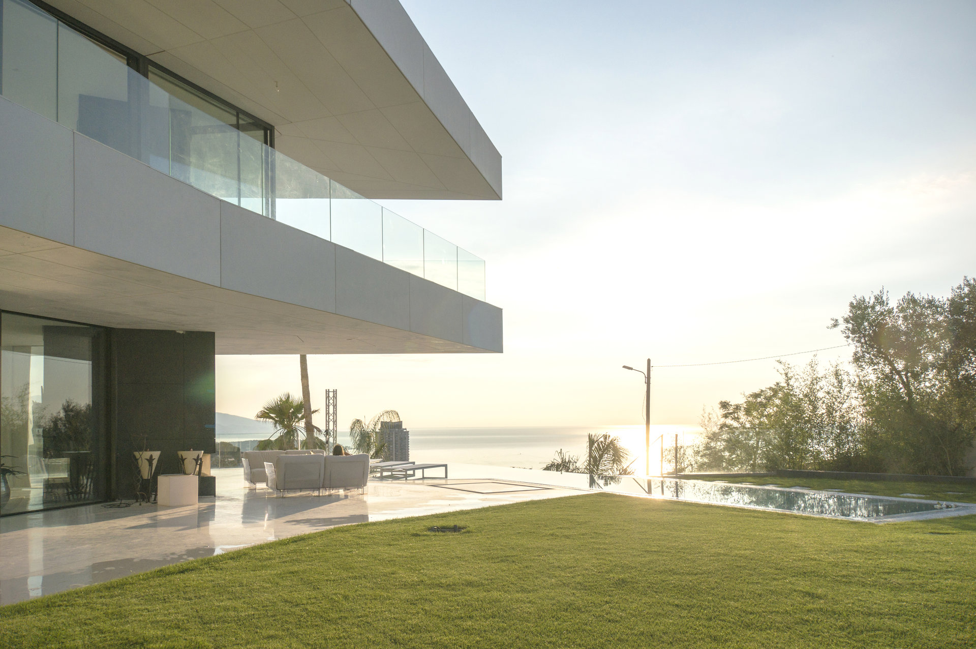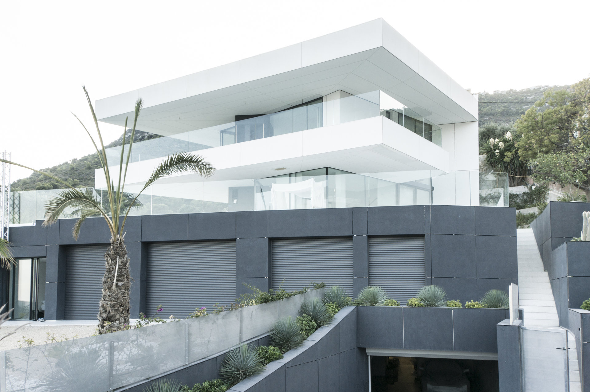 Beim Umschreiten des Hauses eröffnen sich auf jeder Seite eine andere Ansicht, so zeigt sich die Villa von Süden bis Südosten in ihrem ganzen Ausmaß von der Garagenebene über das mit schwarzen Equitone Platten verkleidete Mezzaningeschoss bis zu ihrem krönenden, mit weißen Fiber C Platten verkleideten Haupthaus. Im Nordosten besticht die doppeltgeschossige Veglasung hinter der Frühstücksterrasse, der Norden beschreibt die Rückseite des Hauses mit eher geschlossener Fassade und der von Westen bis Südwesten dominieren die horizontalen Terrassenflächen mit Gartengeschoss und Pool. Die Außenanlagen und Abtreppungen der Stützmauern sind mit mediterranen Bepflanzungen versehen, eine Gartenküche und Gästetoiletten mit Gartendusche komplettieren das reich ausgestattete Anwesen. (Text: Marion Kuzmany)