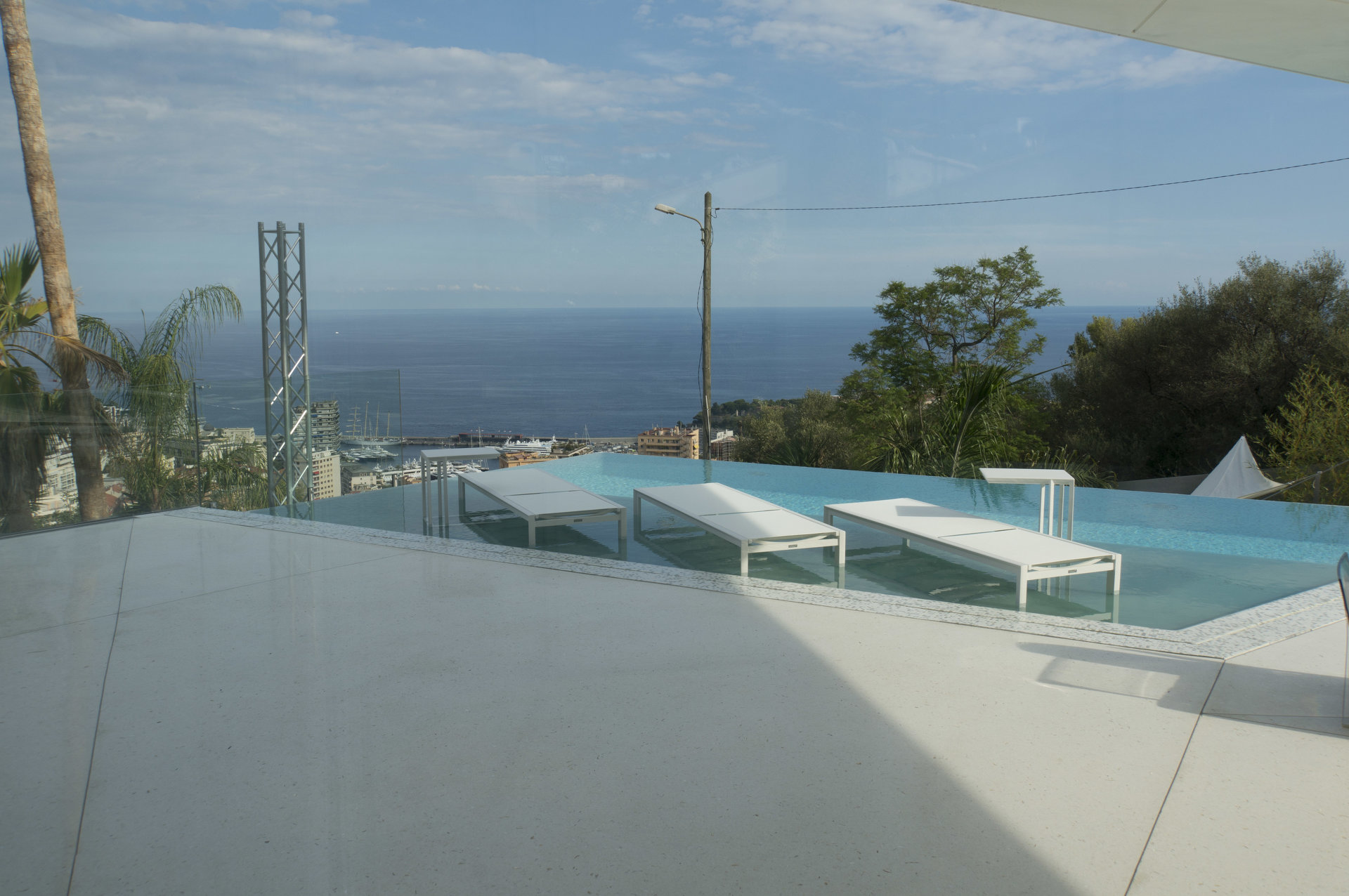 Die Wohnräume sind durch Glasschiebeelemente öffenbar und verbinden den Innen- und Außenraum sowohl am Boden und an der Decke schwellenfrei und übergangslos. Dabei verschmelzen der Innenraum und die überdeckte Terrassenfläche zu einer einheitlichen Wohnfläche. Als zentrales Element gilt der über zwei Geschosse reichende Kaminblock. Dieser kann durch die Glaschiebetüren im Erdgeschoss freigestellt werden und ist in beiden Geschossen sowohl von innen als auch von außen benutzbar, wodurch der Effekt des „Wohnzimmes im Freien“ zusätzlich hervorgehoben wird. Hier befindet sich das Herzstück des Villa und der Ausgangspunkt der Entwurfsidee, die auf dem ursprünglichen Wunsch des Bauherren basiert. Vor dem Außenkamin befindet sich eine Sitzgruppe und davor ein Pool mit Infinitykante, die den Sitzenden Blick über die Wasserkante hinweg über den Horizont am Meer mit all seiner phantastischen Farbenpracht gewährt. Dem Stehenden eröffnet sich ein prächtiger Blick über den Hafen von Monaco. Der Pool besteht aus einem 16 m langen Schwimmbereich und einem kleineren seichten Bereich mit Glasplattform, die mit einer Hebeanlage in drei Positionen gebracht werden kann: mit 10 cm Wassertiefe für Liegestühle im Wasser, in gleiche Ebene mit der Terrasse als Tanzfläche und in 10 cm über dem Wasserspiegel als Podium für etwa eine Musikgruppe. Neben dem Pool ist eine versenkbare Bar in die Bodenfläche eingeschnitten, deren integrierter Kühlschrank im Mezzaningeschoss bestückt werden kann und mithilfe einer Hubscherenanlage auf Knopfdruck ausgefahren wird. Die mit Muscheleinstreuungen versehene Terrazzo-Bodenfläche, die sämtliche Böden im ganzen Haus alle Außenanlagen bedeckt, wird zur Baroberfläche.