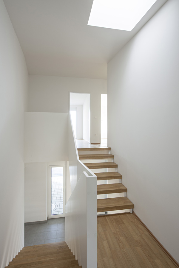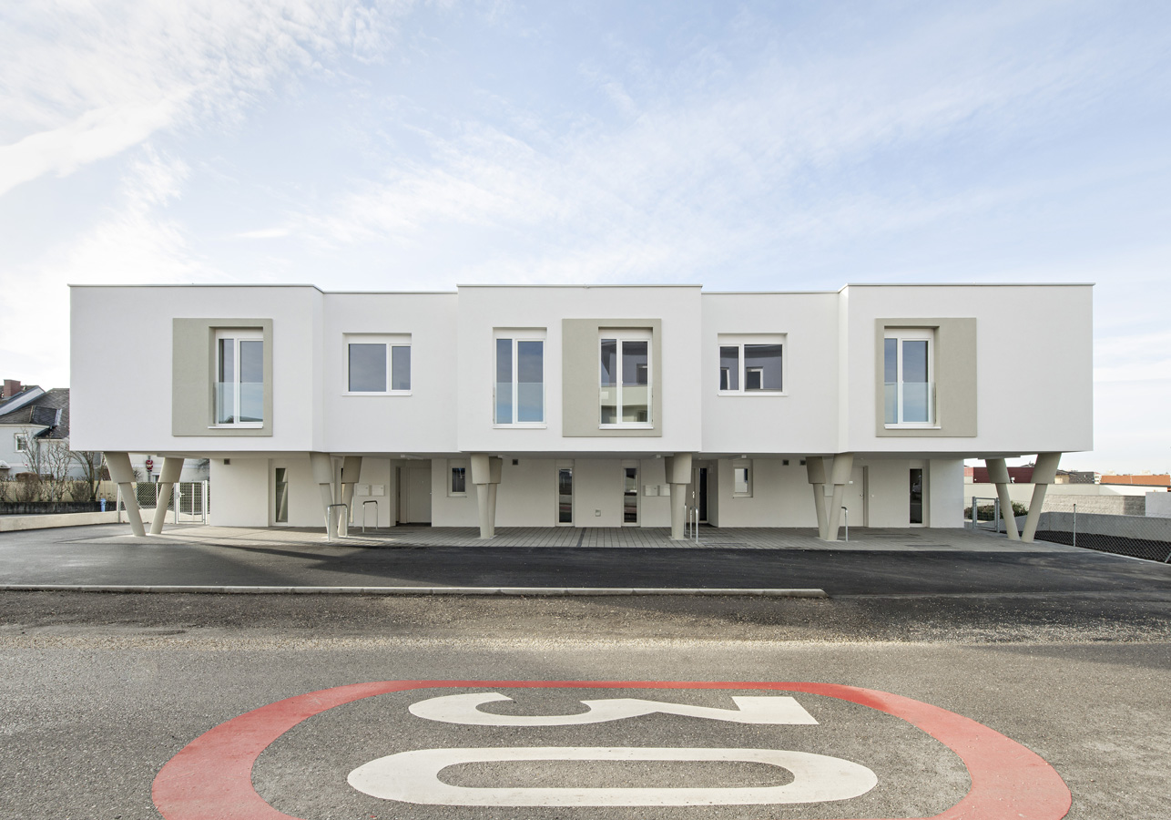 Die Gebäude sind massiv in Ziegelbauweise mit Stahlbetondecken errichtet. Vollwärmeschutz, Luft-Wärmepumpe, Wohnraumlüftungsanlage und Fußbodenheizung ergeben den Wohnkomfort der Niedrigenergiehäuser. (Text: Architekt:innen)