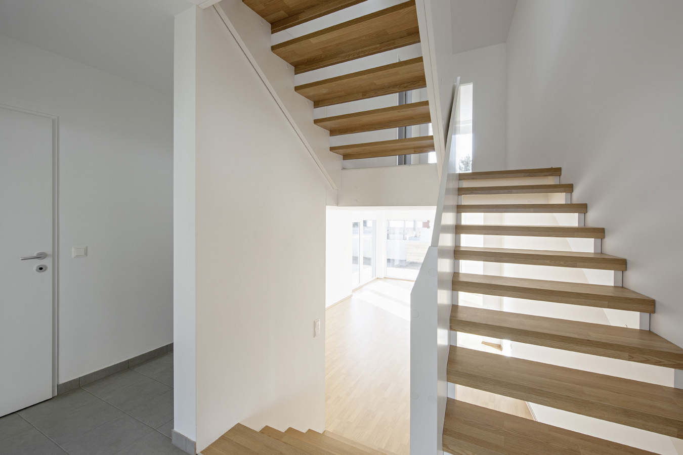 Die jeweils zwei Häuser trennende schräg verlaufende Wand findet sich in der Ansicht der Häuser wieder. Vom parkenden Auto geht es ein halbes Geschoß tiefer in die Wohnküche und - je nach Haus - ein halbes Geschoß höher zu Kinder- oder Elternzimmer.