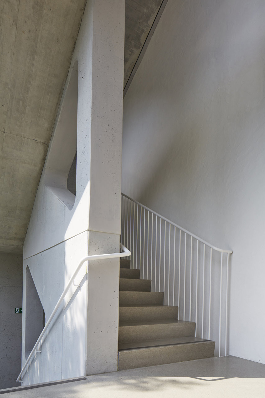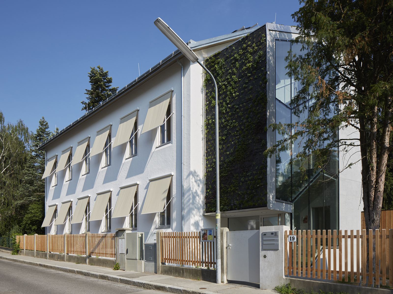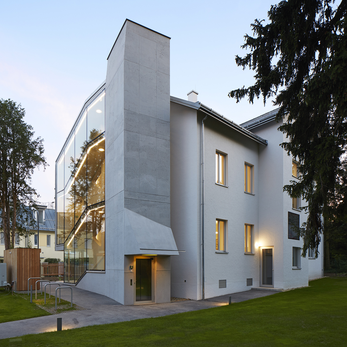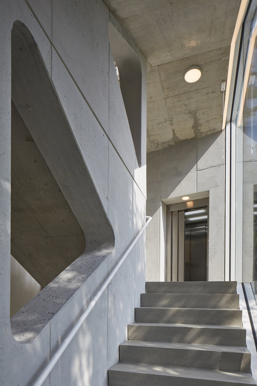 Das neue Stiegenhaus ist ein eigenständiger Baukörper im Osten an der Giebelfassade und ermöglicht eine funktional gute Erschließung der Innenräume. Der Aufzugsturm und die Dachkonstruktion sind aus Dämm-Leichtbeton errichtet, der Treppenlauf und die Podeste aus Stahlbeton. Die gesamte Ostfassade ist eine Nurglas-Konstruktion und das Dach sowie die Südfassade sind begrünt.