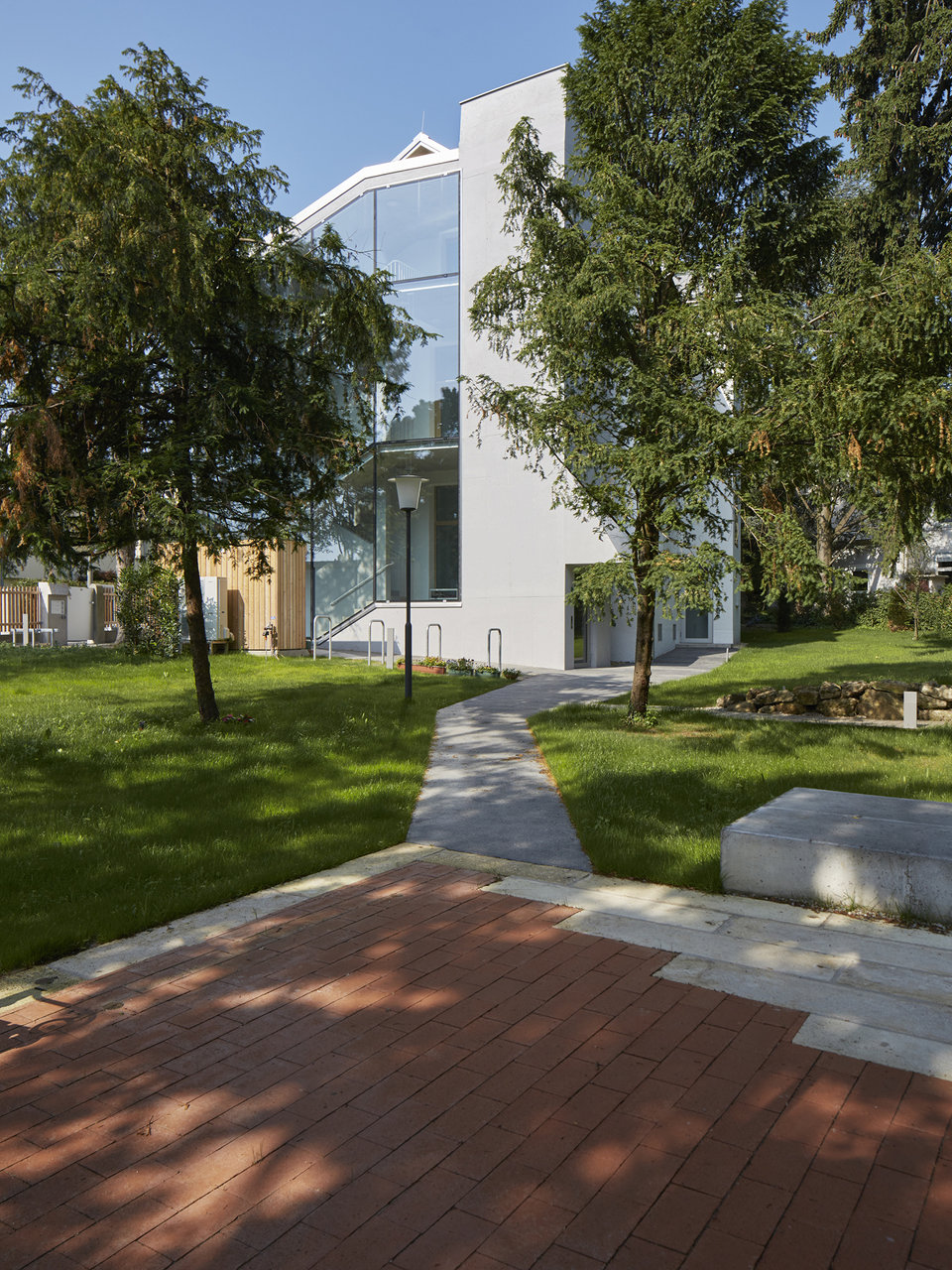 Den Zubau wurde als monolithischer, skulpturaler Baukörper konzipiert, der sich vollständig nach Osten hin öffnet. Eingefasst durch einen formgebenden Rahmen, ergibt sich zum Garten ein überwältigender Blick. Von Innen wird das Hinauf- und Hinunterschreiten im Treppenhaus als ein Weg durch die Bäume im Garten hinweg erlebt. Von Außen gesehen, hat man den Eindruck von einem „aufgeschnittenen“ Haus, ähnlich einem Puppenhaus, das von kleinen und großen Menschen durchstiegen wird und so die Lebendigkeit des Gebäudes sichtbar macht.