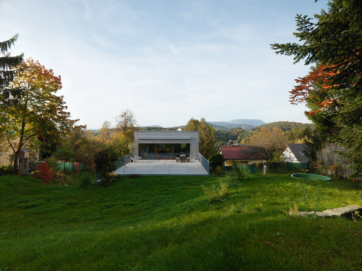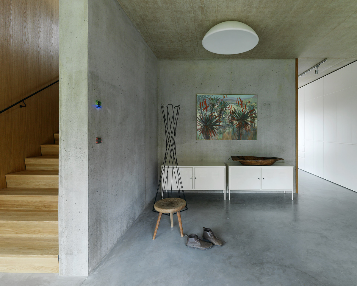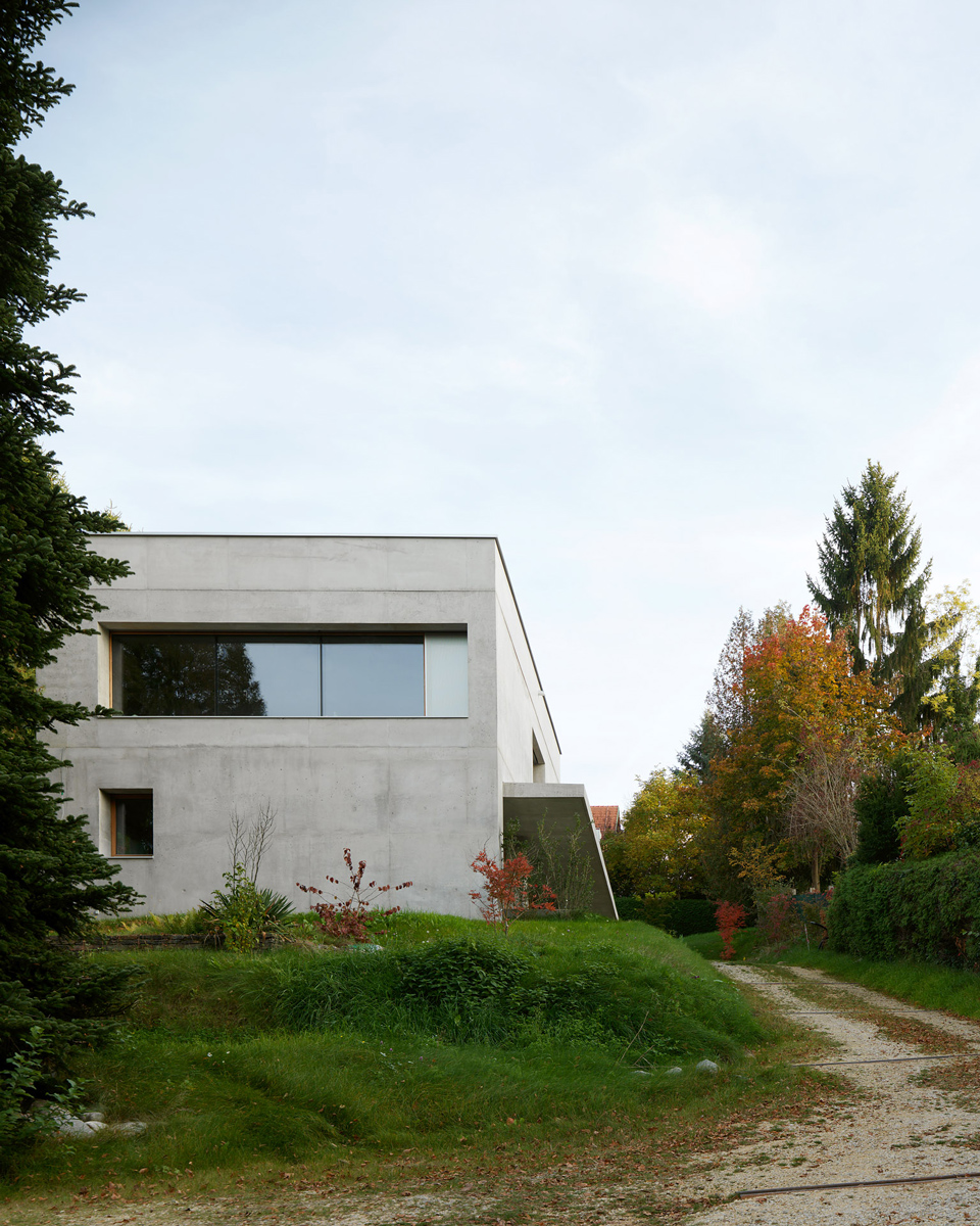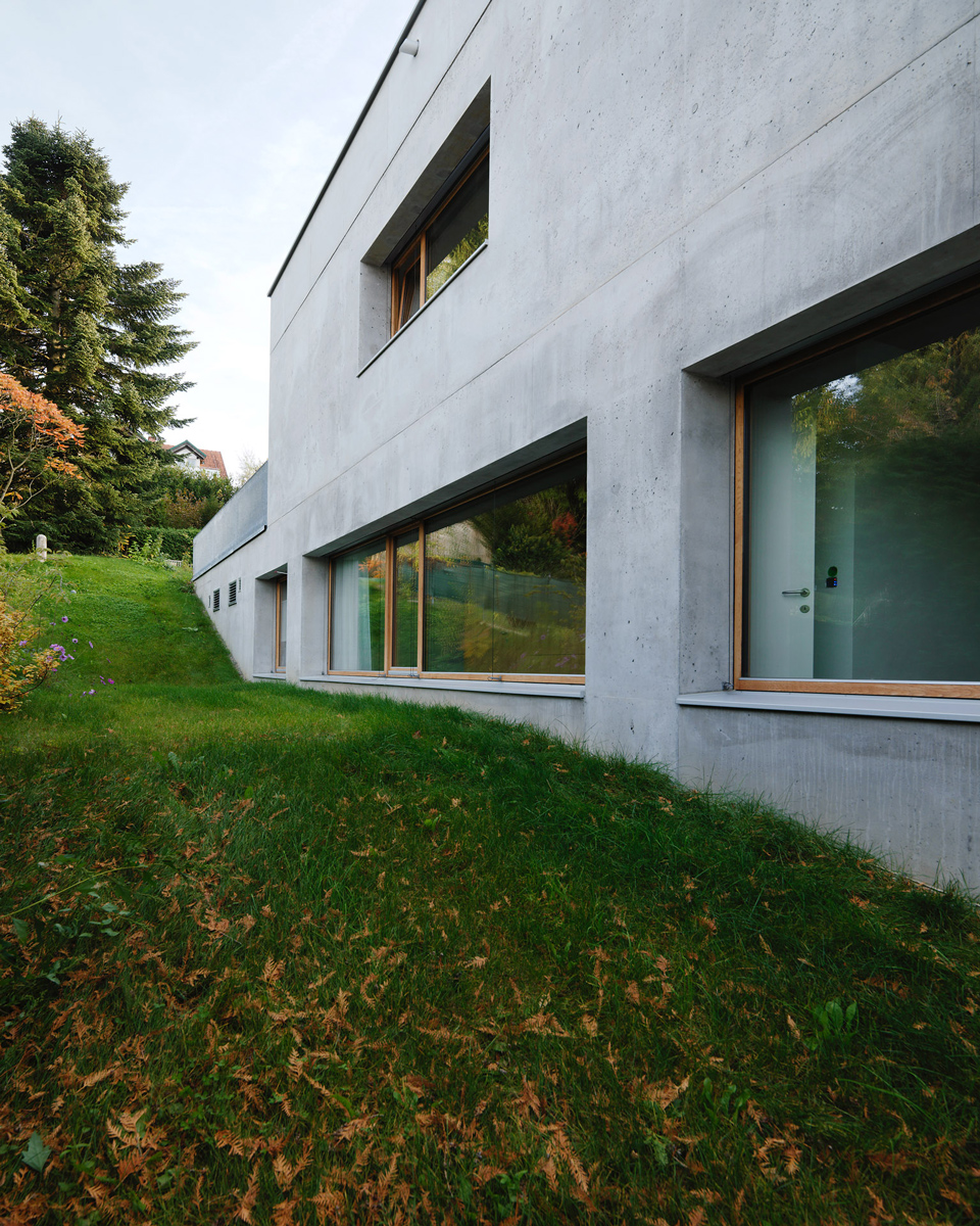 Das Wohnhaus ist zentral am langgestreckten Hanggrundstück situiert. Über einen Feldweg erreicht man den westseitigen Vorplatz. Eine 20 m lange Veranda schützt - großzügig überdacht - den zentralen Eingangsbereich sowie die bodentiefen Westverglasungen. Um einen zentralen Stiegenkern mit Garderobe und Versorgungsräumen sind symmetrisch vier gleich große Räume erschlossen. Zwei Kinderzimmer im Westen, Schlafzimmer und Bad im Osten. Raumhohe Schrankwände bieten viel Stauraum und gewährleisten freie und sparsame Zimmermöblierungen. Eine zusätzliche Einliegerwohnung erweitert das Nutzungsspektrum für zukünftige Familienentwicklungen.