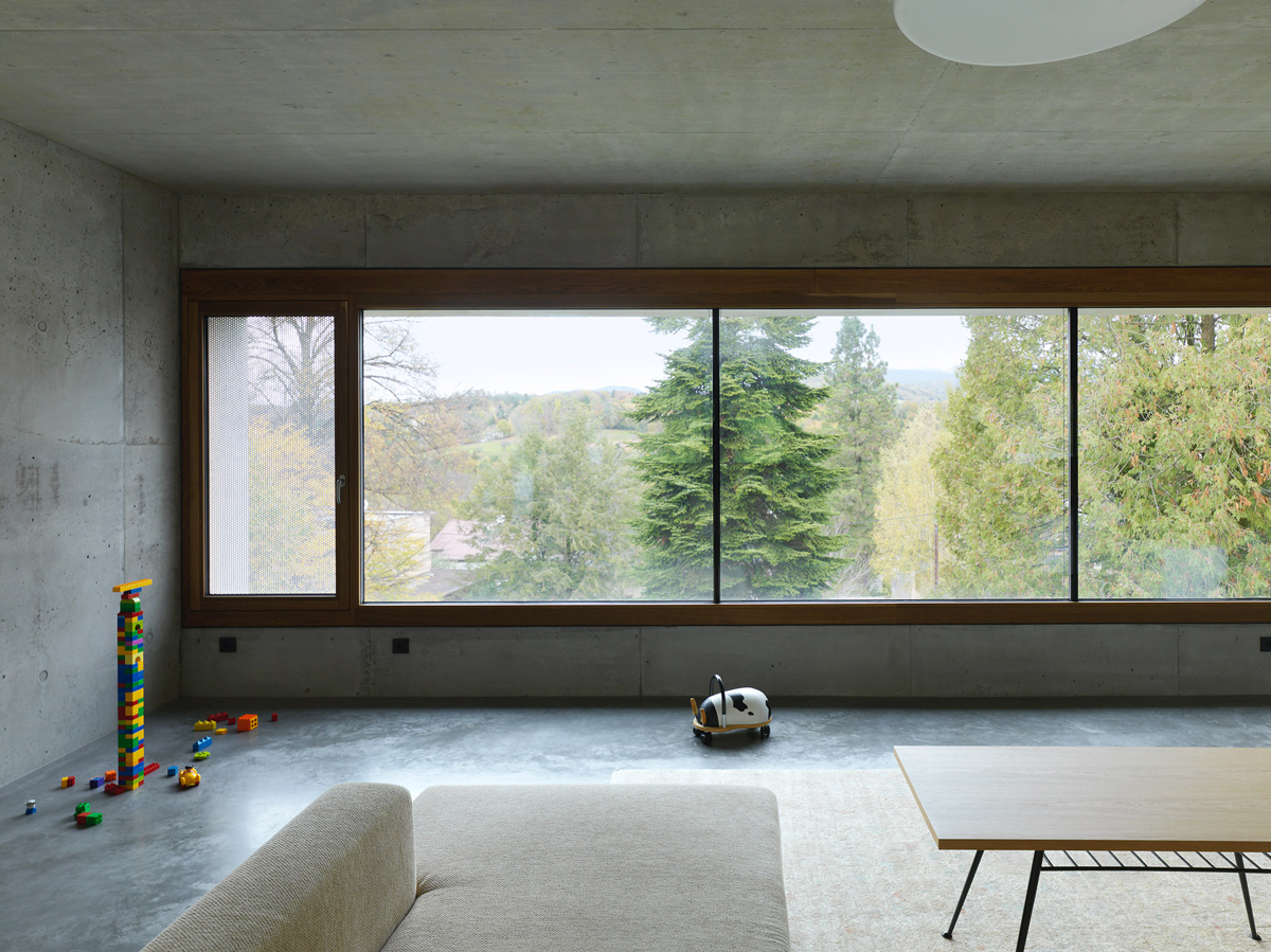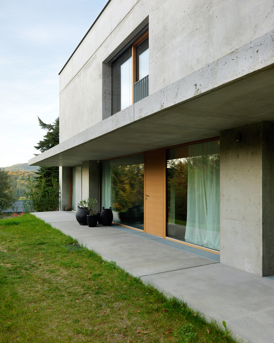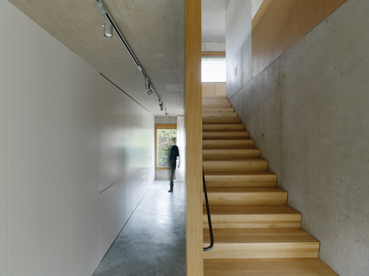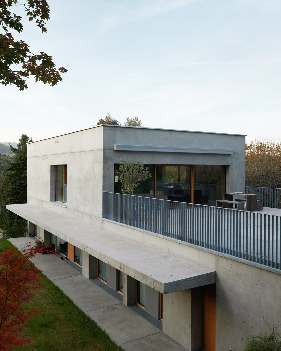 Das Wohnhaus ist zentral am langgestreckten Hanggrundstück situiert. Über einen Feldweg erreicht man den westseitigen Vorplatz. Eine 20 m lange Veranda schützt - großzügig überdacht - den zentralen Eingangsbereich sowie die bodentiefen Westverglasungen. Um einen zentralen Stiegenkern mit Garderobe und Versorgungsräumen sind symmetrisch vier gleich große Räume erschlossen. Zwei Kinderzimmer im Westen, Schlafzimmer und Bad im Osten. Raumhohe Schrankwände bieten viel Stauraum und gewährleisten freie und sparsame Zimmermöblierungen. Eine zusätzliche Einliegerwohnung erweitert das Nutzungsspektrum für zukünftige Familienentwicklungen.