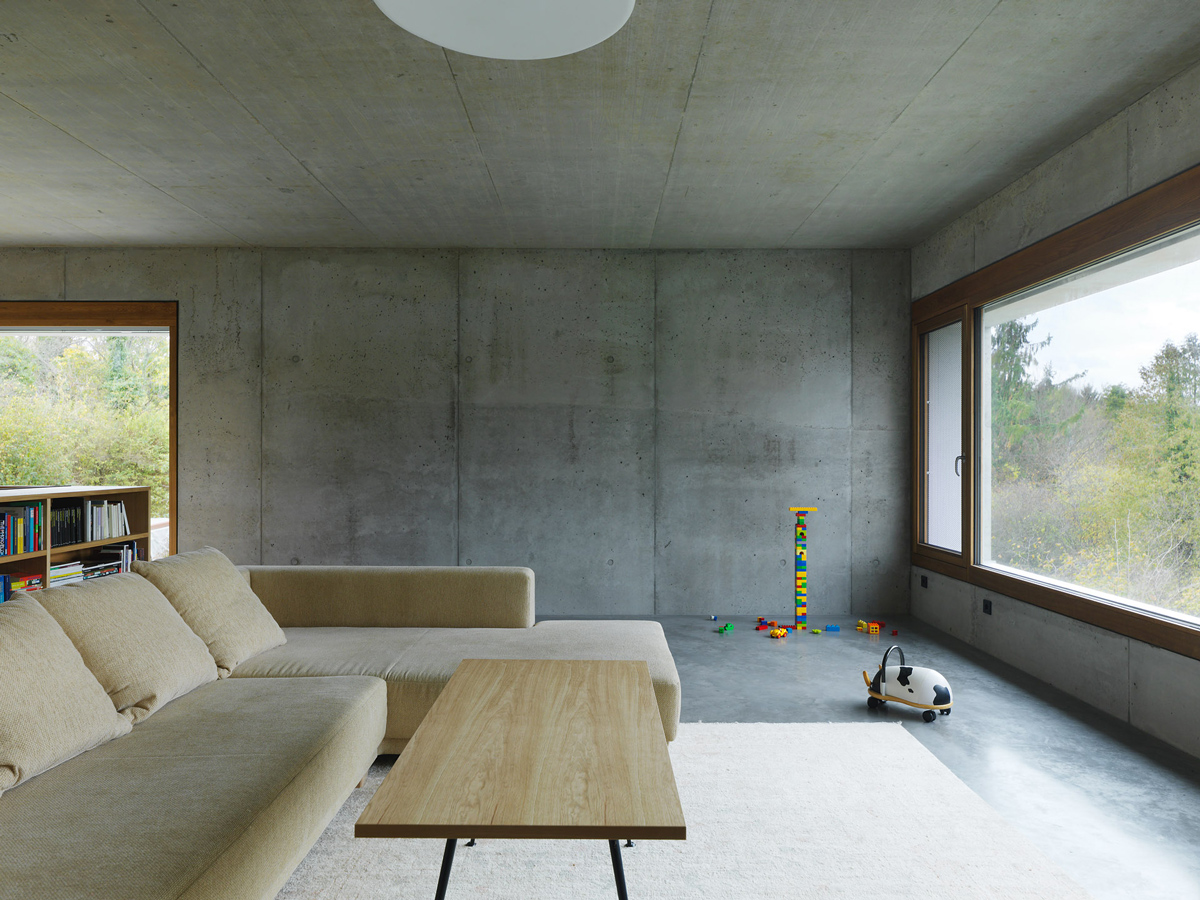 Die monolithische Wand nützt die wärmedämmenden Eigenschaften des Blähton-Zuschlagstoffes und sorgt durch die speicherwirksamen Masse für hohen Wohnkomfort. Der über natürliche Holzfaserdämmstoffe entkoppelte Heizestrich sowie eine zusätzliche Betonkernaktivierung im Deckenbereich als Niedertemperaturheizsystem wird versorgt von einer Luft-Wärmepumpe.