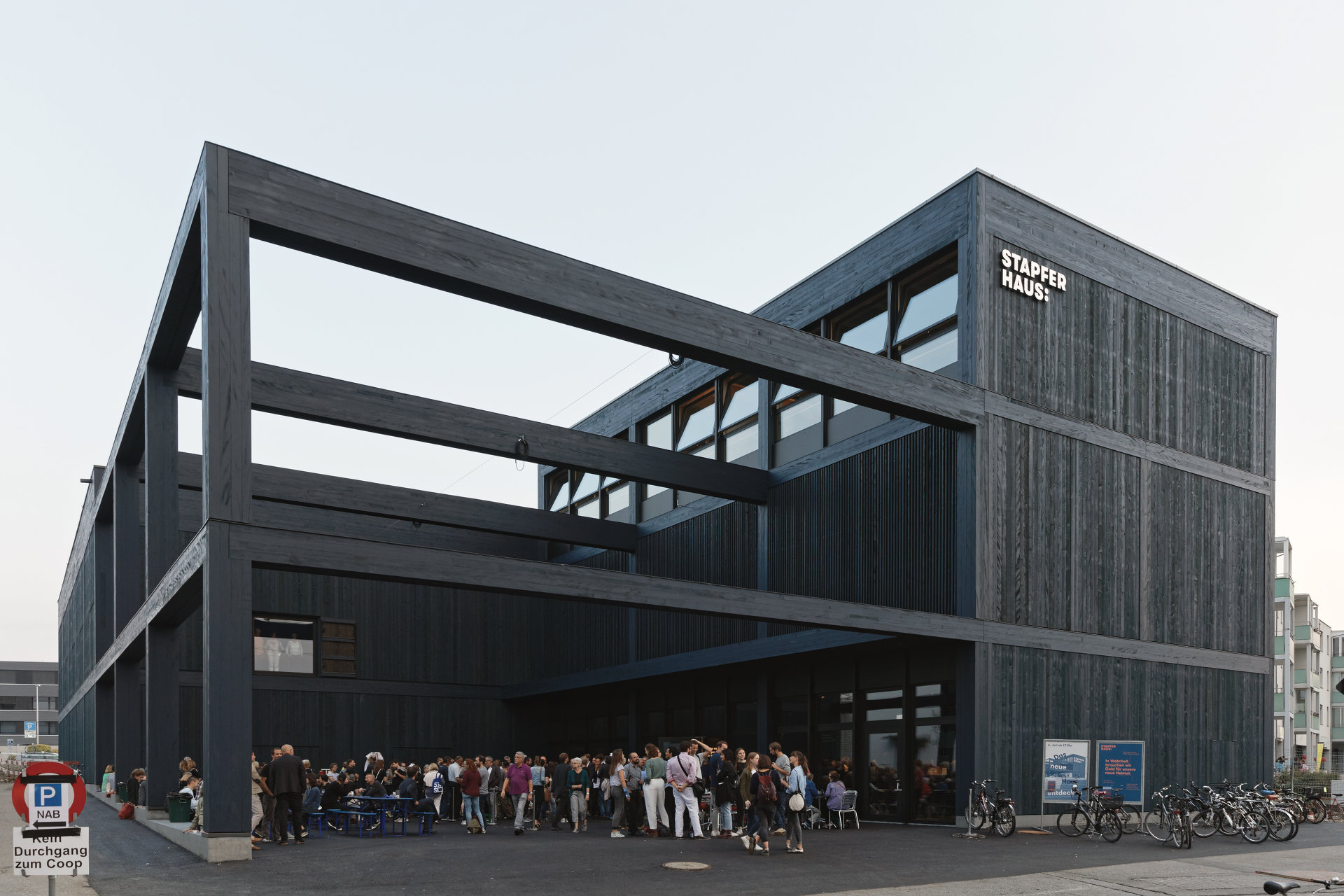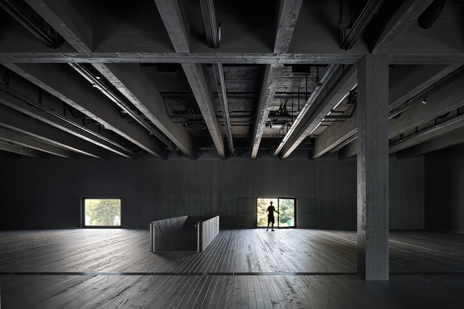 Der blau schwarze Holzbau weist mit seiner klar lesbaren Struktur auf die grossen Räume im Innern hin. Die innovative Holzbautechnologie, verbunden mit einer duldsamen Holzkonstruktion in Bezug auf technische Bearbeitung und verschiedenste Oberflächenbehandlungen, ermöglicht eine Fülle an szenografischen Interventionen in den Innenräumen und macht selbst die Aussenhülle für Ausstellungszwecke bespielbar. Dank effizienter Wärmeerzeugung und einer guten Gebäudehülle können die Betriebskosten niedrig gehalten werden. Die einfache und nachhaltige Bauweise verschafft dem Haus einen zeitgemässen Auftritt und setzt gleichermassen einen neuen Akzent im neuen Bahnhofsareal. (Text: Architekten)