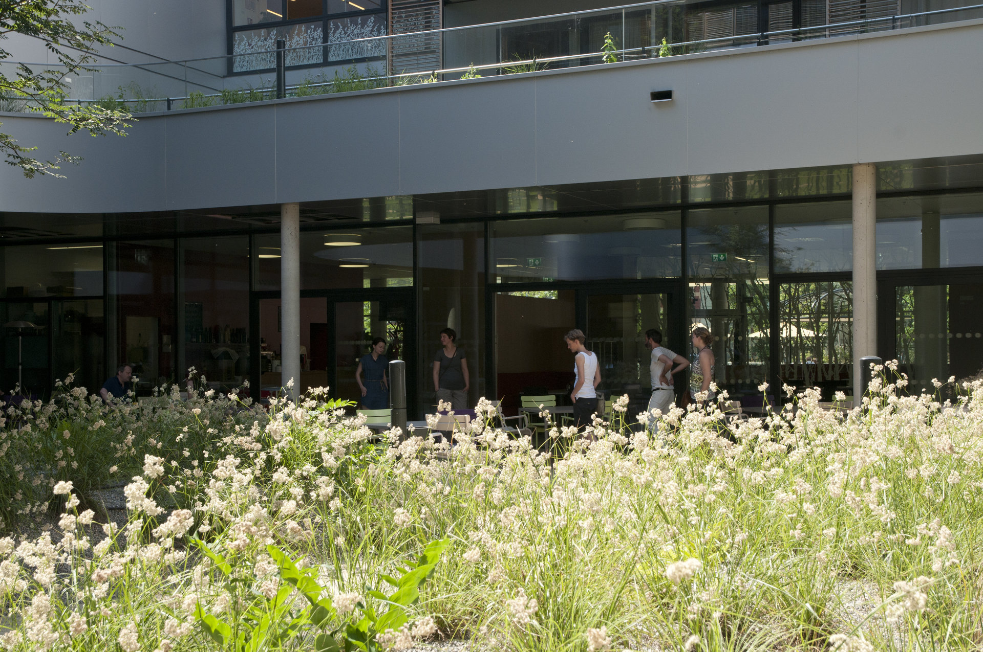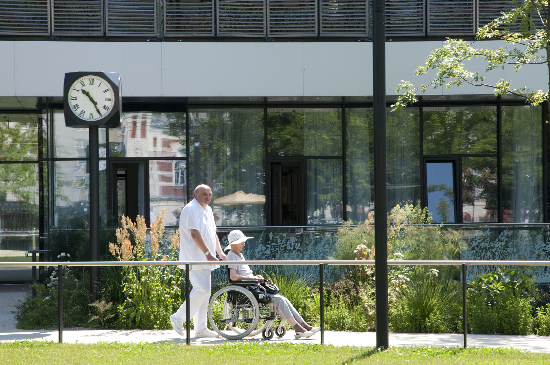Das Herzstück der Außenanlage bildet der zentral gelegene Allgemeingarten mit Rasenflächen, raumgreifendem Altbaumbestand und wegbegleitenden Wildstauden und Gräserbeeten. Die Pflanzen sollen durch Farbe, Duft, Geschmack, Geräusch und Tasterlebnis assoziative Gedächtnisspuren aktivieren und das Beobachten der Jahreszeiten ermöglichen. Der Garten lädt durch eine fließend verlaufende Parkwegestruktur und akzentuierende Zielpunkte zum Erkunden und Spazieren ein, etwa zur gedeckten Terrasse mit freier Möblierung, zu einem Seerosenteich mit Fischbestand und zwei markanten Pergolen in Form großer Volieren. Die Idee der Vogelschaukäfige, Elemente der historischen Geriatrieanstalt, wird formal aufgegriffen und funktional neu interpretiert: Die berankten Metallgerüste werden zu beschatteten Aufenthaltsräume im Freien. Entlang den barrierefrei geführten, farbasphaltierten Wegschleifen, die Orientierung und spannende Sichtbezüge schaffen, reihen sich abschnittsweise Sitzbänke und bieten wegbegleitende Raststellen. Der Freiraum nimmt auf einer abgesenkten Geländestufe im Randbereich des Parks den Außenraum des benachbarten Kindergartens auf.