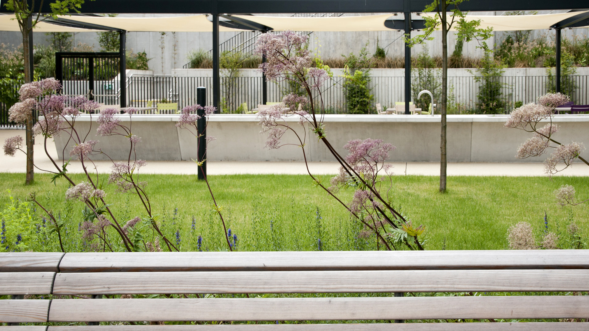 Der Therapiegarten liegt in einem windgeschützten Innenhof, der im nördlichen Bereich von der Hangwand und einer vorgelagerten Pergola begrenzt wird. Wegschleifen, Pflanzflächen und Sitzgelegenheiten schaffen abwechslungsreiche Ruhe-, Bewegungs- und Kommunikationszonen. Arbeitstische mit Wasserentnahmestellen finden in der Gartentherapie Anwendung. Die schleifenförmige Erschließungsstruktur des Demenzgartens im 1. Obergeschoß kommt dem Bewegungsdrang demenzkranker Patient:innen entgegen. Ähnlich dem Therapiegarten schaffen auch hier eine fein abgestimmte Pflanzenstruktur und gestaltete Sitzbereiche Aufenthaltsqualitäten und Atmosphäre für die betagten Bewohner:innen. (Text: Stephanie Drlik)