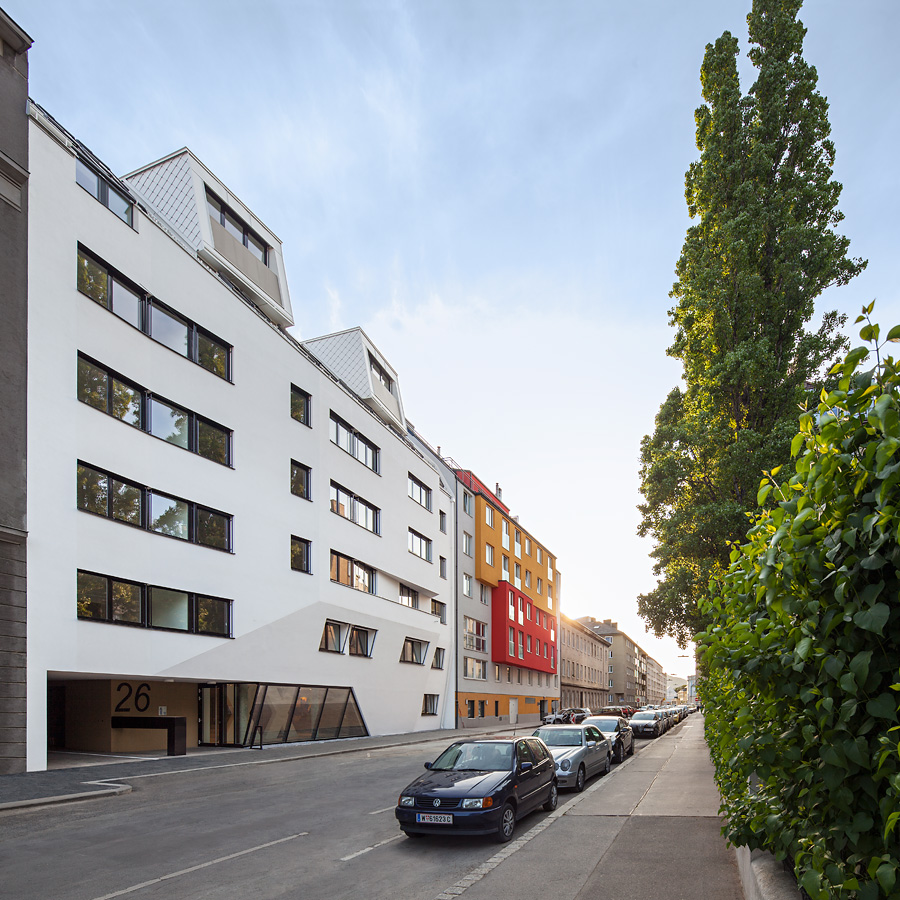 Die offen gestaltete Lobby mit dem natürlich belichteten Stiegenhaus gibt dem Gebäude an der Basis Leichtigkeit und eine den Stadtraum aufwertende Geste. Wohnen und Arbeiten unter einem Dach - das Projekt Weisselgasse als eine mögliche Antwort auf die vielfältigen Arbeitsrealitäten und neue Lebenskonzepte jenseits der traditionellen Vater-Mutter-Kind-Kleinfamilie. (Text: leicht adaptierter Text der Architekten)
