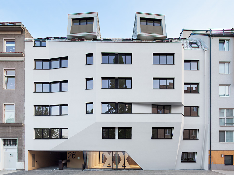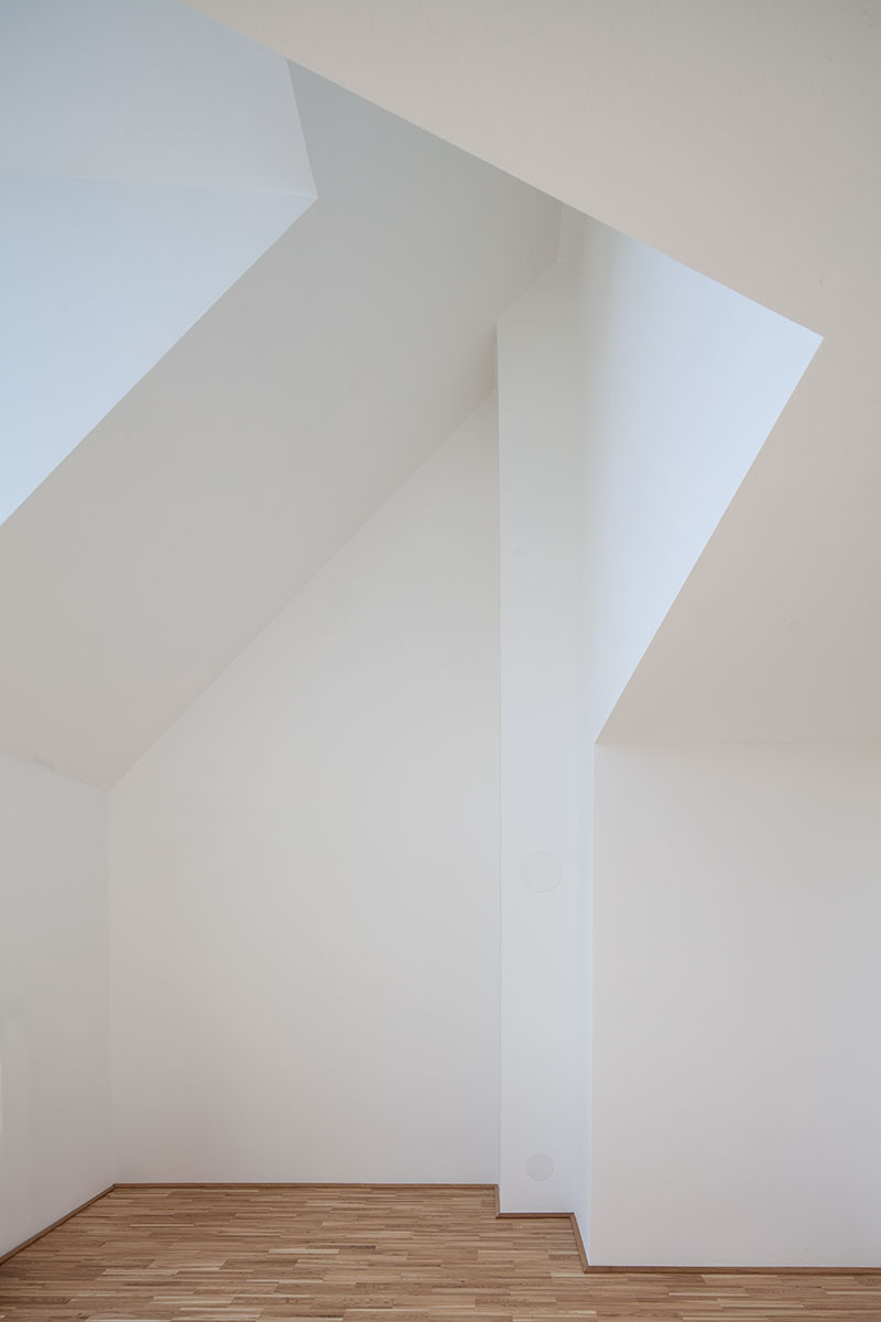 Ziel war es, den komplexen Baukörper als zusammenhängende Bauskulptur erlebbar zu machen. Dach und die Fassade erscheinen nahezu wie aus einem Guss. Unterstützt wird dieses Bild durch die Ausbildung des straßenseitigen Erkers, der sich fließend aus dem Baukörper heraus entwickelt und nahtlos ins Dach übergeht. Die zwei Gaupen der Straßenfassade stehen aus der Dachfassade hervor, wie ein über die Dächer blickendes Augenpaar.
