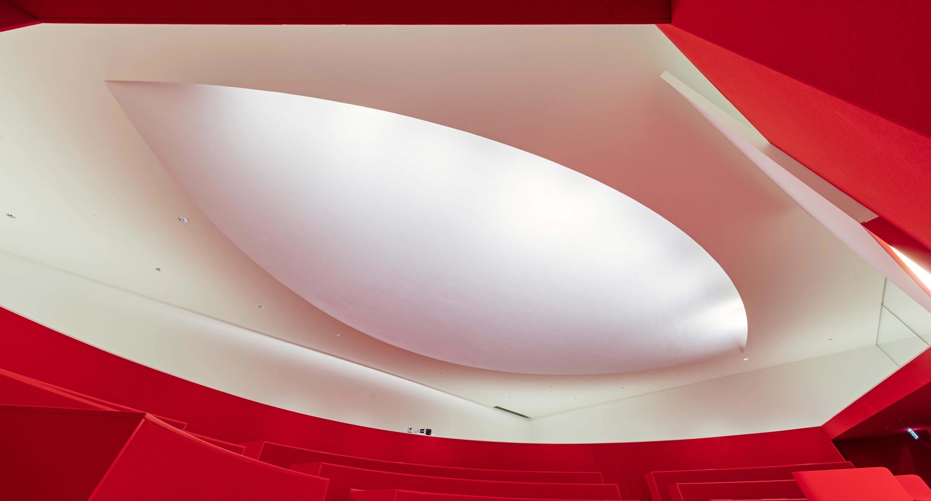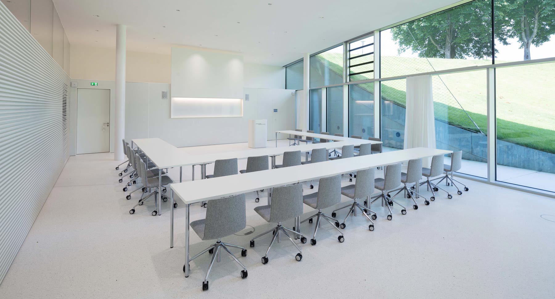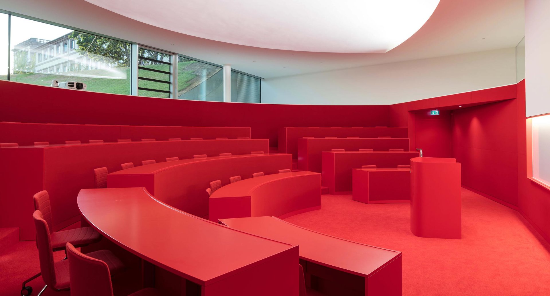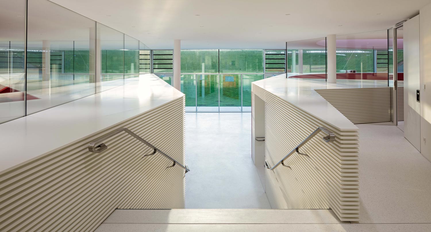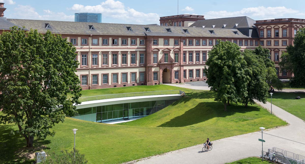 Aus dem Ehrenhof kommend betritt man das neue Hörsaalzentrum über die ehemalige Schlossküche. Vom Foyer führt eine großzügige Treppe in das darunter liegende zweigeschossige Forum. Auf dem Zwischengeschoss liegen fünf Gruppenräume entlang einer Galerie mit Blick über den Hörsaalbereich hinweg in den Schlossgarten. Darunter befindet sich das zentrale und großzügig verglaste Forum der Mannheim Business School, von dem aus die beiden Hörsäle sowie der Versammlungsraum erreicht werden können. Sichelförmige Oberlichter sorgen für eine gute Beleuchtung in den Hörsälen. Das Forum öffnet sich mit einer dramatischen Geste zur neuen Gartenanlage. So wird ein alter Kohlenkeller zum Land-Art-Projekt im Garten des Mannheimer Schlosses und verschafft der Mannheim Business School futuristische Hörsäle und Think Tanks in historischem Umfeld. Die in den bestehenden Garten eingeschnittene Anlage bildet zusammen mit dem historischen Schloss eine markante neue Einheit, die symbolisch sowohl für die Bewahrung und Achtung der Tradition steht, als auch für die Bedeutung von Innovation und Forscherdrang. (Text: Architekten)