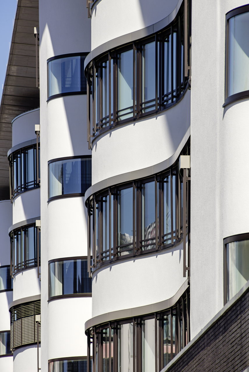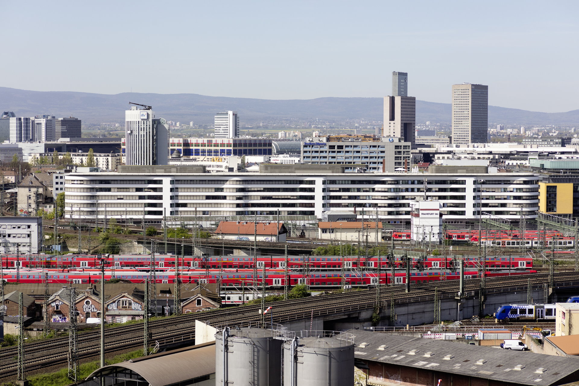 Auf einem äußerst schmalen Grundstück konzipierte schneider+schumacher einen langgestreckten Nord-Süd ausgerichteten Baukörper. Horizontal untergliedert sich das Gebäude in eine zweigeschossige Sockelzone und einen darüber liegenden 5-geschossige Büroriegel, der gegenüber dem Sockel zurücktritt. Technikaufbauten wurden zurückversetzt hinter einen das Volumen begrenzenden, markanten Dachrand geplant. Die weiteren dienenden Funktionen (Tiefgarage, Technik-, Lagerflächen) sind im Untergeschoss untergebracht. Die gestapelten Nutzungen sind in der Fassadengestaltung je nach Funktion/ Anforderung ablesbar. Der markante Dachrand schützt das Bauwerk. (Text: Architekten)