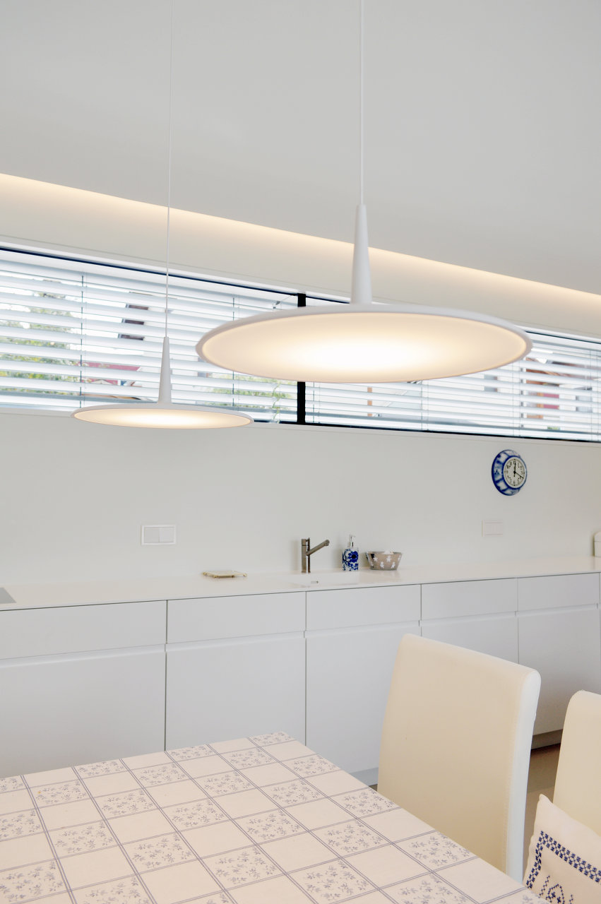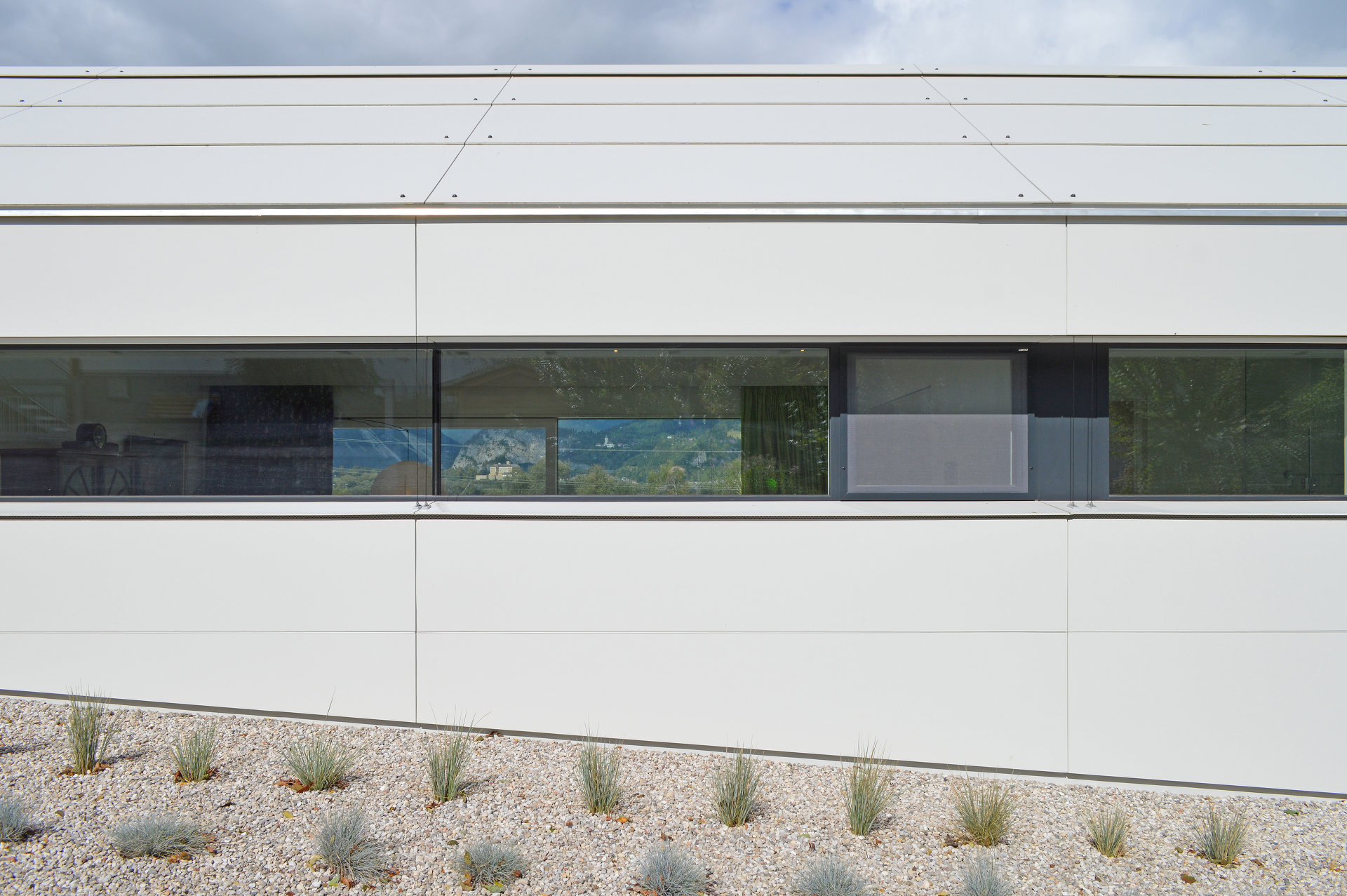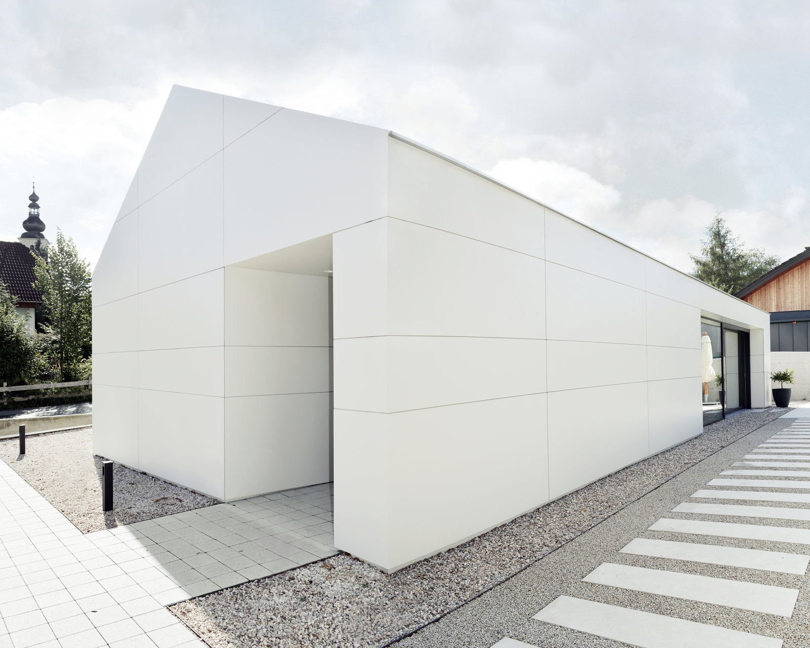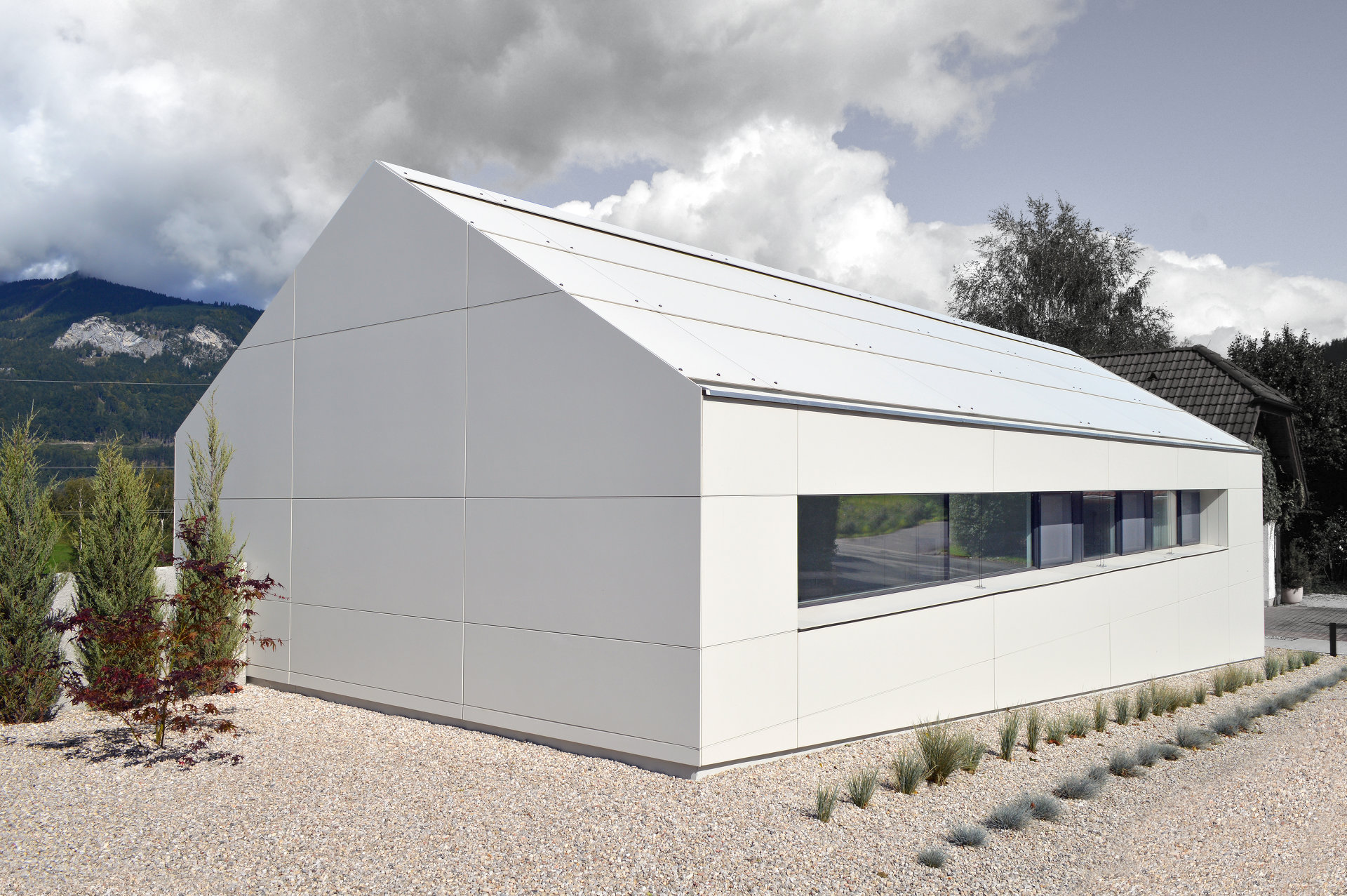 Die Holzriegelkonstruktion garantierte kurze Bauzeit und hohe Genauigkeit bei der Abwicklung von Details. Weiters bringen die großformatigen Eternit-Fassadentafeln die gewünschte Haptik, um den hellen Baukörper angenehm warm erscheinen zu lassen. In den Innenräumen bestärken sandfarbende Böden und die weißen Oberflächen von Einbaumöbeln und Wänden den Gedanken der Zurückhaltung: So kommen die ausgewählten, teils antiken Einrichtungsgegenstände des Bauherrn zur Geltung. (Text: Regine Koth-Afzelius nach einem Text der Architekten)