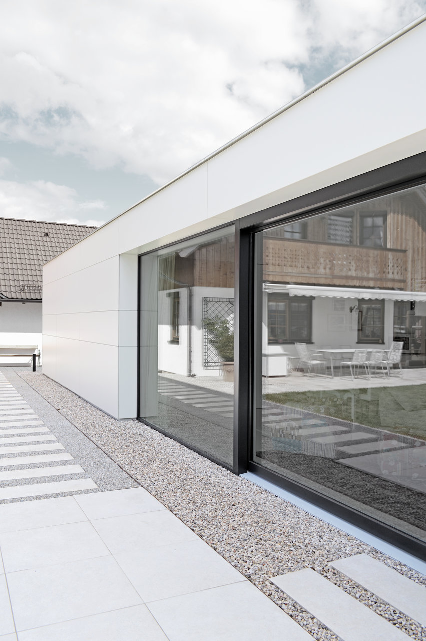 Den Abschluss Richtung Osten bildet das Bestandsgebäude, wogegen an der westlichen Grundgrenze ein Sichtschutz errichtet wurde, ohne die Aussicht einzuschränken.