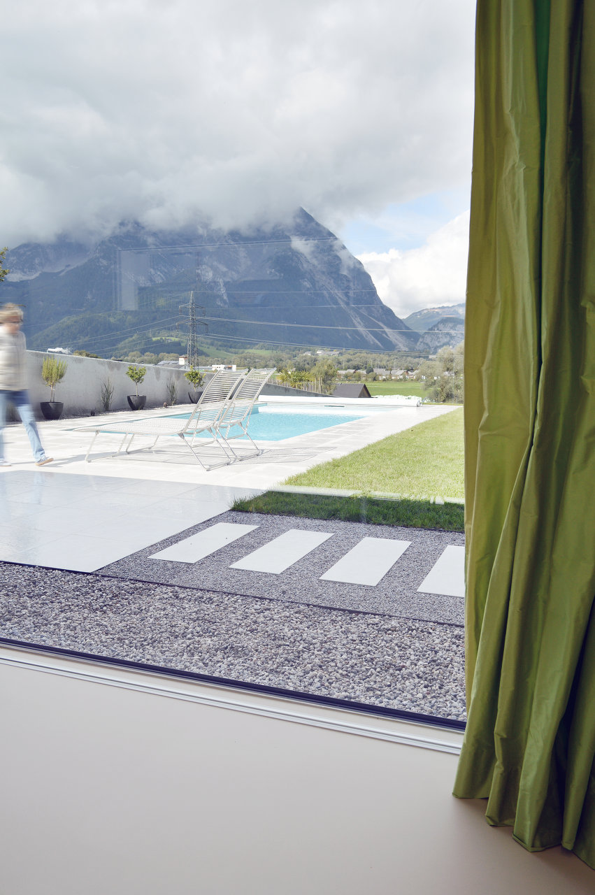 Wenige, klar definierte Öffnungen akzentuieren das Bauwerk: Ein Dachfenster versorgt die Garderobe mit Licht, die Verglasung samt Glasschiebetür im Wohnbereich gibt den Fernblick über den Garten in die umliegende Bergwelt frei und auch die lange, schmale Oberlichte zur Straße sorgt für Ein- und Ausblicke.
