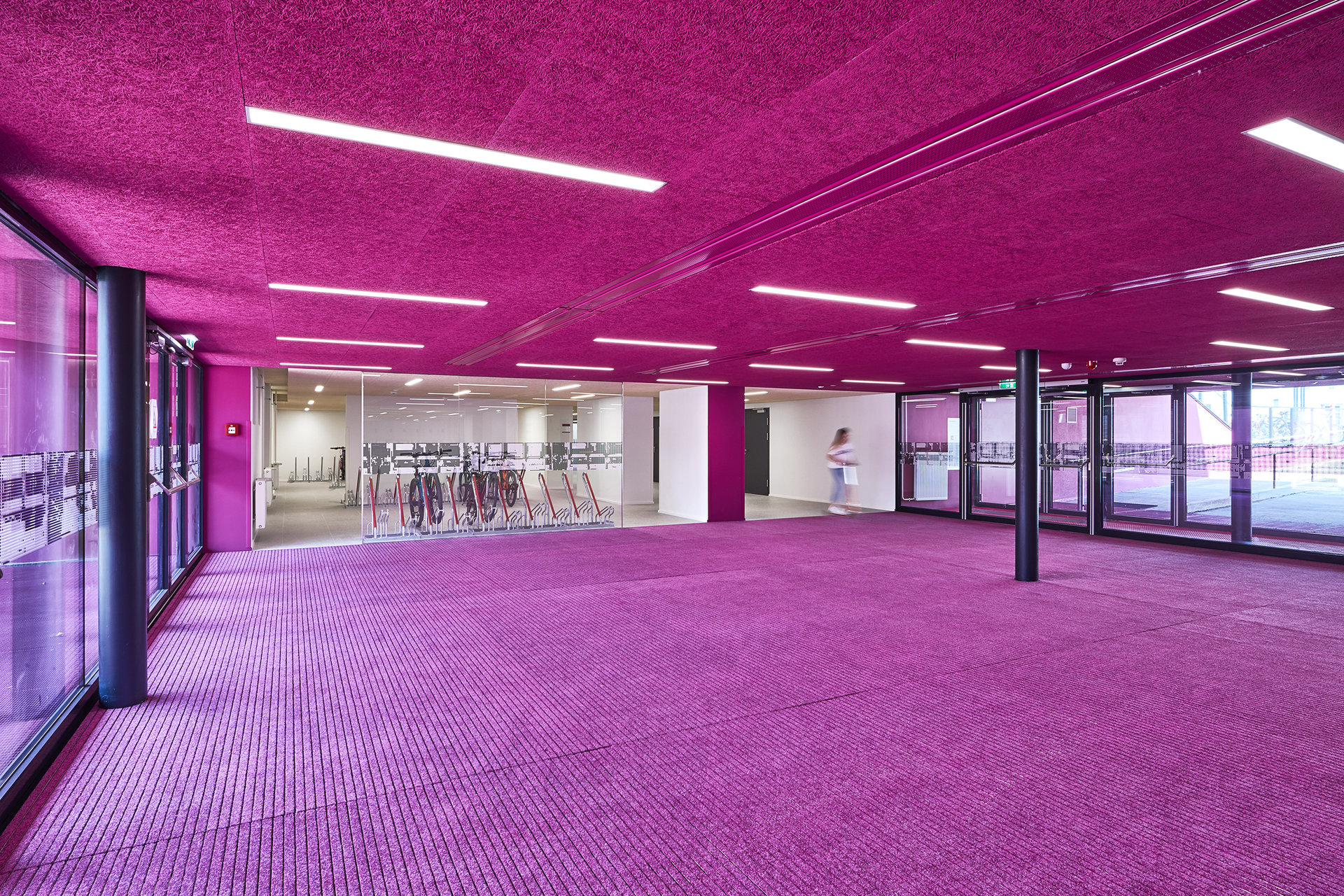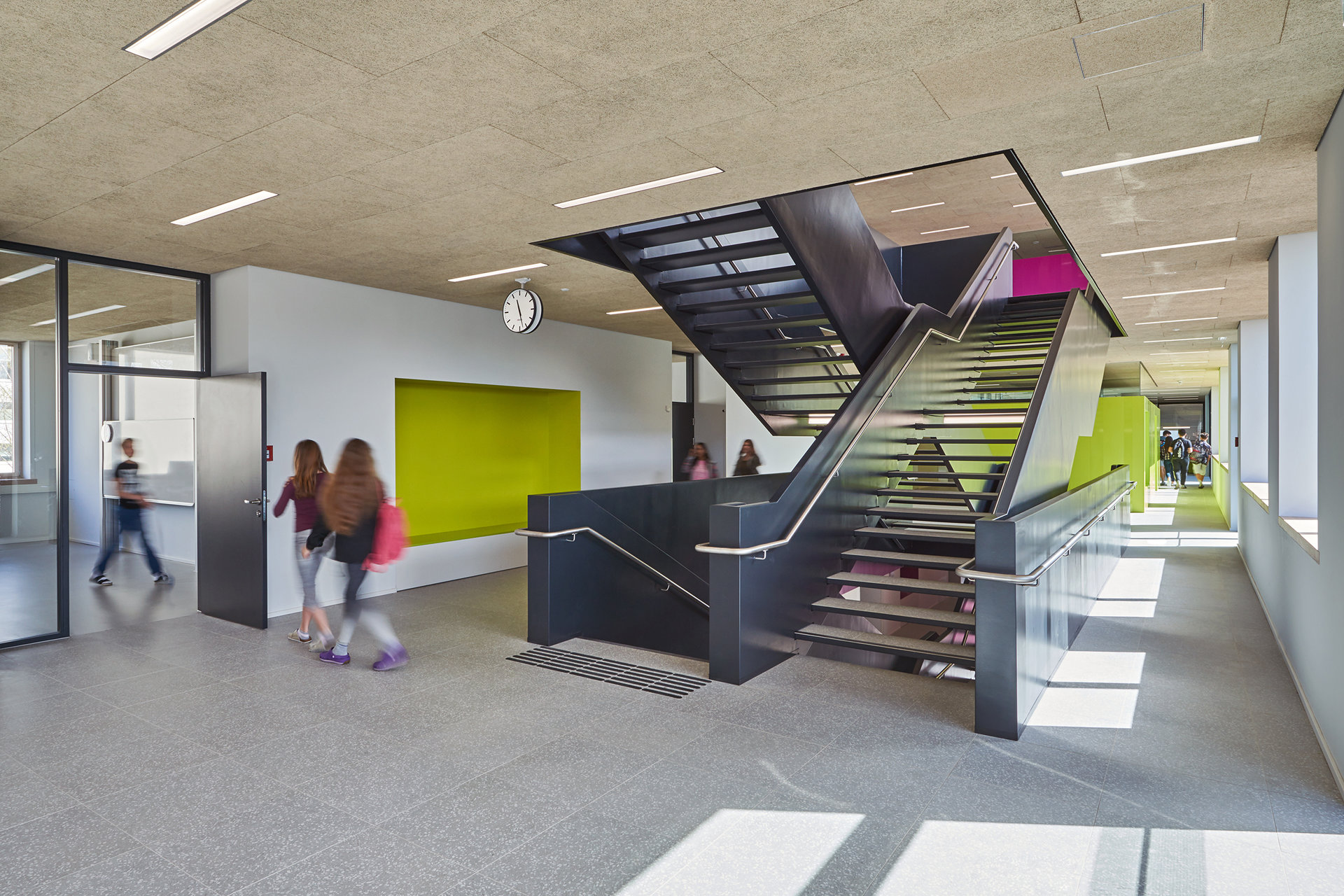 Die bestehenden Gebäudeteile aus den 50er- und aus den 70er Jahren wurden ebenso generalsaniert und mit einer komplett neuen Eingangssituation in Form einer purpurfarbenen Rampe – mittlerweile liebevoll „Halfpipe“ genannt – aufgewertet. Durch diese betreten die Schüler:innen nun ihr Gebäude um einerseits in die Garderobe abzutauchen oder um über eine Sitzstufenanlage direkt in den schon von der Josefstrasse aus sichtbaren Schulhof zu gelangen.