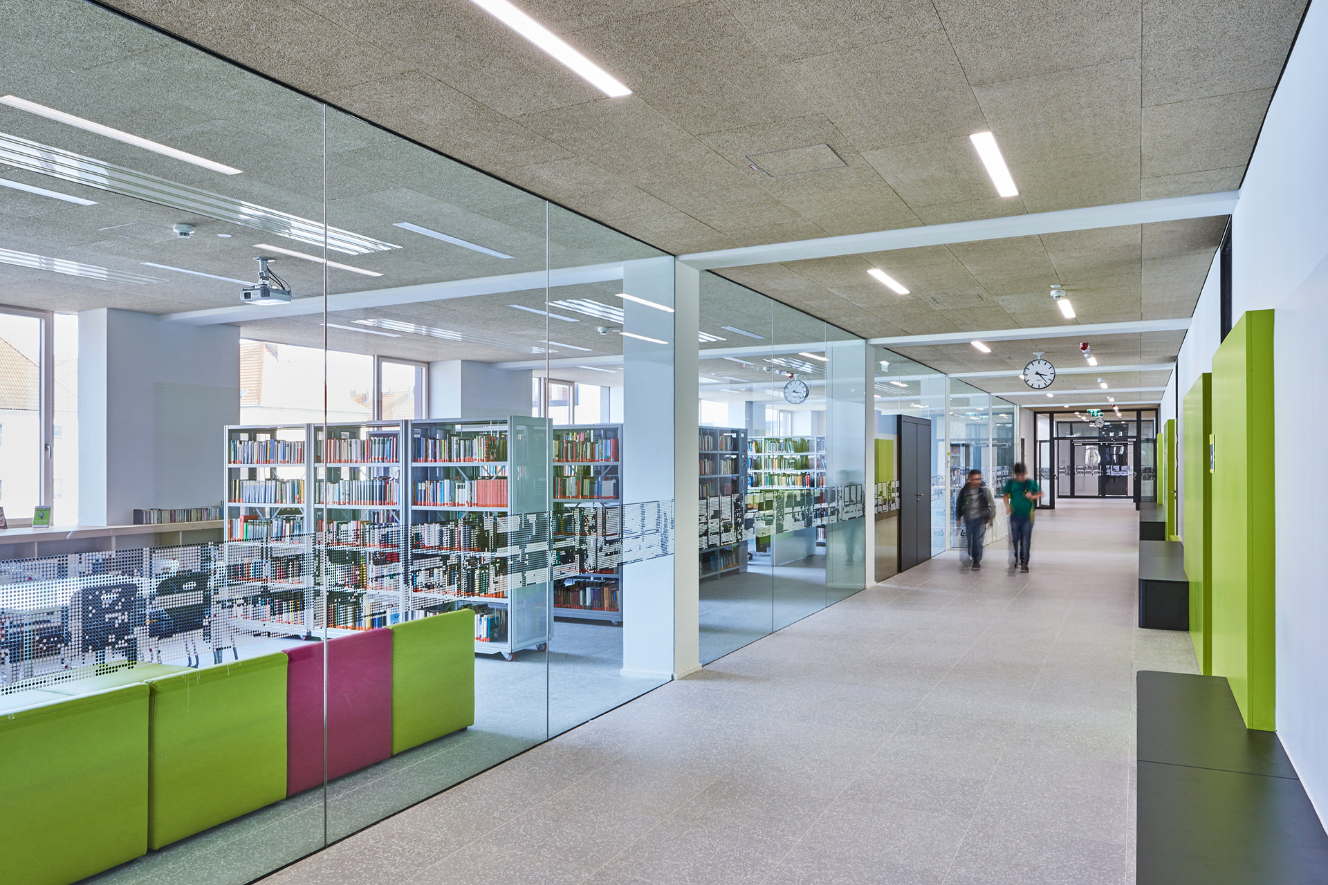 Diese Offenheit und Transparenz – die Kernidee bereits im Wettbewerb - wird durch die großen Öffnungen unterstrichen, die -zusammengefasst und mit schwarzschillernden Passepartouts eingerahmt – gemeinsam mit einer Fassade aus verzinktem Stahlblech die unterschiedlichen Gebäudeteile überziehen um ein zeitgemäßes Schulgebäude mit einheitlichem Erscheinungsbild zu erzeugen, welches diese Transparenz und Offenheit nach außen kommuniziert. (Text: Architekt:innen)