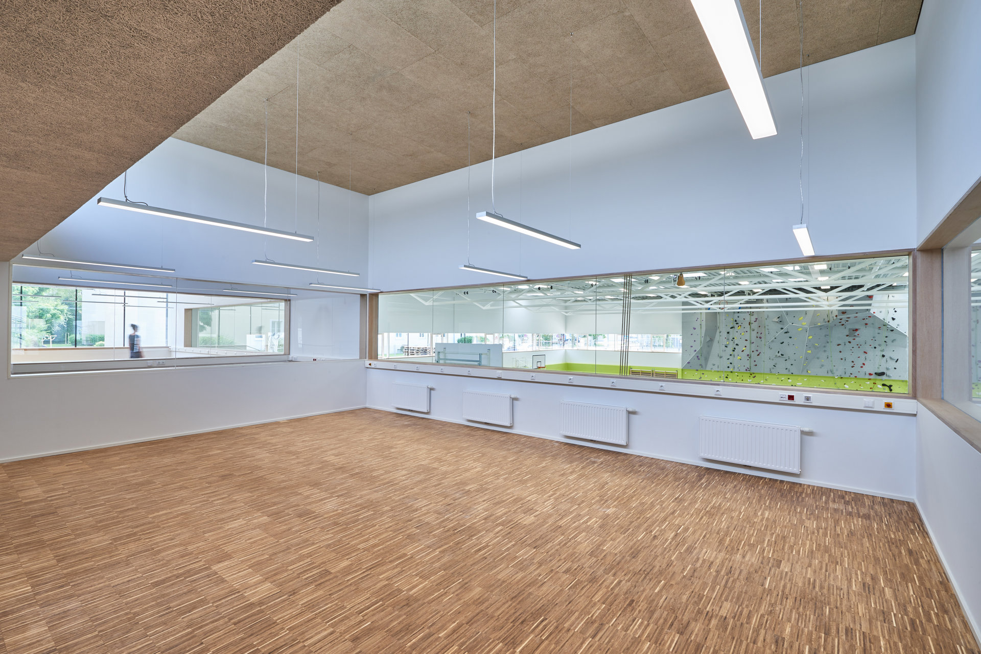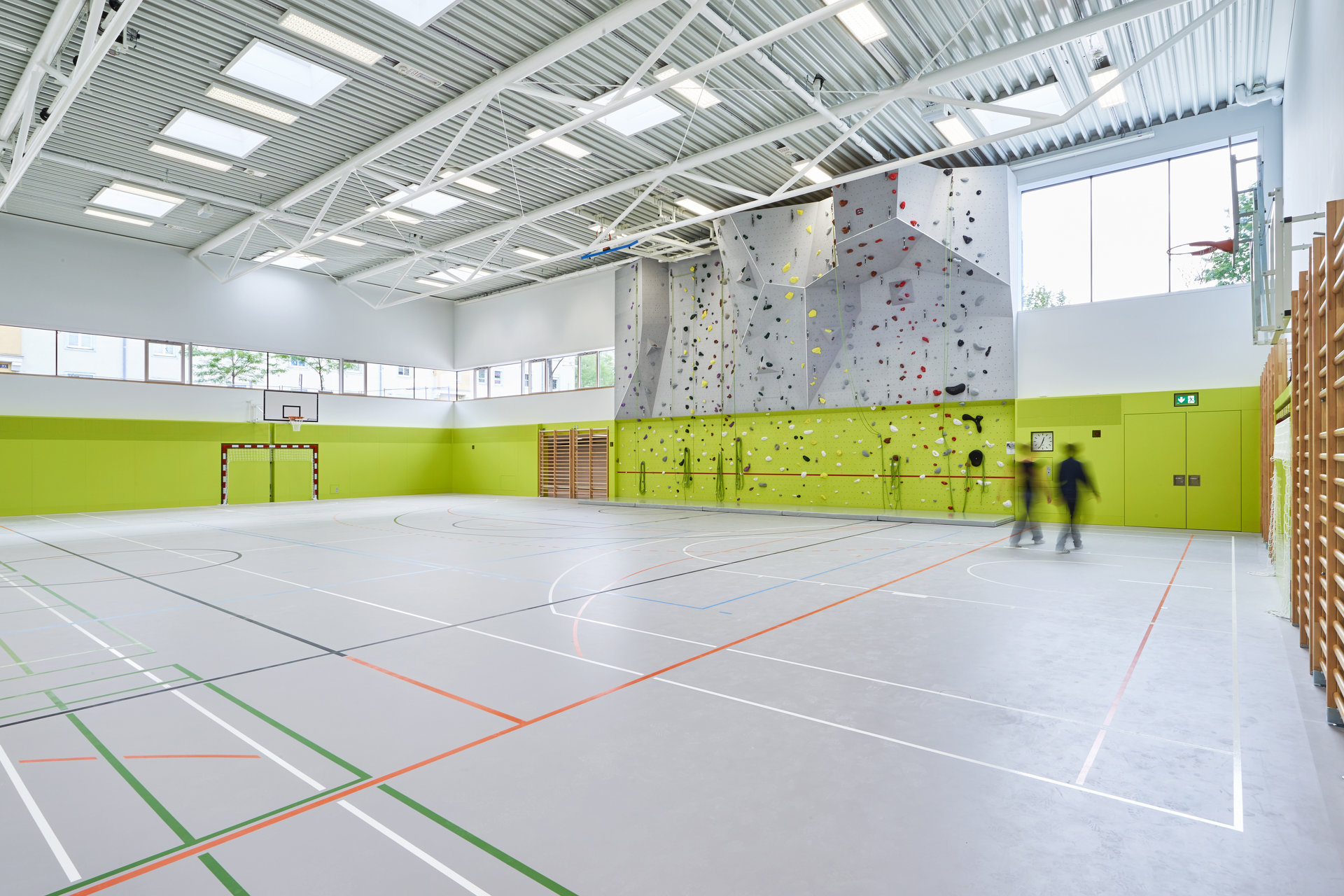 Die bestehende Turnhalle aus den 50er Jahren, an der Josefstrasse situiert, wurde abgebrochen und durch eine neue Doppelsporthalle mit großzügiger Kletterwand ersetzt. Der anschließende Turnsaal aus den 1970er Jahren wurde generalsaniert. Damit wurde ein neuer, großzügiger Turnsaaltrakt geschaffen, der der sportlichen Ausrichtung der Schule gerecht wird.
