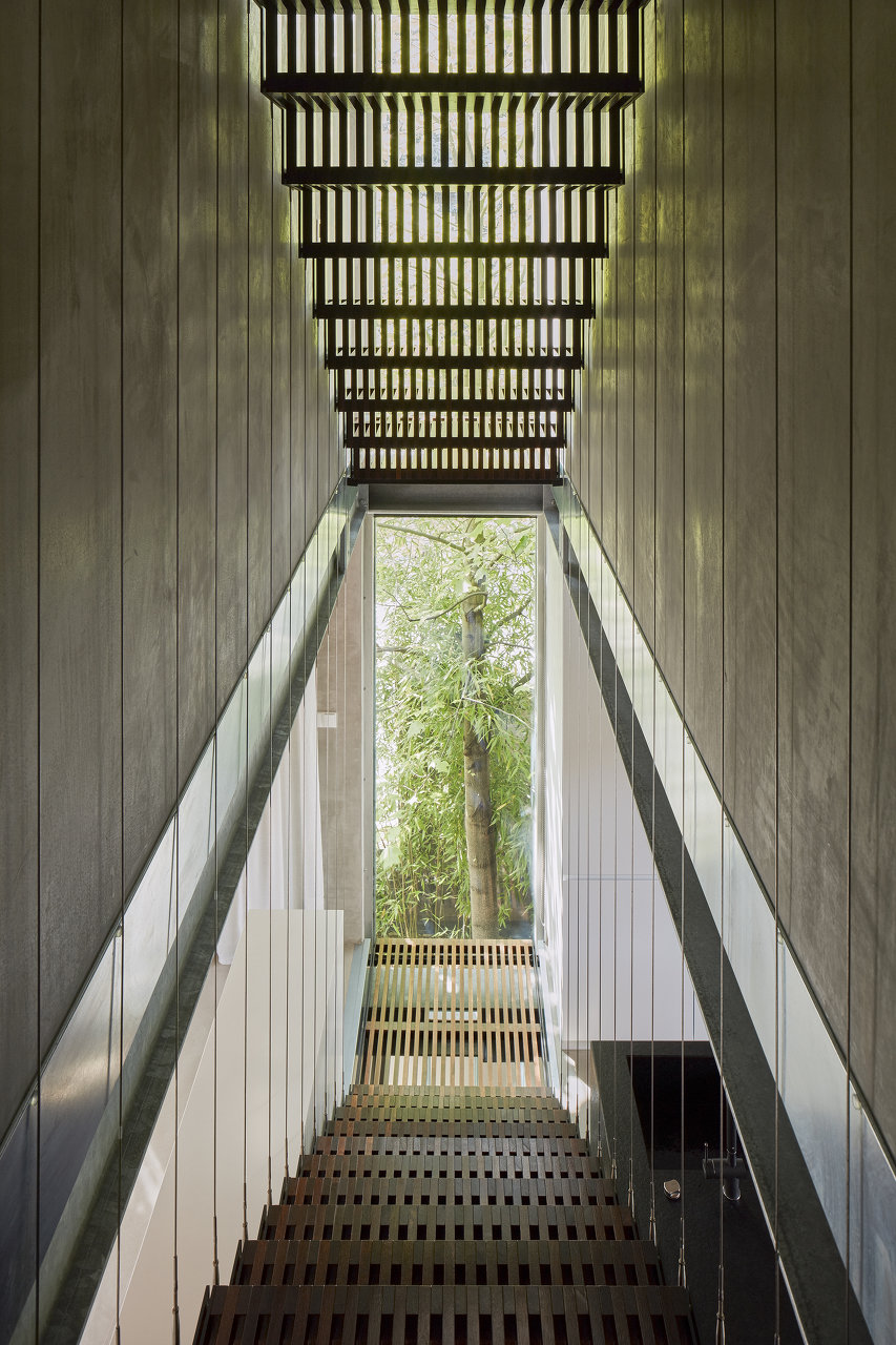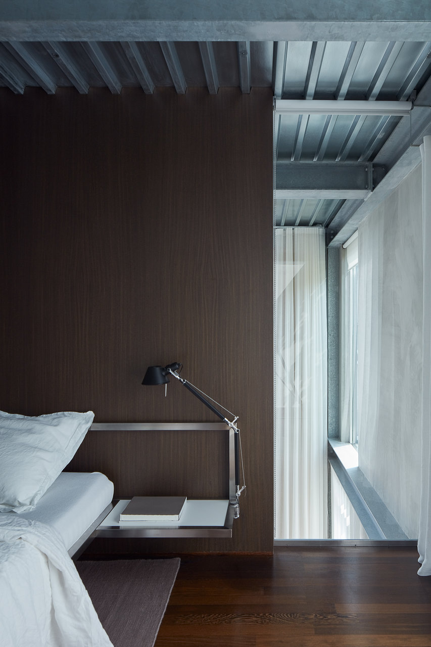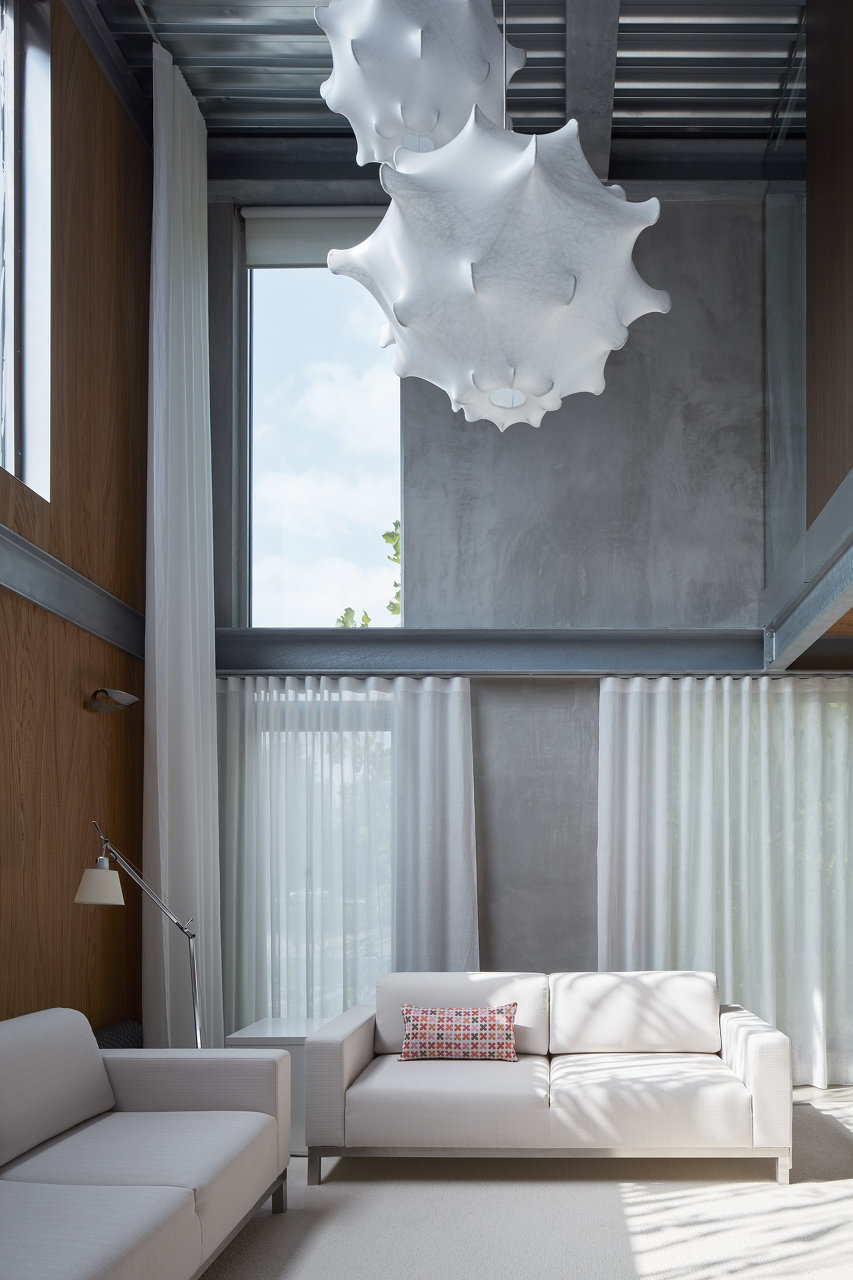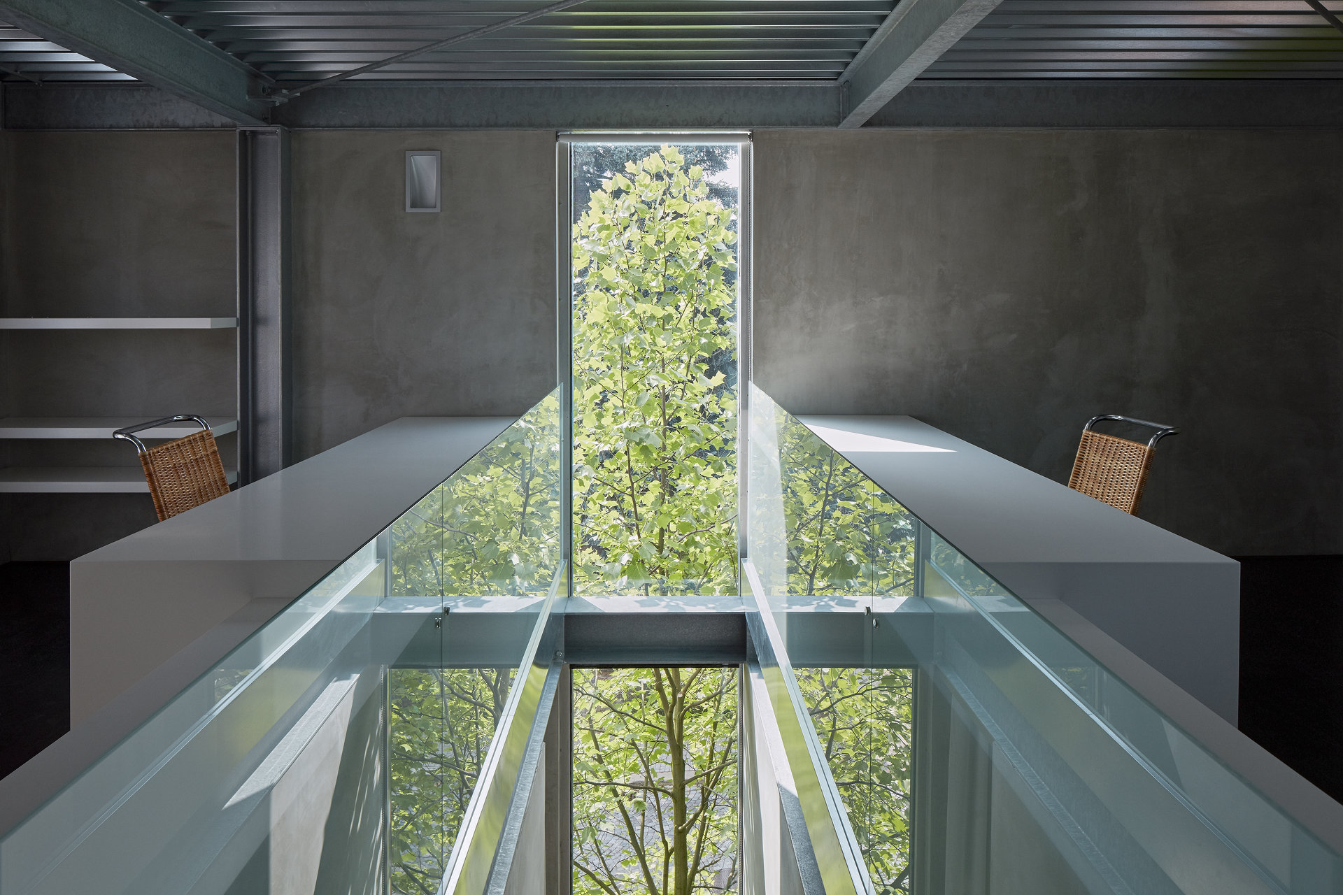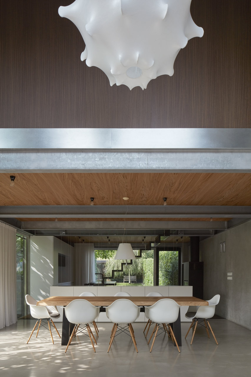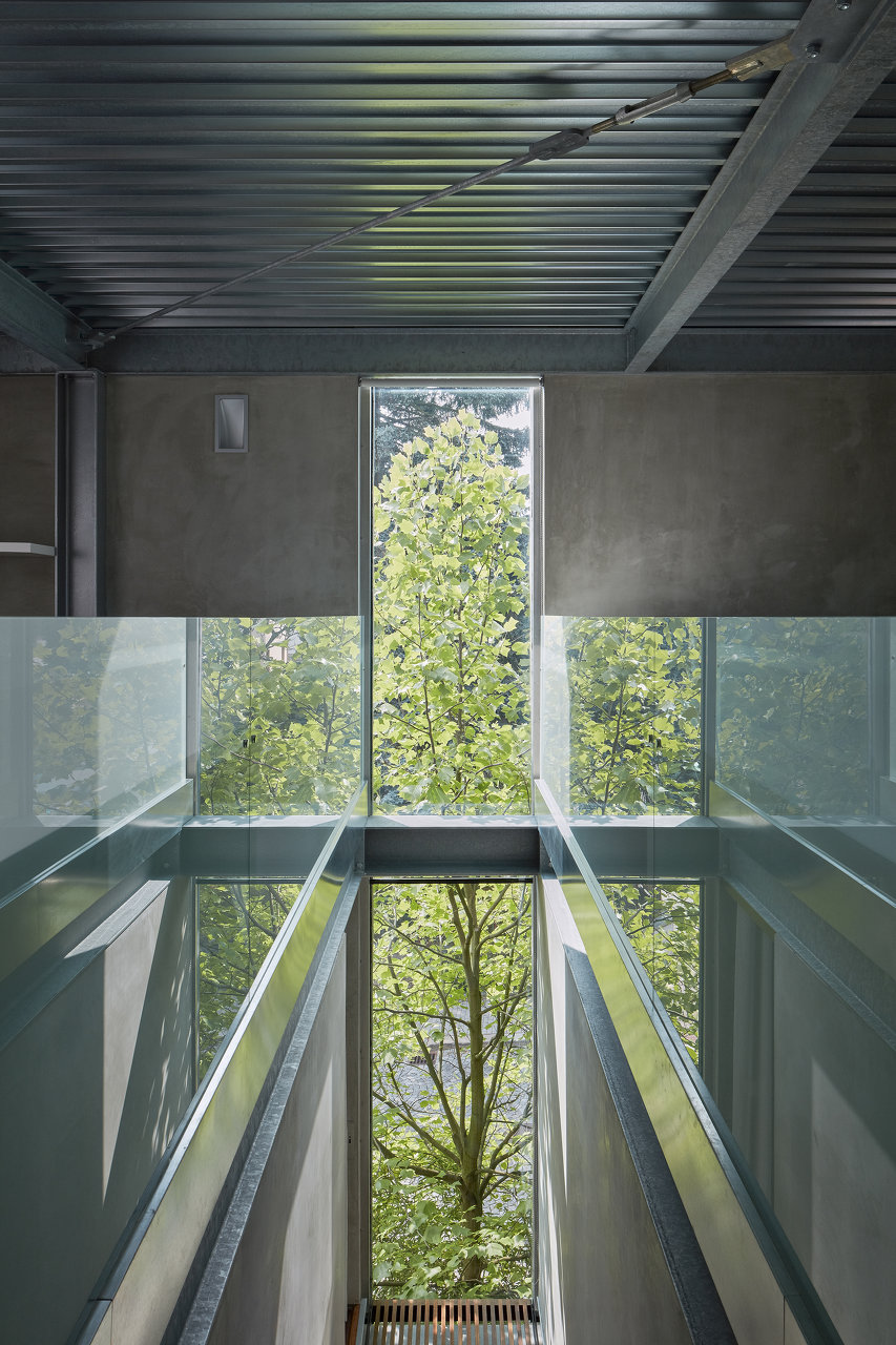 Es wurde im Rohzustand mit freiliegenden Materialien gebaut: polierte Betonböden, eine verzinkte Stahlkonstruktion, Wellblech mit Beton für die Decke und Betonestrich als Abschlusswand. Das gesamte Äußere mit vorgerostetem Blech (CorTen) verkleidet. Dank Landschaftsgestaltung und damit alter gepflanzter Bäume fügt das Haus sich natürlich in die benachbarte Häuserreihe ein und ist quasi unsichtbar.