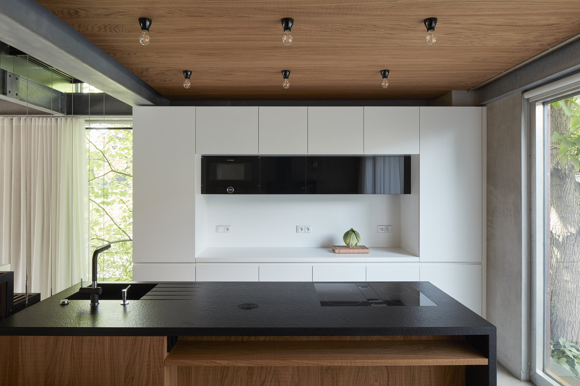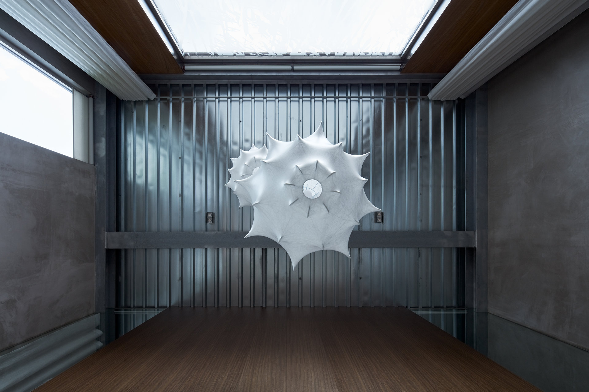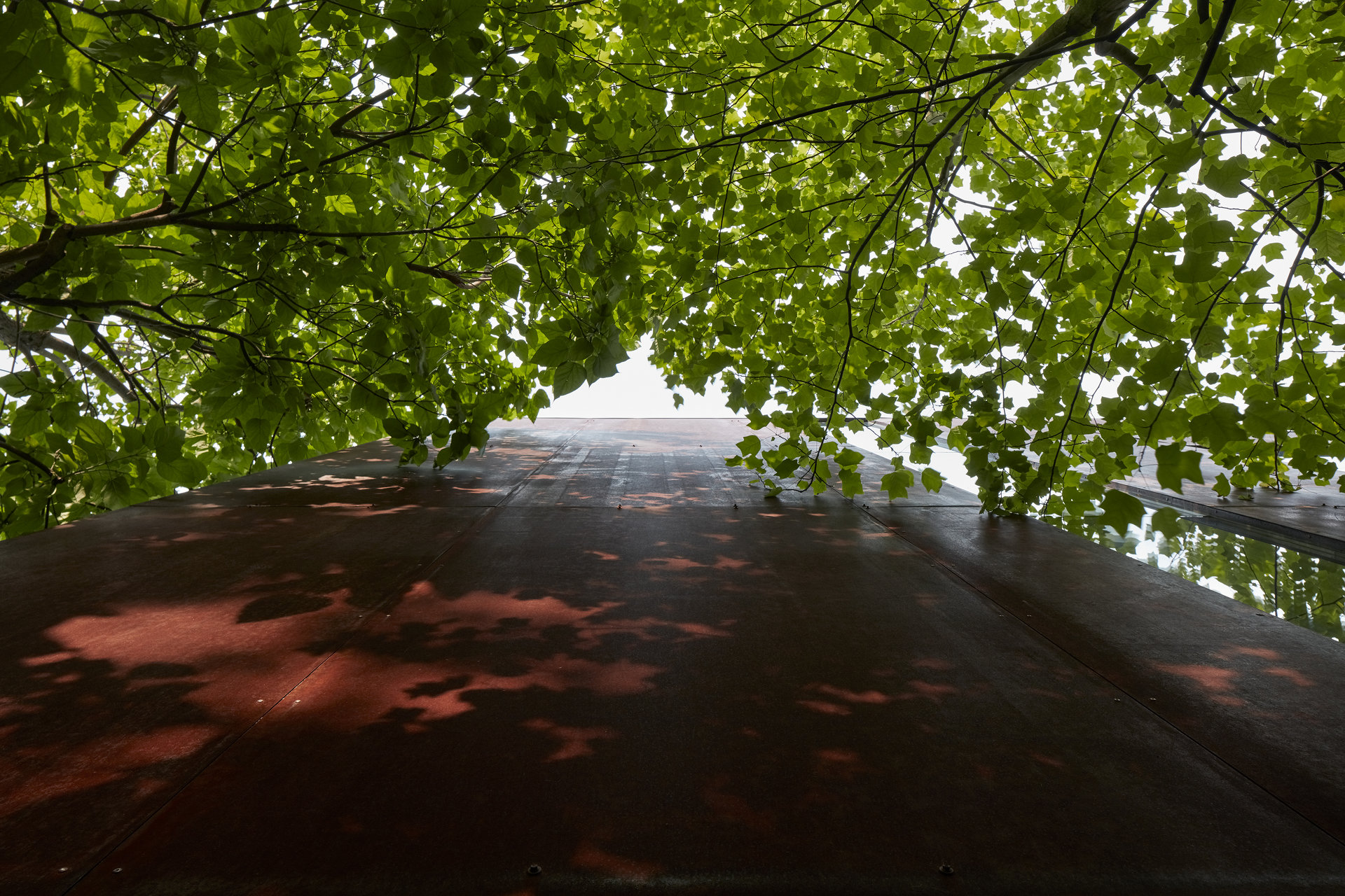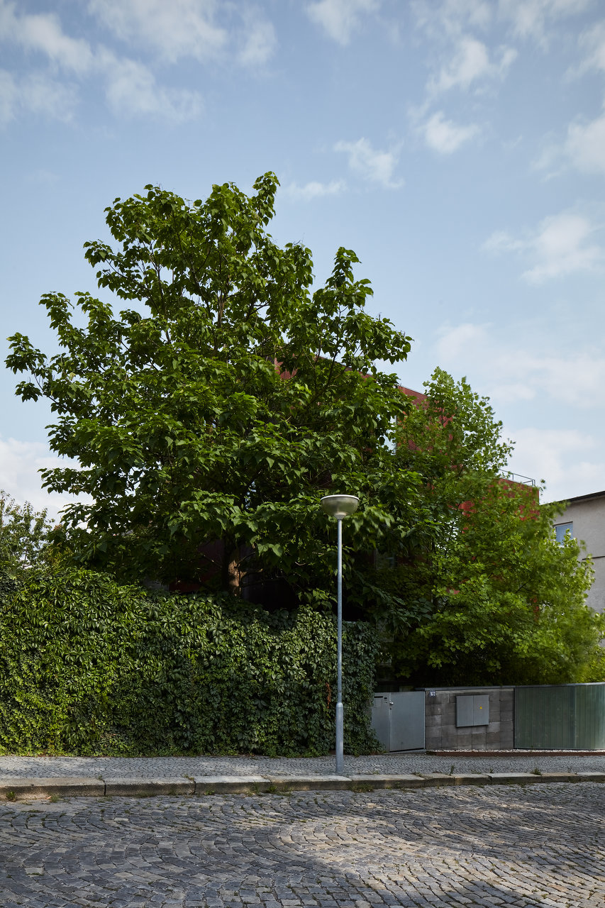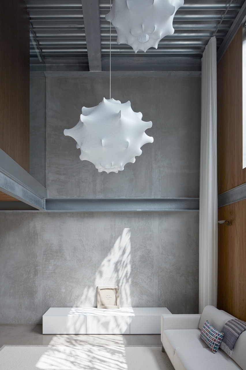 Es wurde im Rohzustand mit freiliegenden Materialien gebaut: polierte Betonböden, eine verzinkte Stahlkonstruktion, Wellblech mit Beton für die Decke und Betonestrich als Abschlusswand. Das gesamte Äußere mit vorgerostetem Blech (CorTen) verkleidet. Dank Landschaftsgestaltung und damit alter gepflanzter Bäume fügt das Haus sich natürlich in die benachbarte Häuserreihe ein und ist quasi unsichtbar.