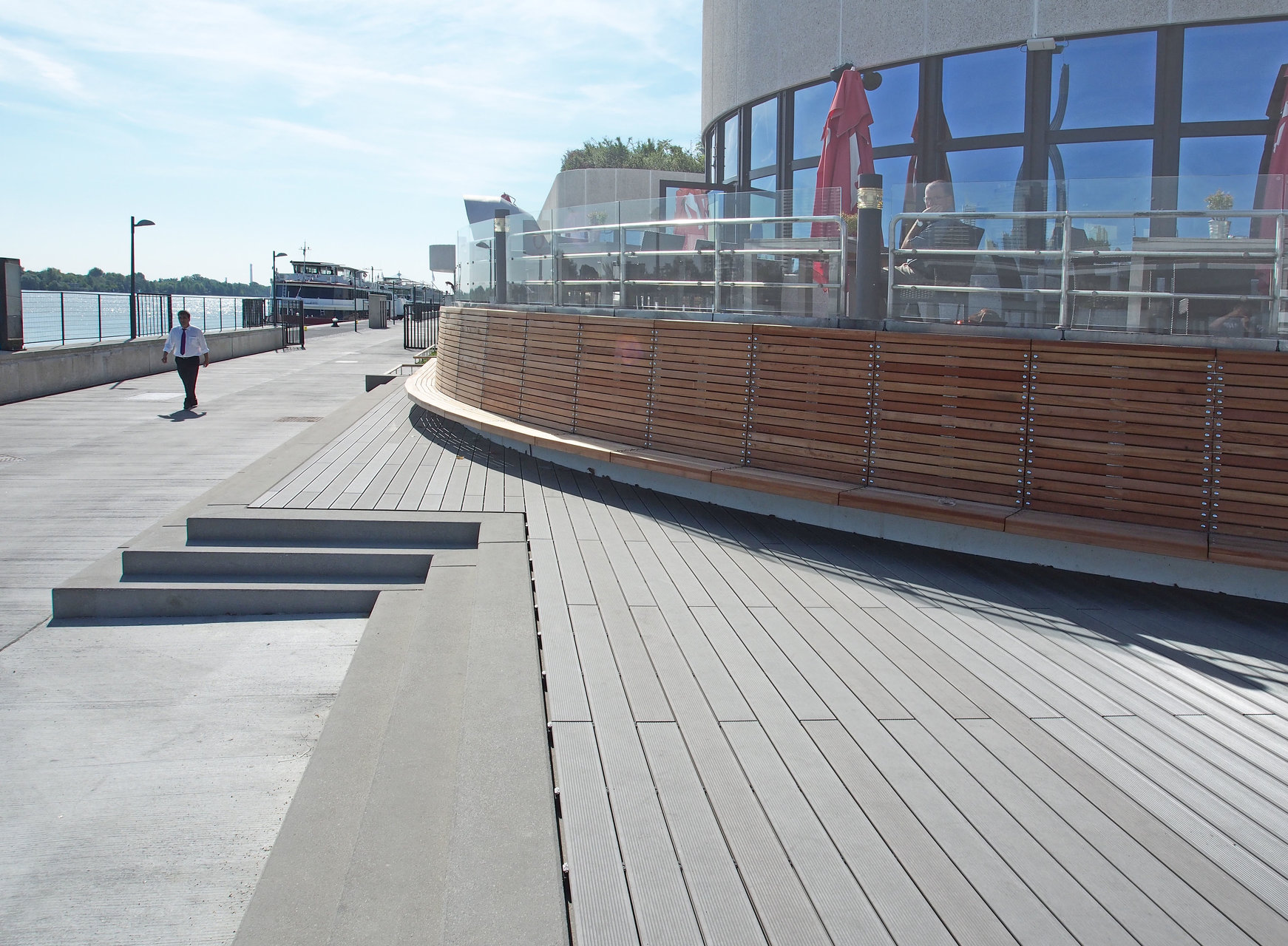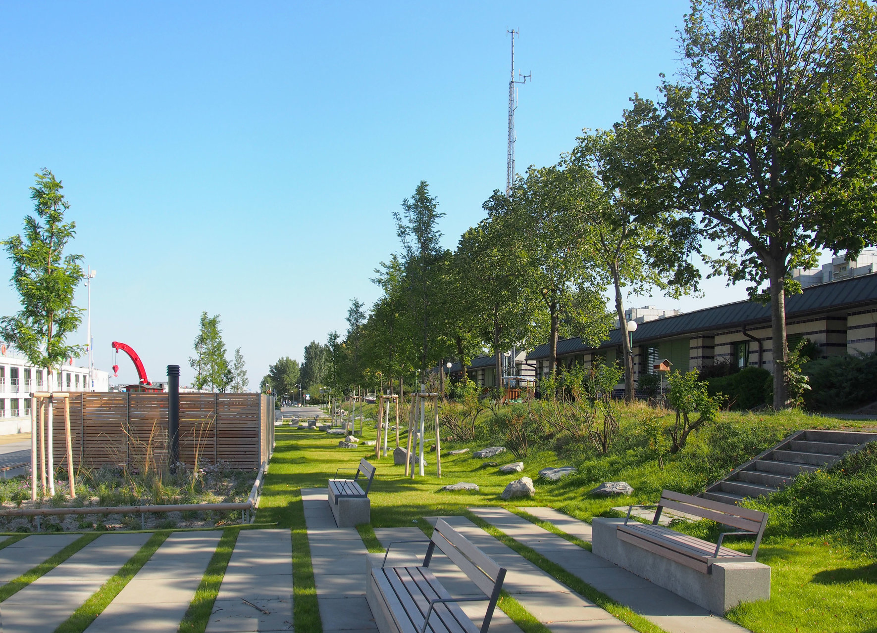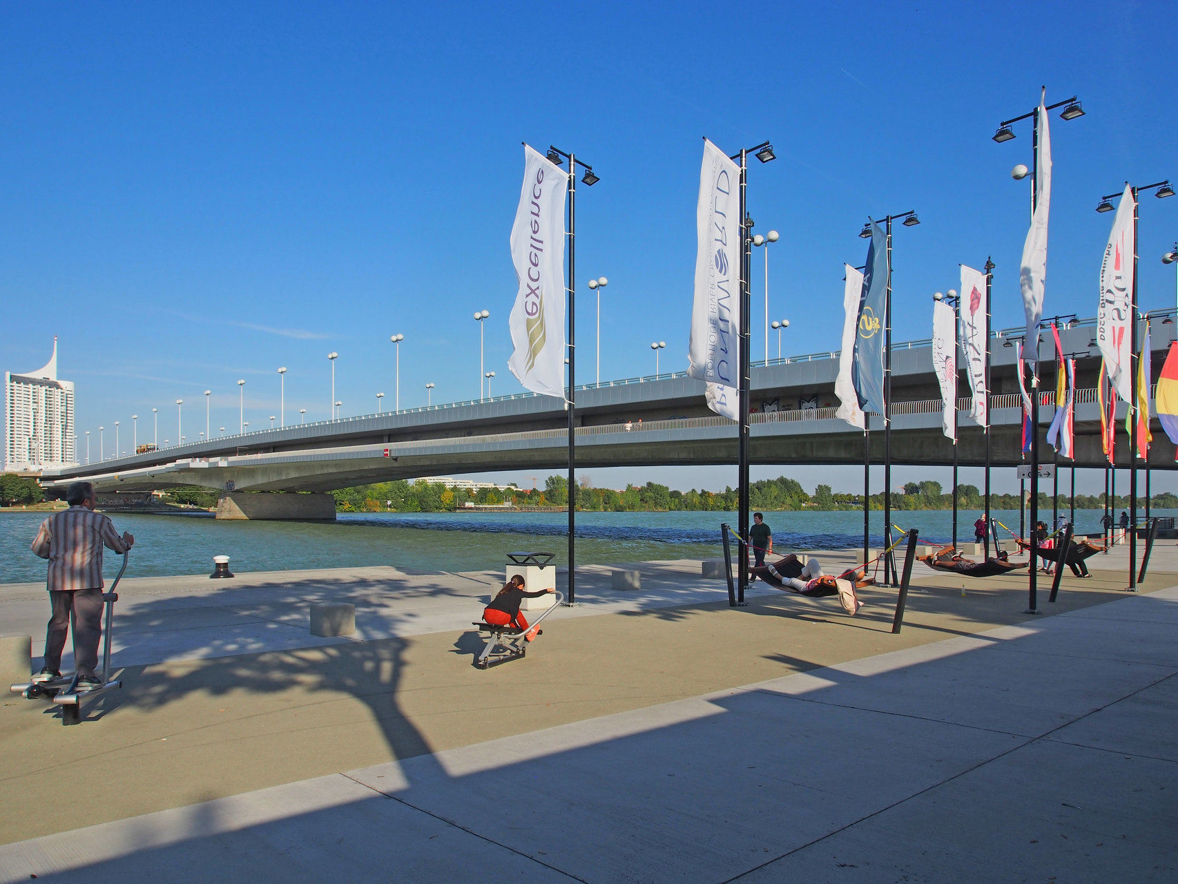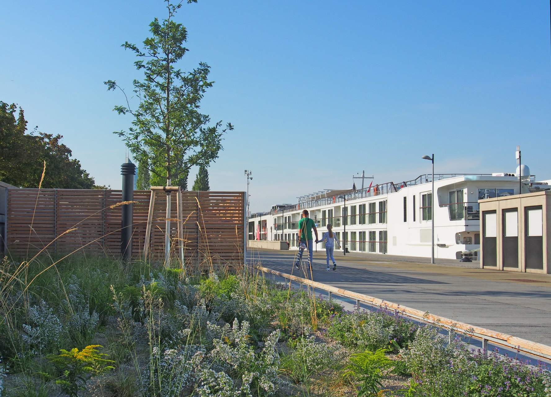 Zwischen der Kaimauer für die Donaukreuzfahrtschiffe und dem Damm entwickelt sich parallel zur Straße eine Abfolge von Grün- und Freiräumen, welche sowohl den ankommenden Gästen als auch der Bevölkerung als Erholungsraum dient. Ziel war die Entwicklung eines durchlaufenden abwechslungsreichen Erholungsraumes ohne spürbare Barrieren. Die Bewegung entlang der Donau ist auf der gesamten Fläche bequem möglich. Da es keine Niveausprünge gibt, ist ein Ausweichen vor den Fahrzeugen in die gesicherten Bereiche an der Kaimauer jederzeit möglich.Die Gliederung erfolgt durch eine Perlenschnur aus Staudenbändern und eine einheitliche Baumreihe. Um die Reichsbrücke und beim Hafengebäude verdichtet sich die Gestaltung in Form eines Fahnenwalds mit Hängematten und Fitgeräten und einem Wasserspiel. Ein großes Deck samt langen Bänken und Podesten vermittelt beim Restaurant zwischen der Kaiebene und der Restaurantebene auf der Dammkrone. (Text: Rennhofer)