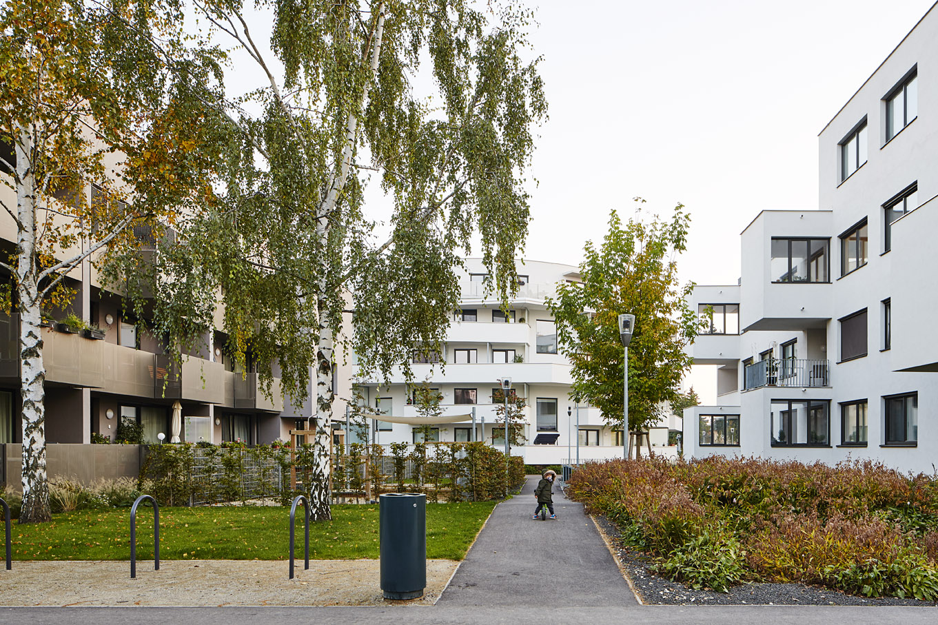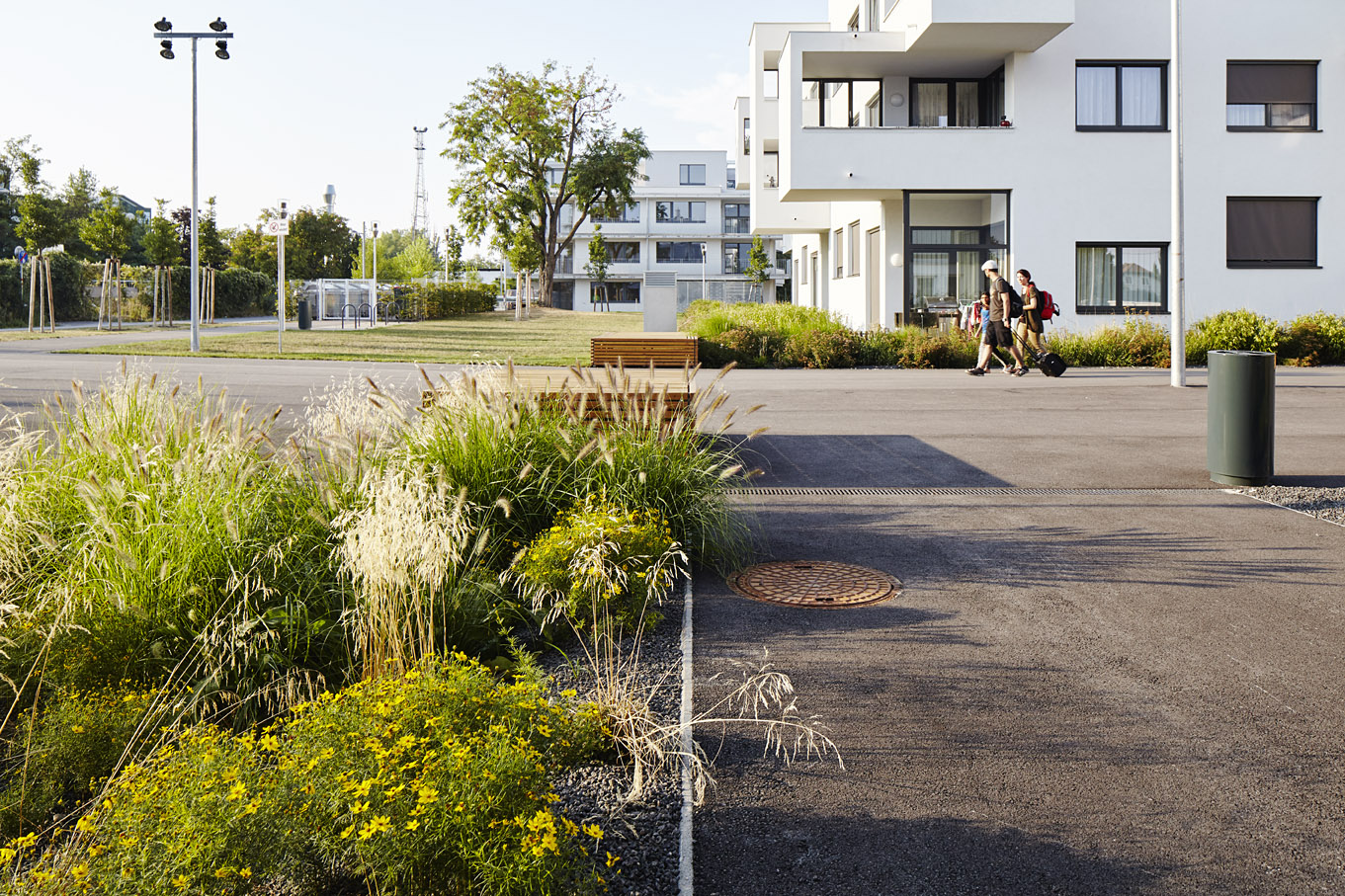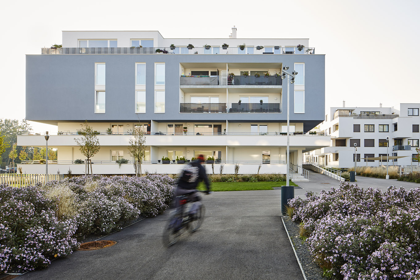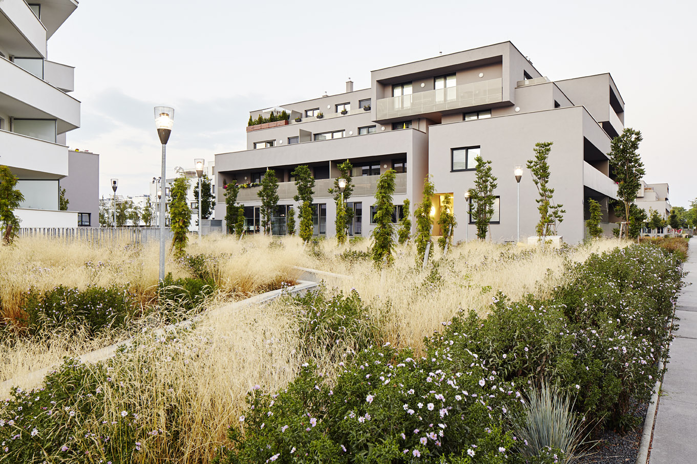 An der Gerasdorfer Straße 281 in Wien–Floridsdorf entstand eine neue Wohnhausanlage mit rund 250 Wohnungen. Aus optischen und thematischen Gründen erheben sich die neun unterschiedlichen Baukörper leicht vom gewachsenen Grund und erhalten einen intensiv begrünten, bunten Kragen aus Blausternen, Federborstengras und Seggen. Die Differenzierung der einzelnen Bereiche soll die Orientierung in der Anlage erleichtern. Ergänzt wird das Freiraumkonzept von über 200 neu gepflanzten Bäumen und einigen Kleinkinderspielbereichen. (Text: Wojciech Czaja)