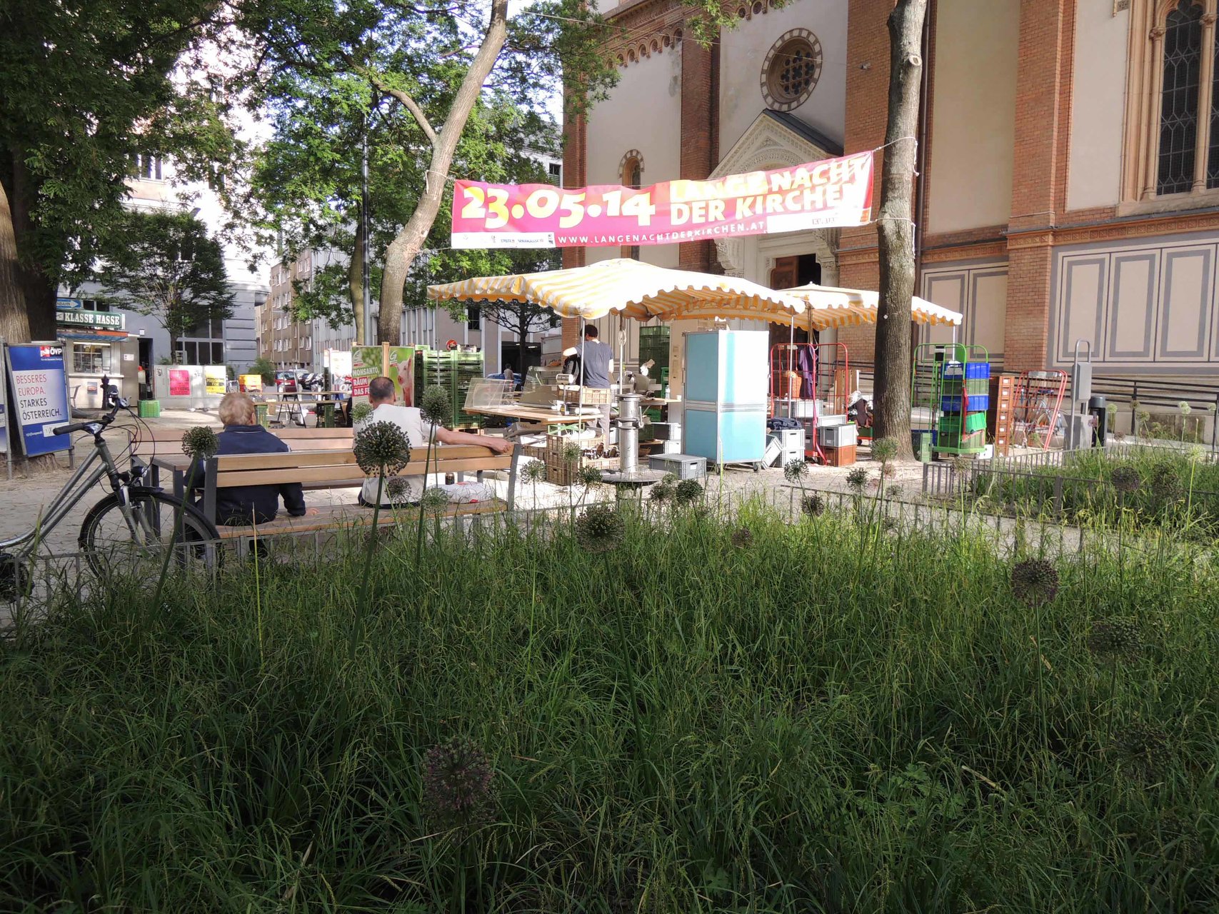 Der wöchentliche Bauernmarkt findet weiterhin unter den großen Bestandsbäumen beim Eingang zur Kirche seinen Platz. (Text: Gerhard Rennhofer)