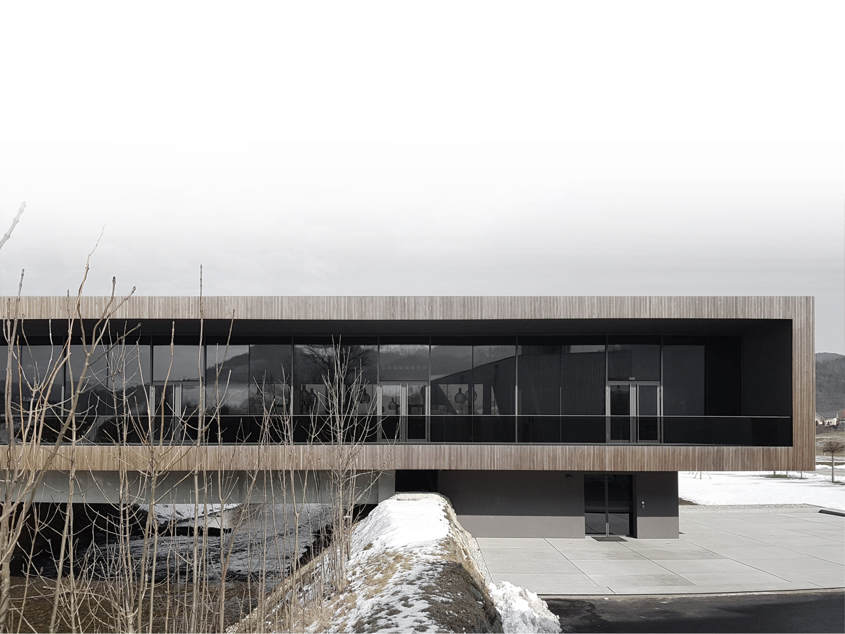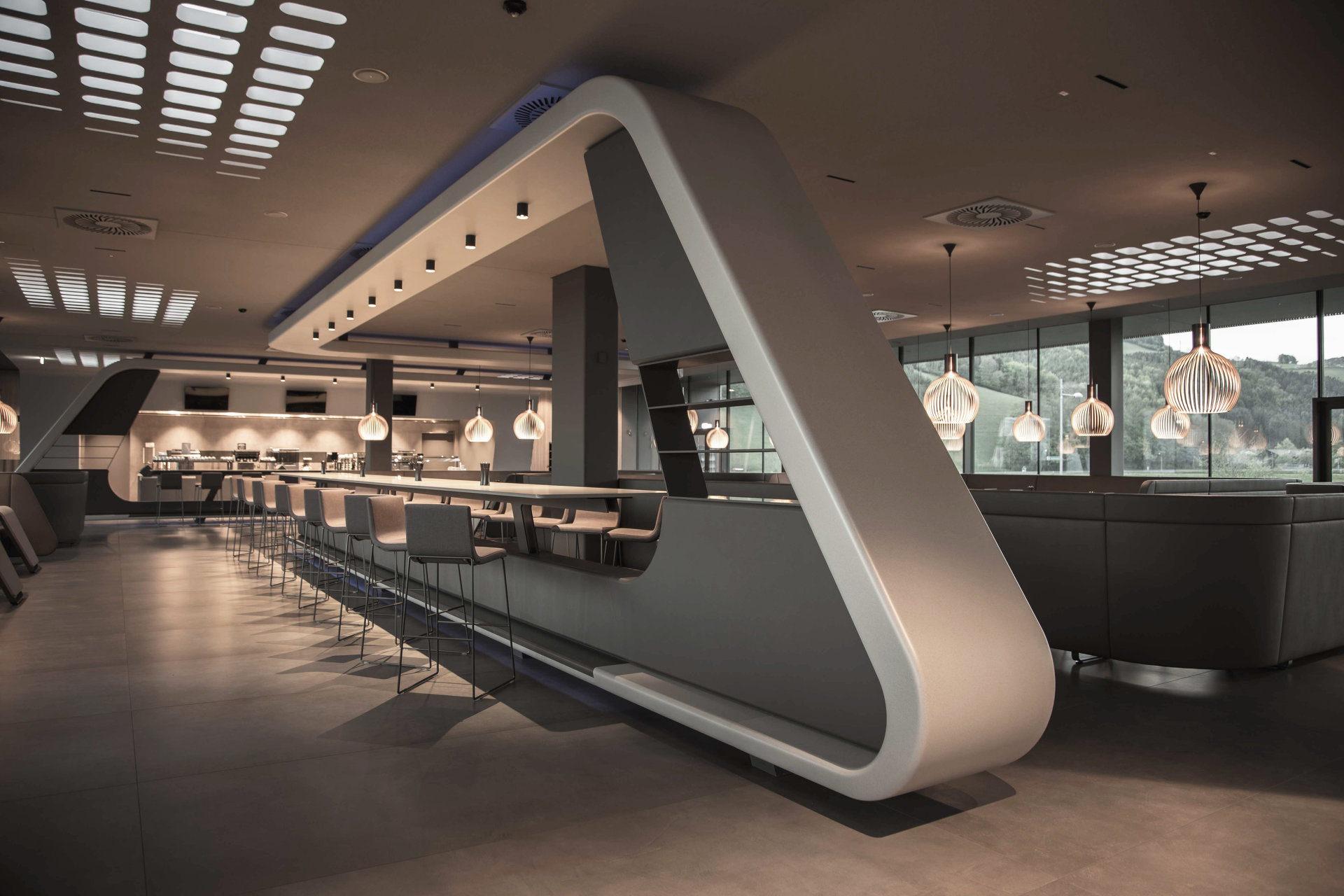 Das Designkonzept umfasst die architektonische Gesamtkomposition bis hin zum Innendesign: Das dunkel gehaltene Innere verstärkt – wie bei einem Passepartout – die Farben des Außenraumes. Über die beiden offenen Seiten gelangen diese Farben der Natur hinein ins Haus. Im Inneren werden Möbelstücke zu Designelementen und raumbildenden Skulpturen. Als Inspirationsquelle für neue Formen und Materialien der Einrichtung diente die Luftfahrt, zugleich das Arbeitsspektrum des Betriebes. (Text: Regine Koth-Afzelius nach einem Text der Architekten)