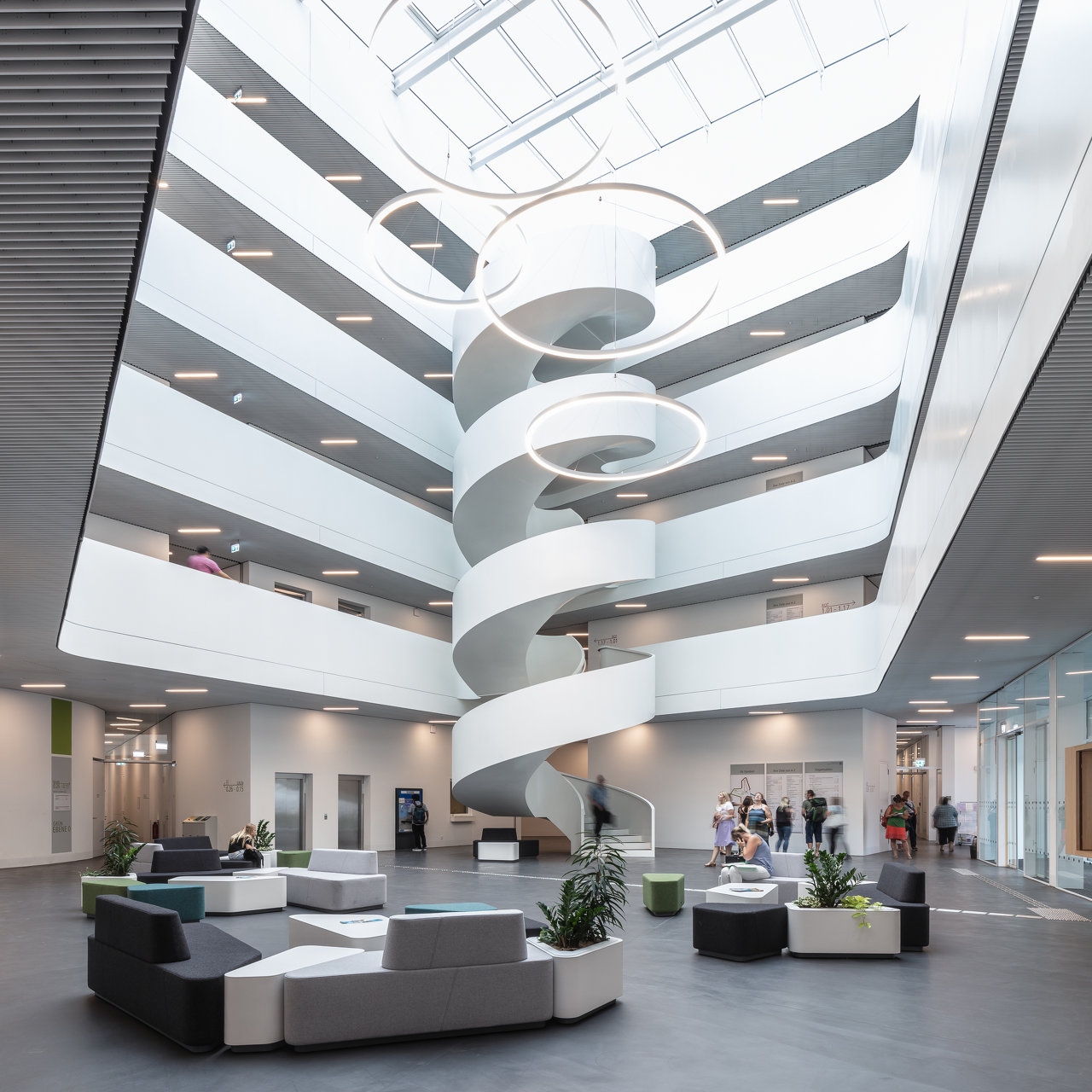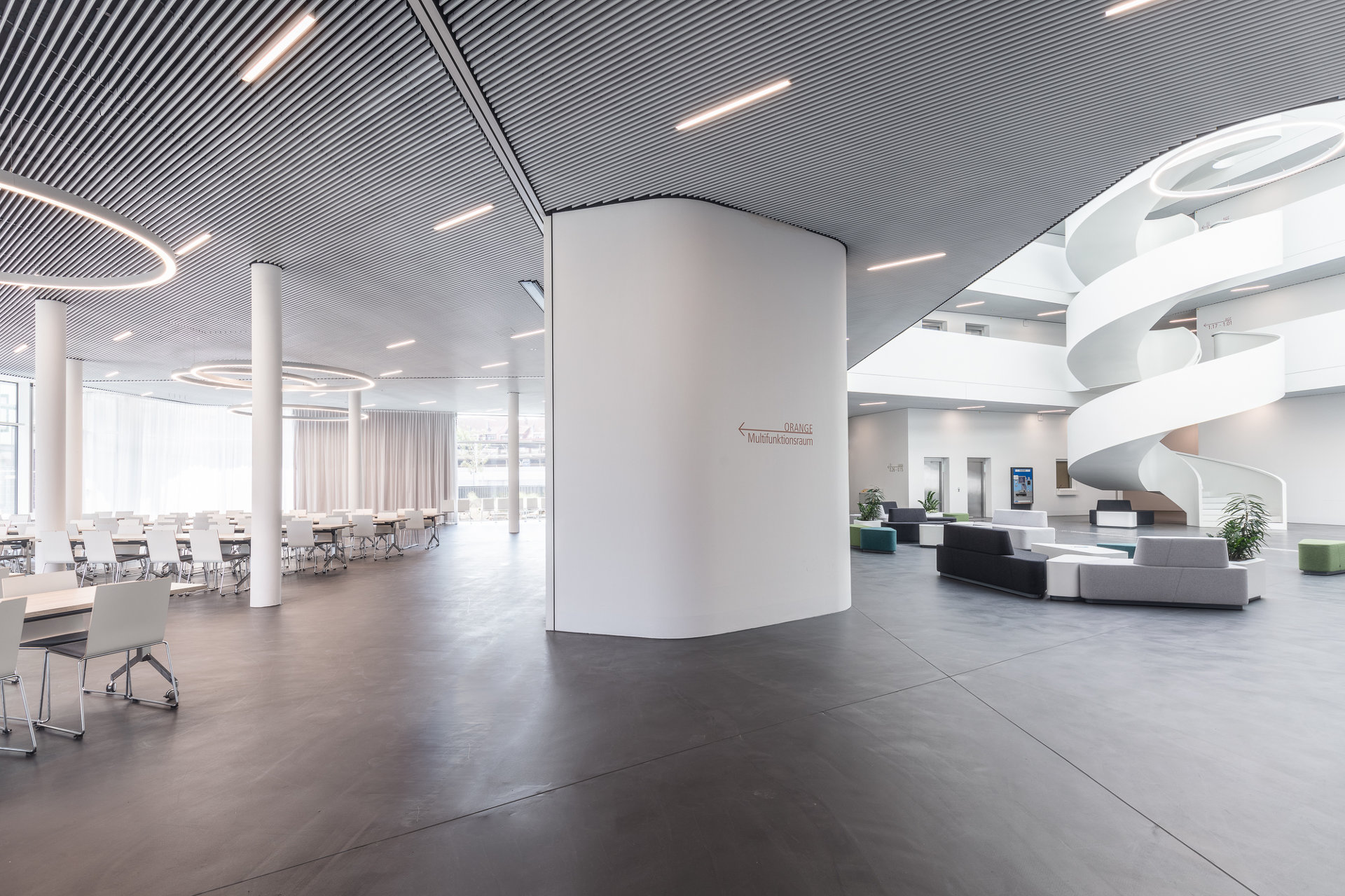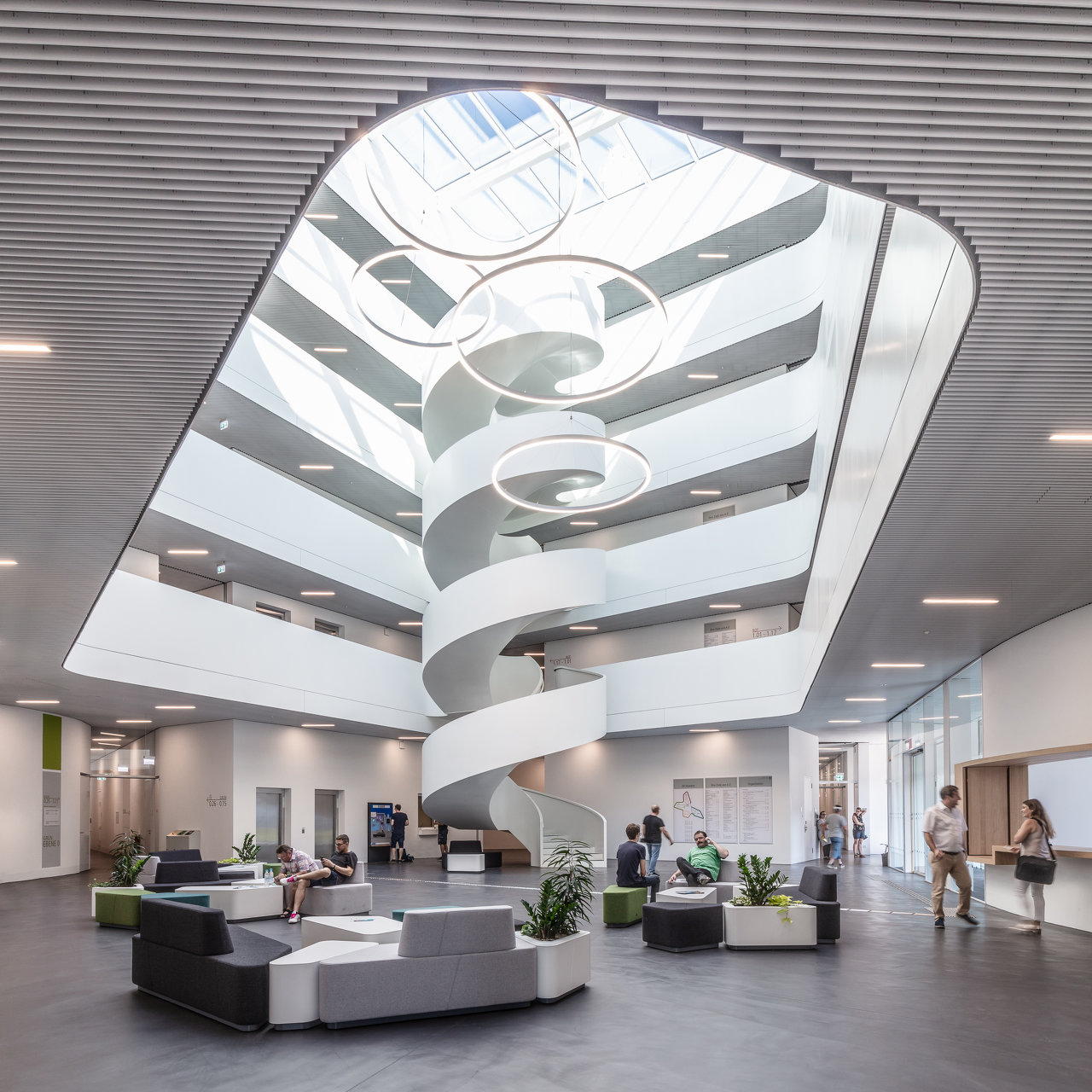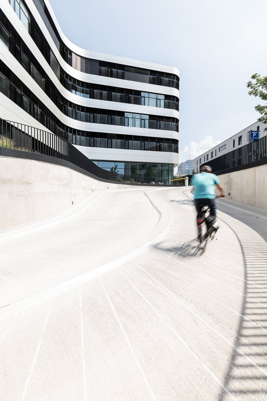 Der transparente Erdgeschoßsockel ist allseitig öffentlich zugänglich. Eine Cafeteria bietet Sitzmöglichkeiten im Innen- und Außenbereich. Über eine großzügige Freitreppe gelangt man in die oberen Stockwerke, in denen die Büroarbeitsplätze situiert sind. Die glatte Glasfassade wird um Aluminiumlamellen ergänzt. Diese schützen vor Sonneneinstrahlung und verleihen der Fassade Bewegung und Tiefe. (Text: Architekten)