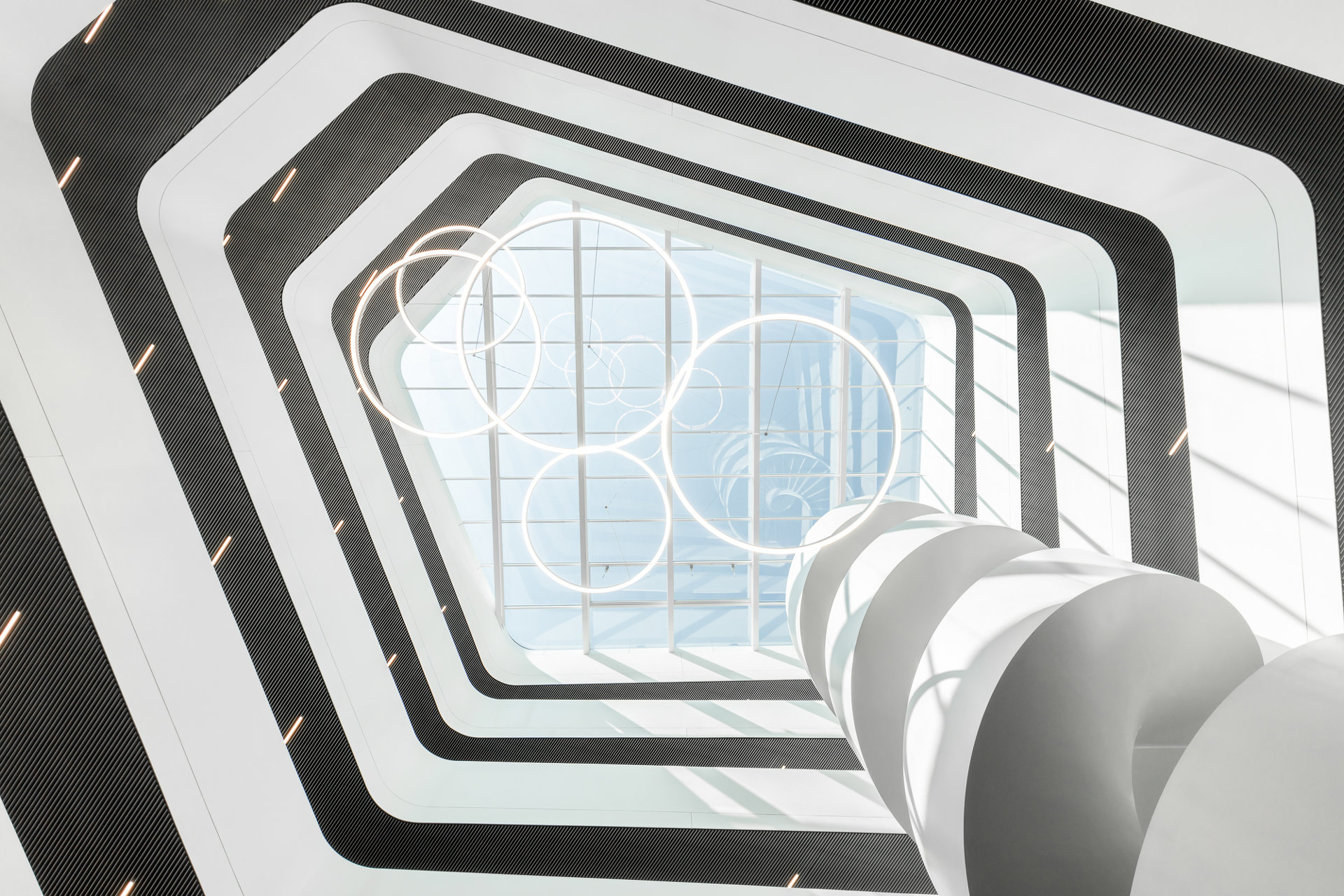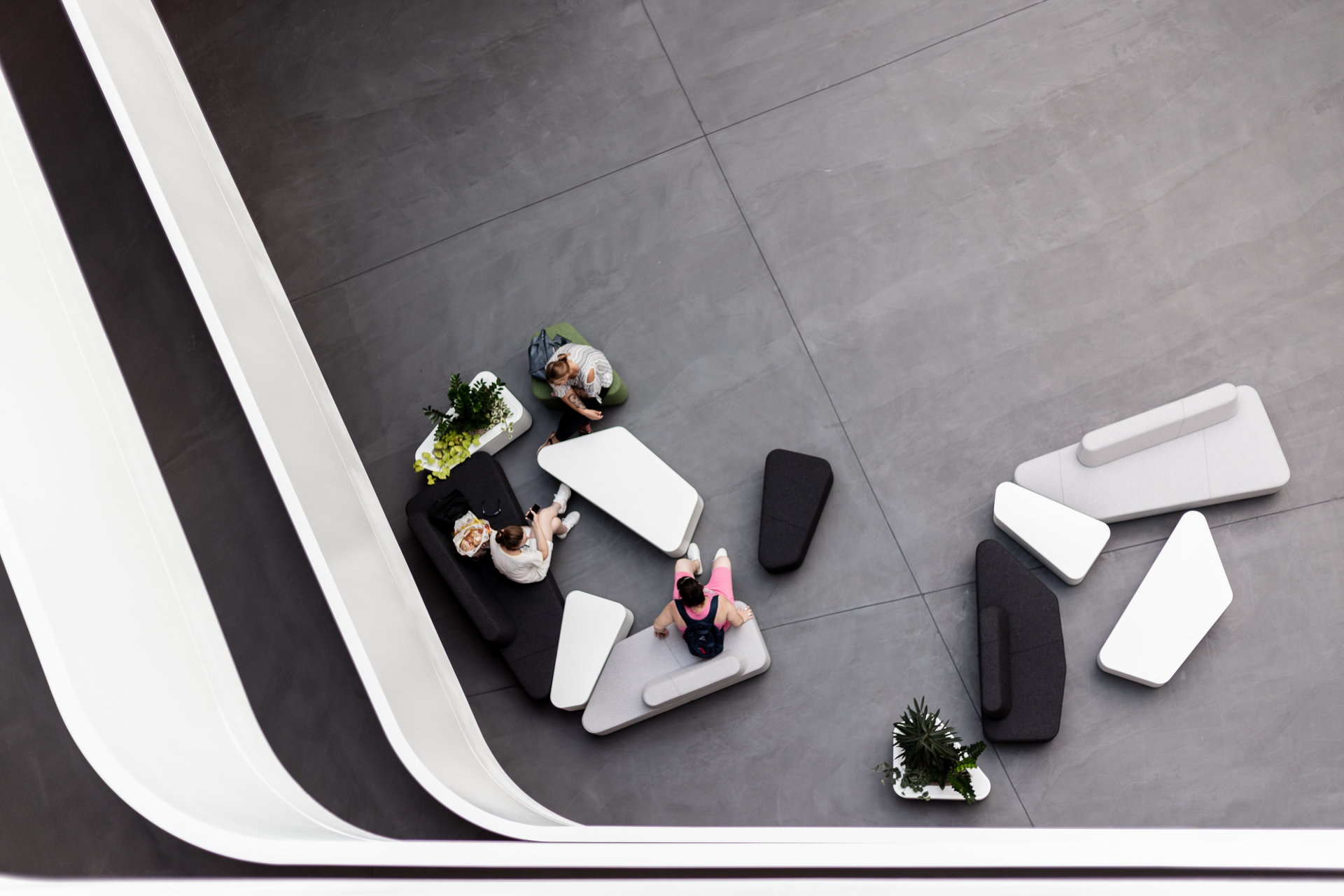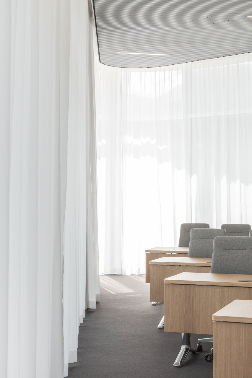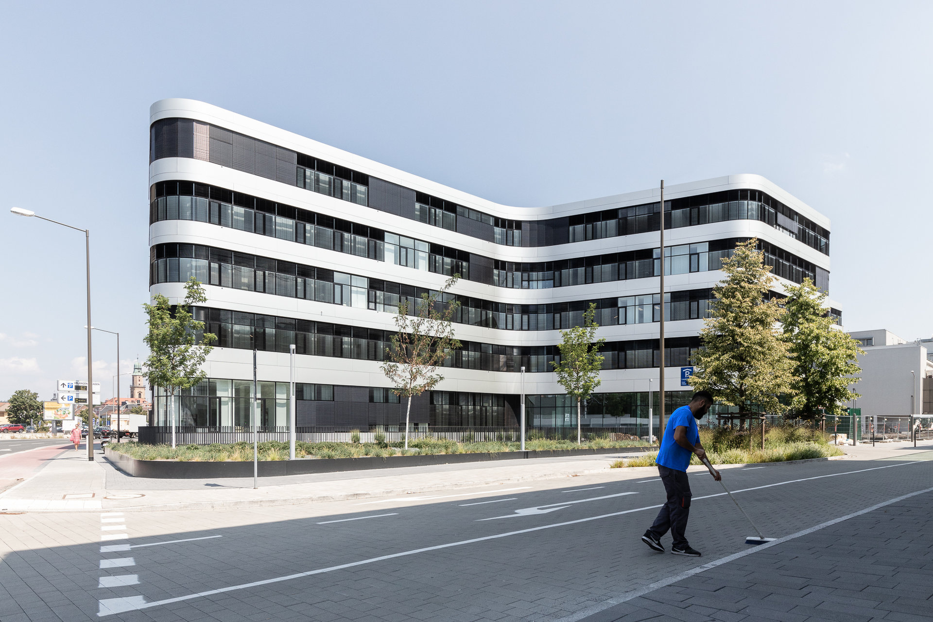 Der transparente Erdgeschoßsockel ist allseitig öffentlich zugänglich. Eine Cafeteria bietet Sitzmöglichkeiten im Innen- und Außenbereich. Über eine großzügige Freitreppe gelangt man in die oberen Stockwerke, in denen die Büroarbeitsplätze situiert sind. Die glatte Glasfassade wird um Aluminiumlamellen ergänzt. Diese schützen vor Sonneneinstrahlung und verleihen der Fassade Bewegung und Tiefe. (Text: Architekten)