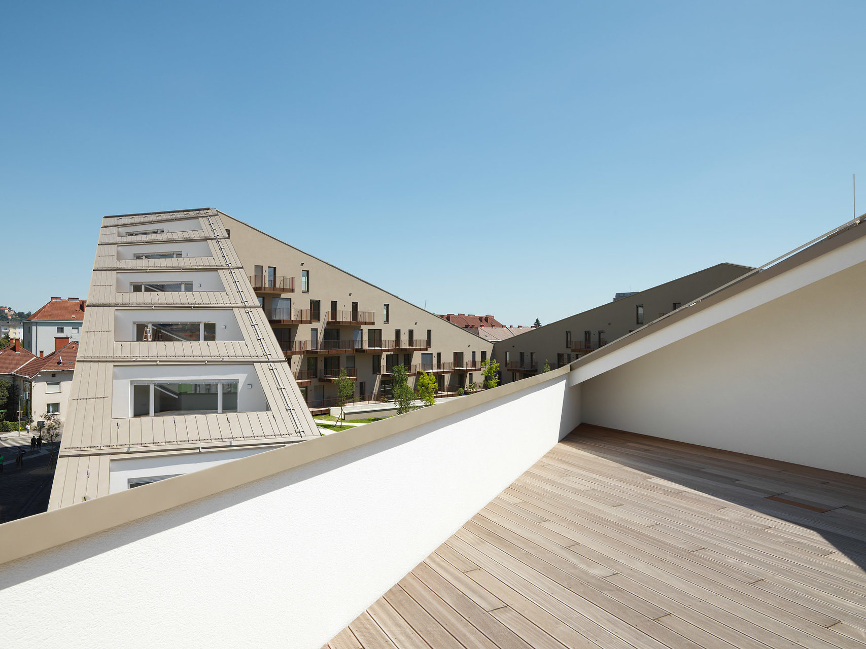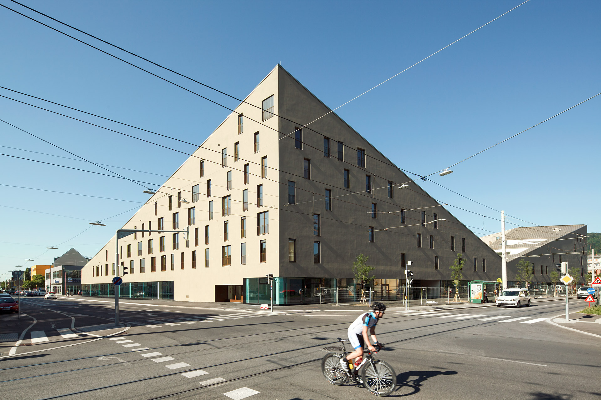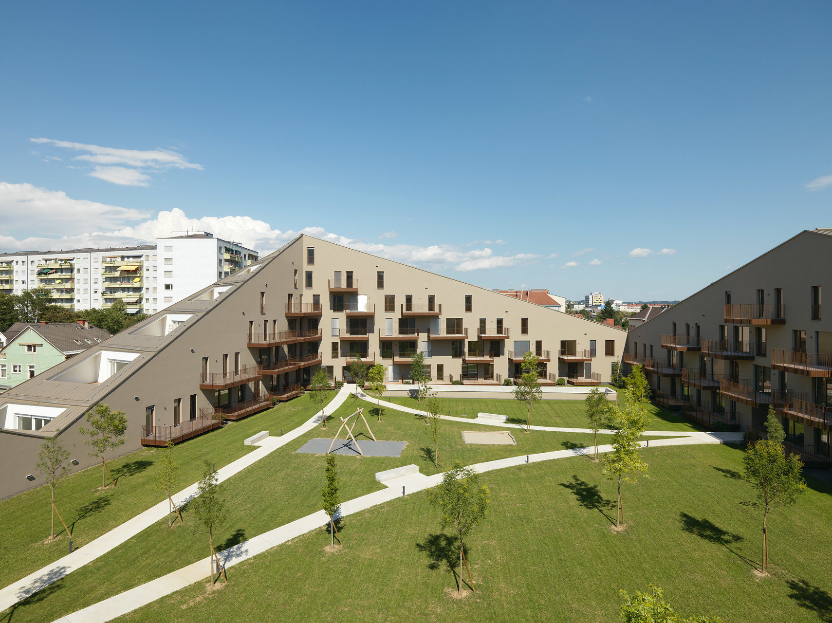 Der Stadtteil Eggenberg und die an einen Hügelzug erinnernde Silhouette geben dem Projekt seinen einprägsamen Namen. Eine intelligente Neuinterpretation des traditionellen, in Graz weit verbreiteten gründerzeitlichen Blockrandes greift gekonnt die Vorteile dieser Bebauung mit den an die Ränder verschobenen Baumassen und den dadurch frei werdenden grünen Innenhof auf. Es entsteht ein von allen Bewohnern nutzbarer „Park“ von hoher räumlicher und architektonischer Qualität, den die laute städtische Umgebung vor dem Betreten des Gebäudes nicht vermuten lässt.
