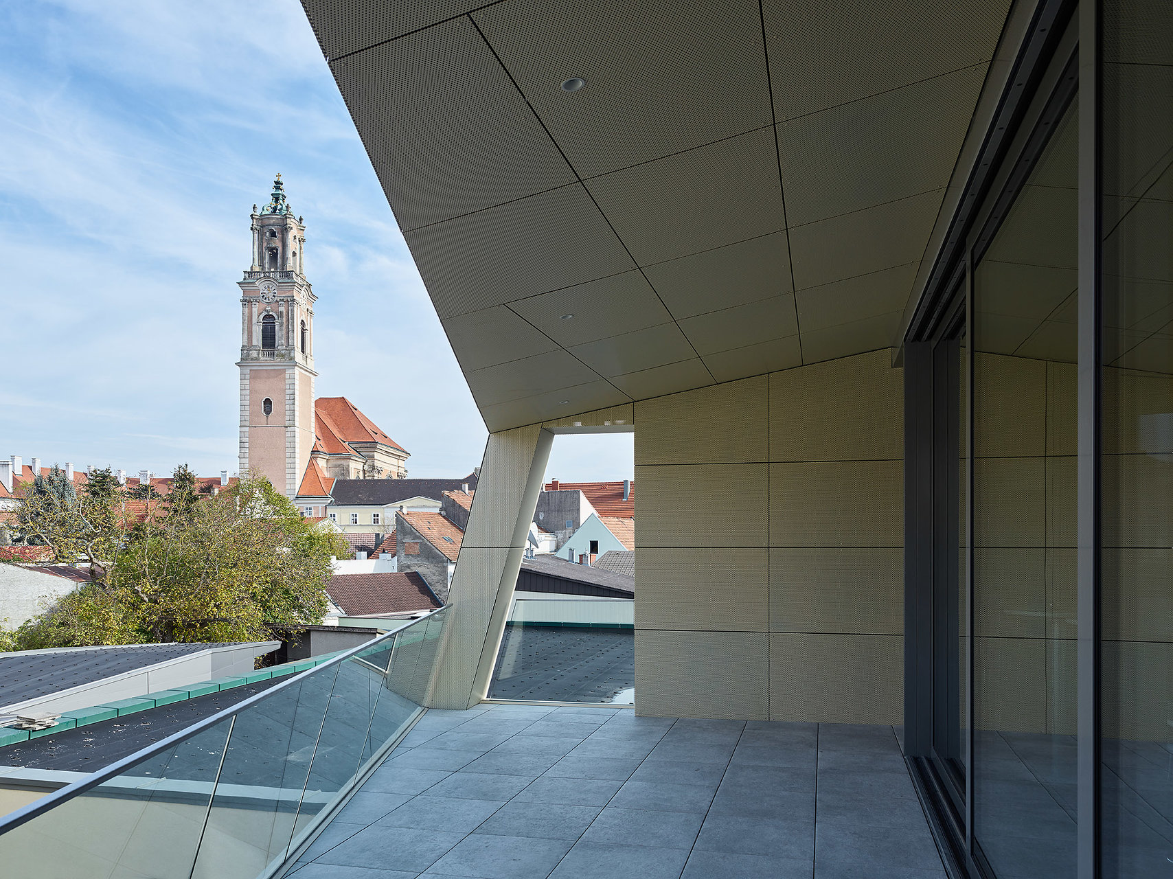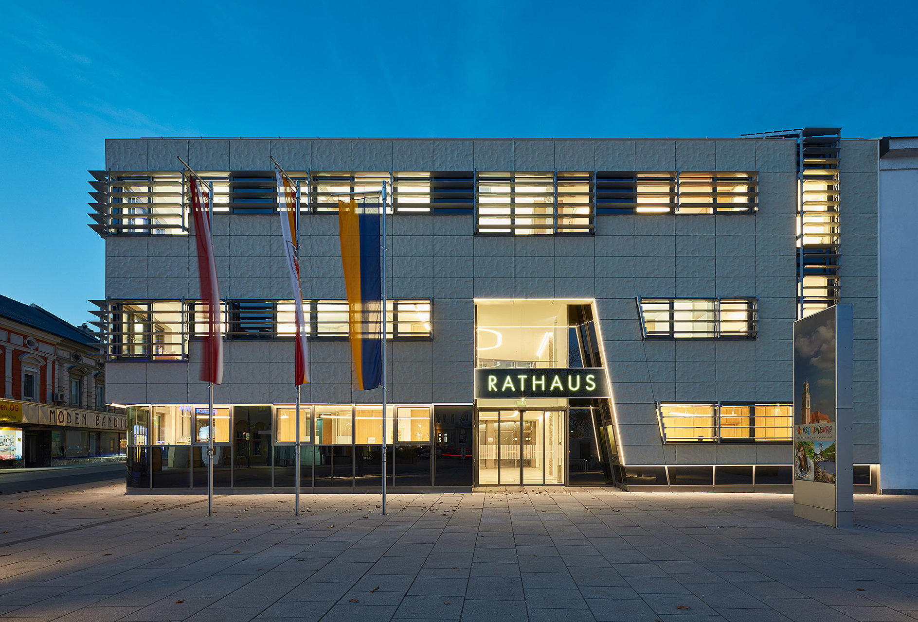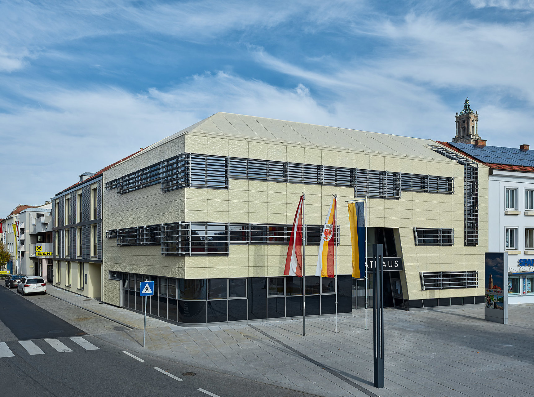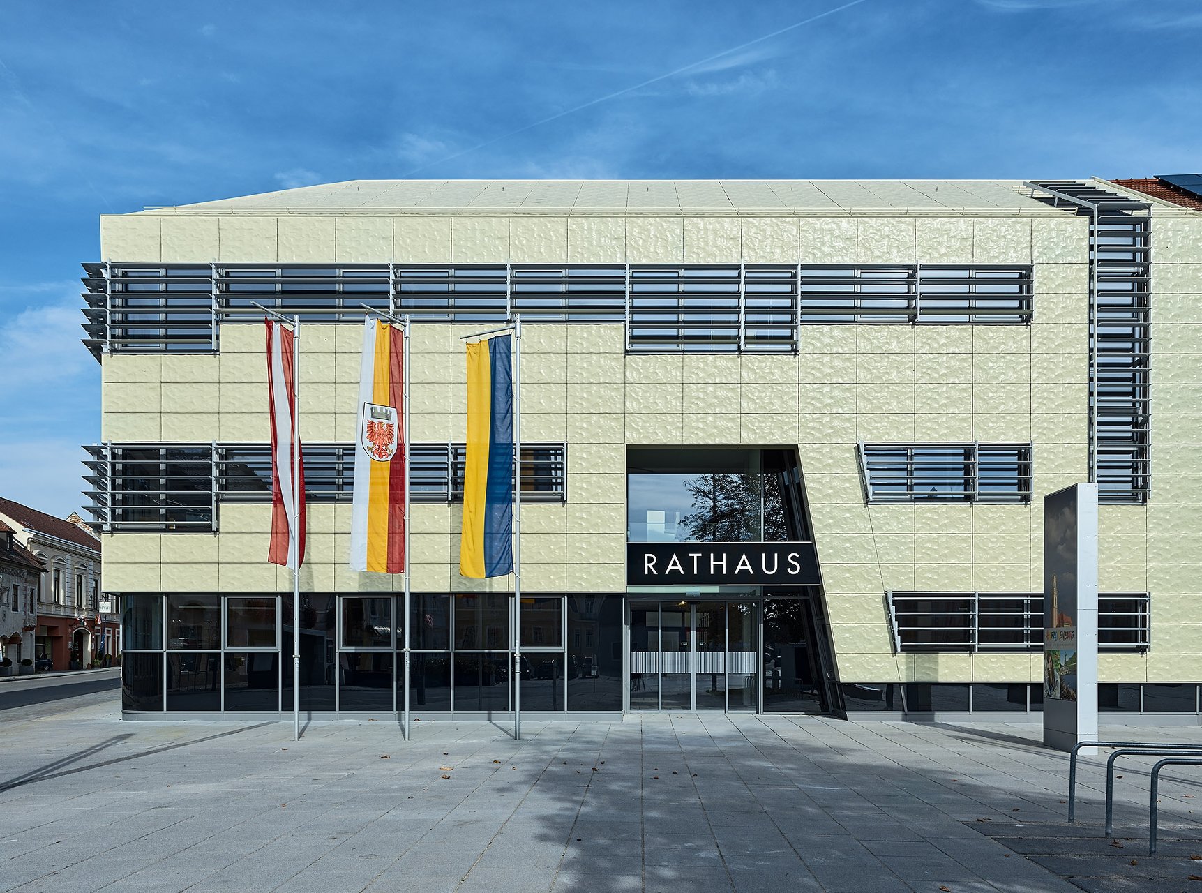 Der bestehende Trakt erhält eine neue Fassade, die aus Holzfertigteilen besteht, vor welchen Schiebeelemente aus Leichtmetall angebracht wurden. Das Volumen des Neubauteils inkl. der Dachschräge wird von einer vorgehängten Leichtmetall-Fassade eingehüllt. Diese dreidimensionale, topografische Hülle wurde aus Fassadenelementen der umgebenden Häuser der vorvorigen Jahrhundertwende hergeleitet. Die Fassadenöffnung des Hauptzuganges erstreckt sich über zwei Geschoße und wird von einer Glasspange samt Rathausaufschrift optisch zusammengehalten. (Text: Architekt, leicht gekürzt)