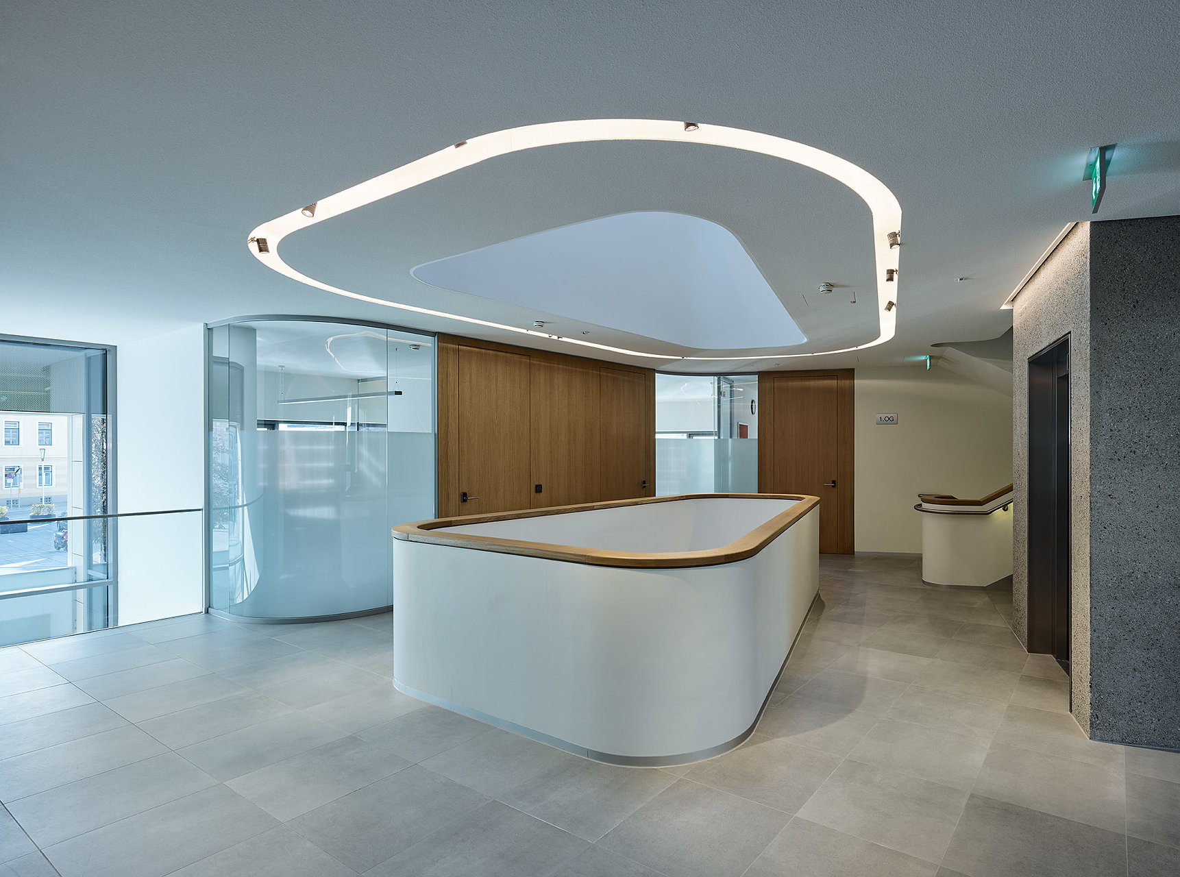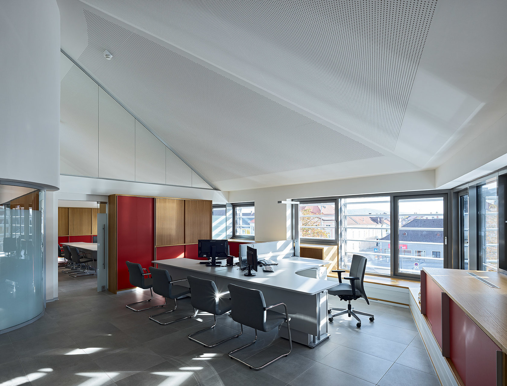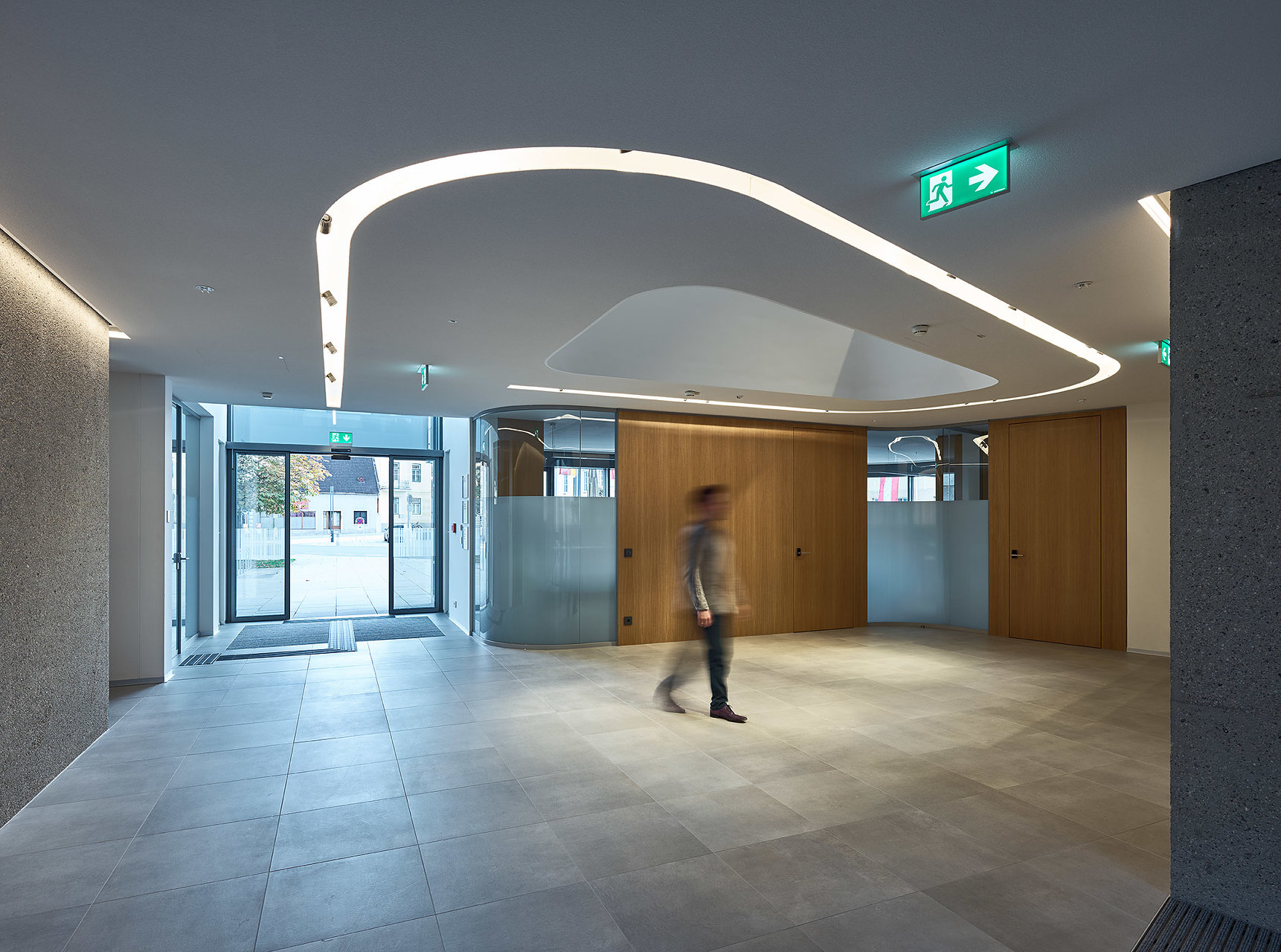 Der Haupteingang führt in eine zentrale Halle, von der aus die Amtsräumlichkeiten, Serviceeinrichtungen und die Arztordinationen erschlossen werden. Die Büros sind großzügig dimensioniert, flexibel bespielbar und durch Möbelwände, die auch als Stauräume dienen, voneinander abgetrennt. Ein Luftraum in der Mitte erstreckt sich über alle drei Geschoße und wird von einem Glasoberlicht bekrönt. Dieses Element bringt nicht nur mehr Licht, sondern verbindet auch die Geschoße zu einer räumlichen Einheit.