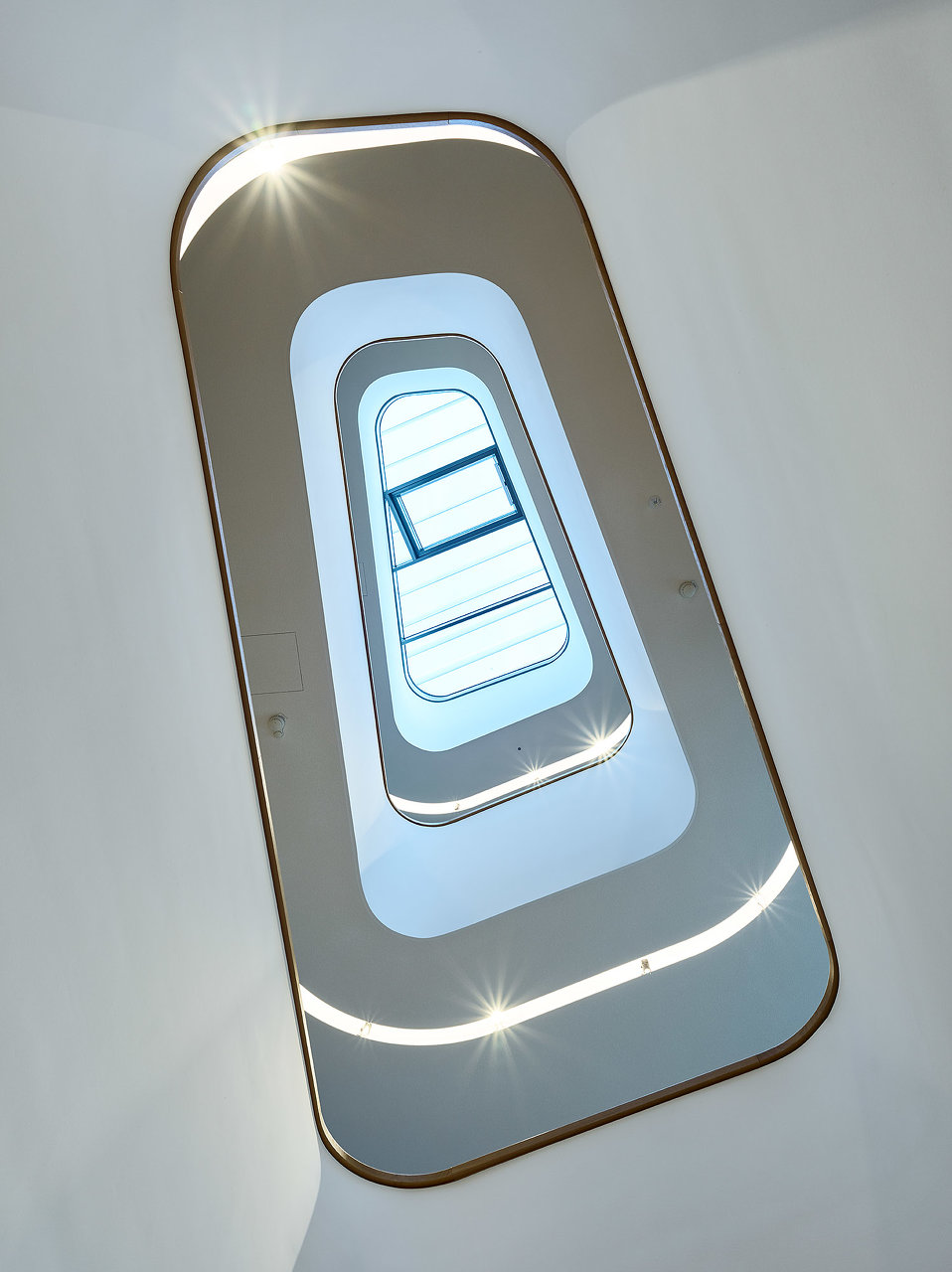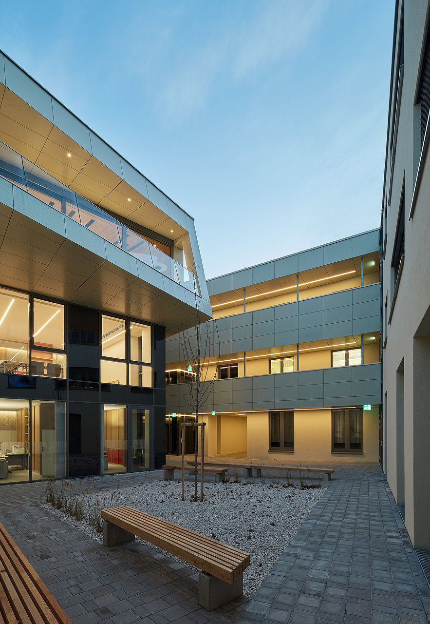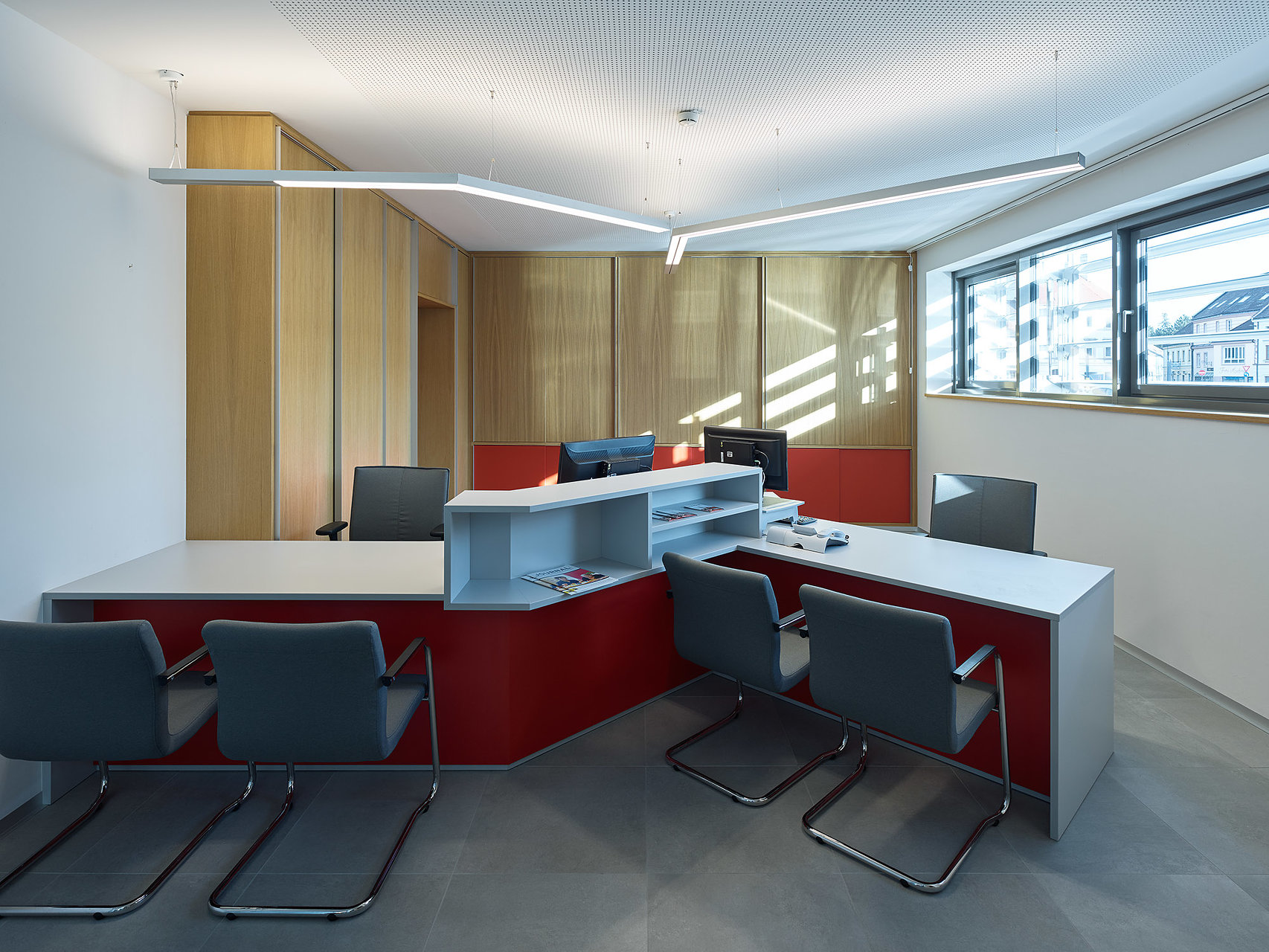 Der Haupteingang führt in eine zentrale Halle, von der aus die Amtsräumlichkeiten, Serviceeinrichtungen und die Arztordinationen erschlossen werden. Die Büros sind großzügig dimensioniert, flexibel bespielbar und durch Möbelwände, die auch als Stauräume dienen, voneinander abgetrennt. Ein Luftraum in der Mitte erstreckt sich über alle drei Geschoße und wird von einem Glasoberlicht bekrönt. Dieses Element bringt nicht nur mehr Licht, sondern verbindet auch die Geschoße zu einer räumlichen Einheit.