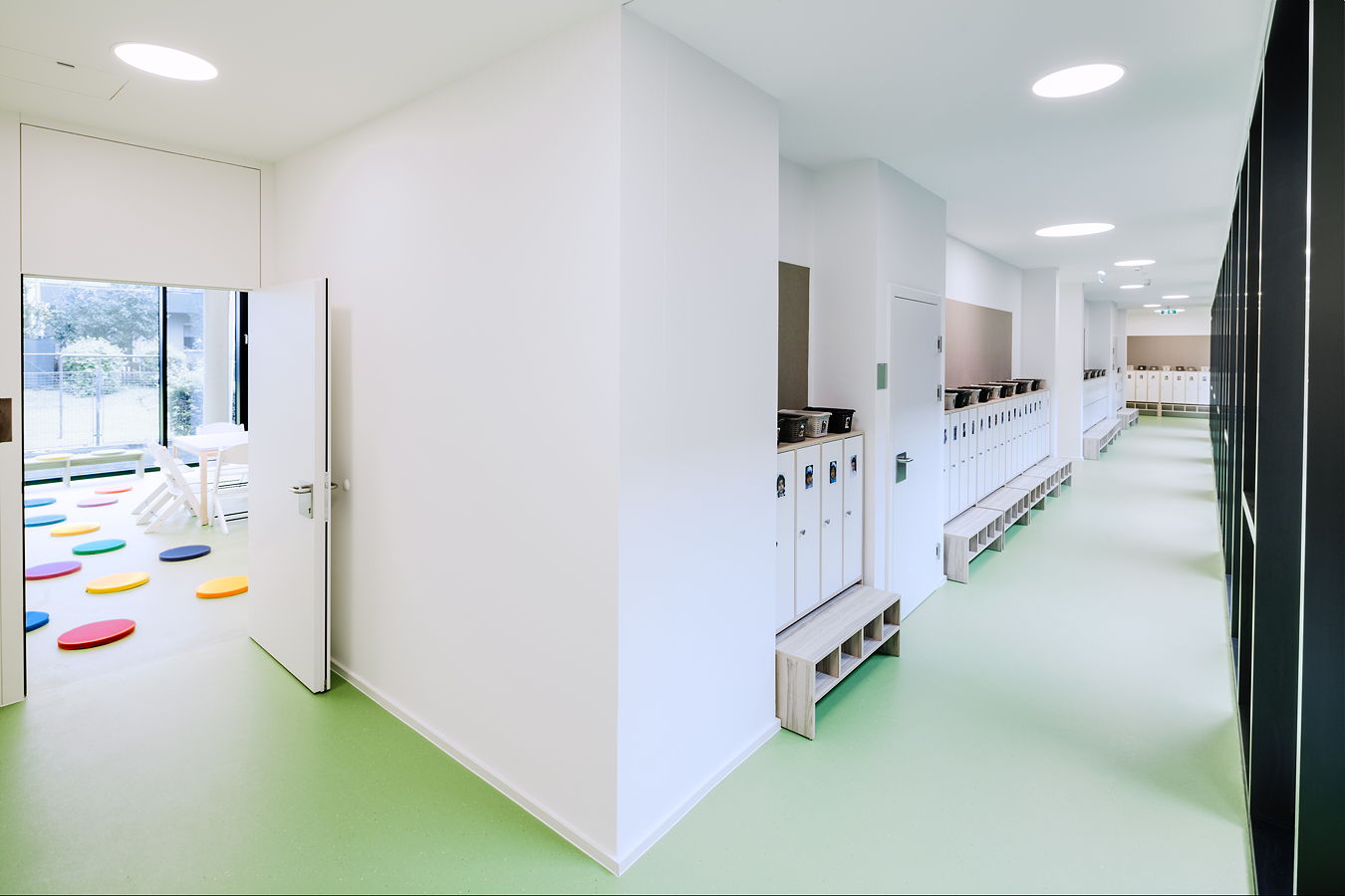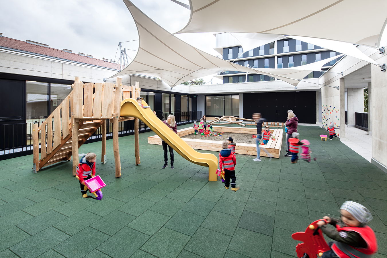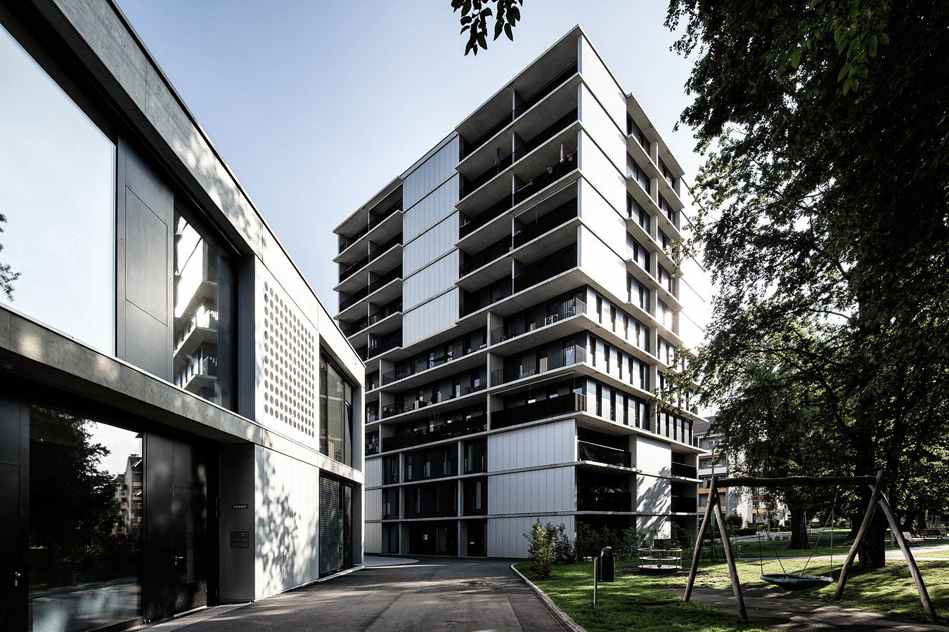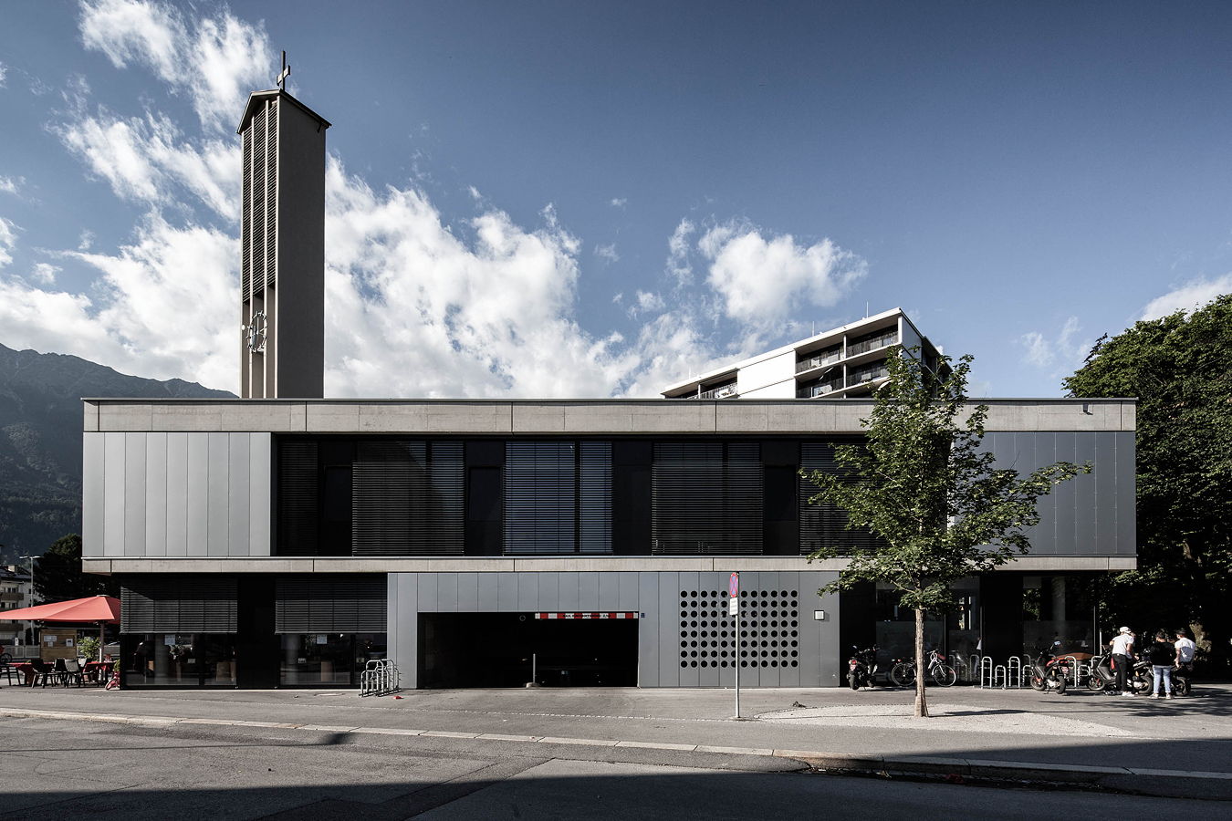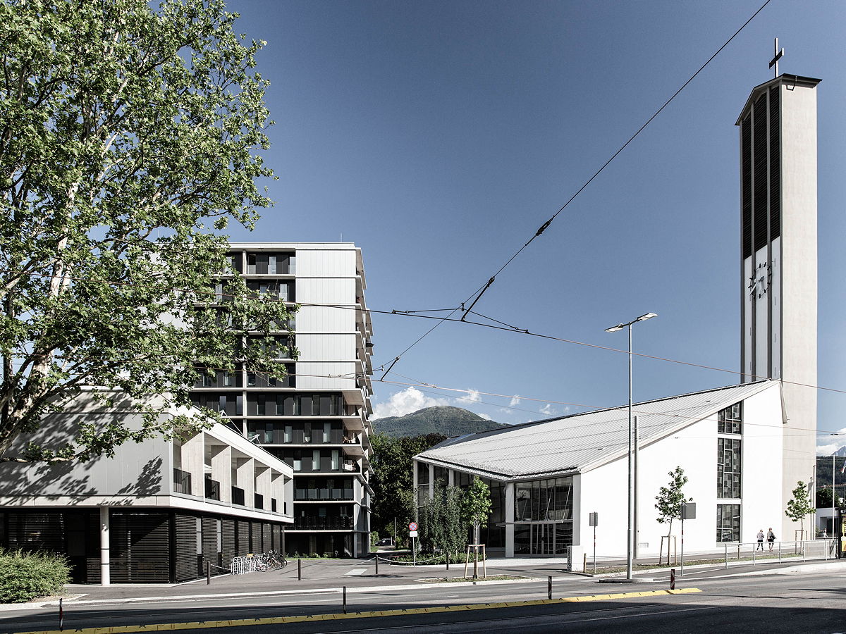 Marte.Marte Architekten, die 2012 als Sieger aus dem geladenen Architekturwettbewerb hervorgegangen sind, bringen das umfassende Raumprogramm in drei locker rund um die Kirche angeordneten Gebäuden unter. In einem parallel zur Kirche platzierten zweigeschossigen Baukörper befinden sich die Räume für die Pfarrgemeinde, aber auch das Jugendzentrum und ein zur Reichenauerstraße geöffnetes Café. Im Osten entstand für Kindergarten und -krippe ein ebenfalls zweigeschossiges, eigenständiges „Kinderhaus“ mit Dachgarten. Einen städtebaulichen Akzent setzt der hinter der Kirche errichtete würfelförmige Wohnbaukörper, in dem sich auf elf Geschossen Mietwohnungen und die geforderten Einheiten für betreutes Wohnen befinden.