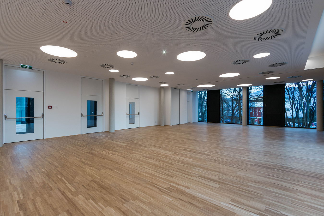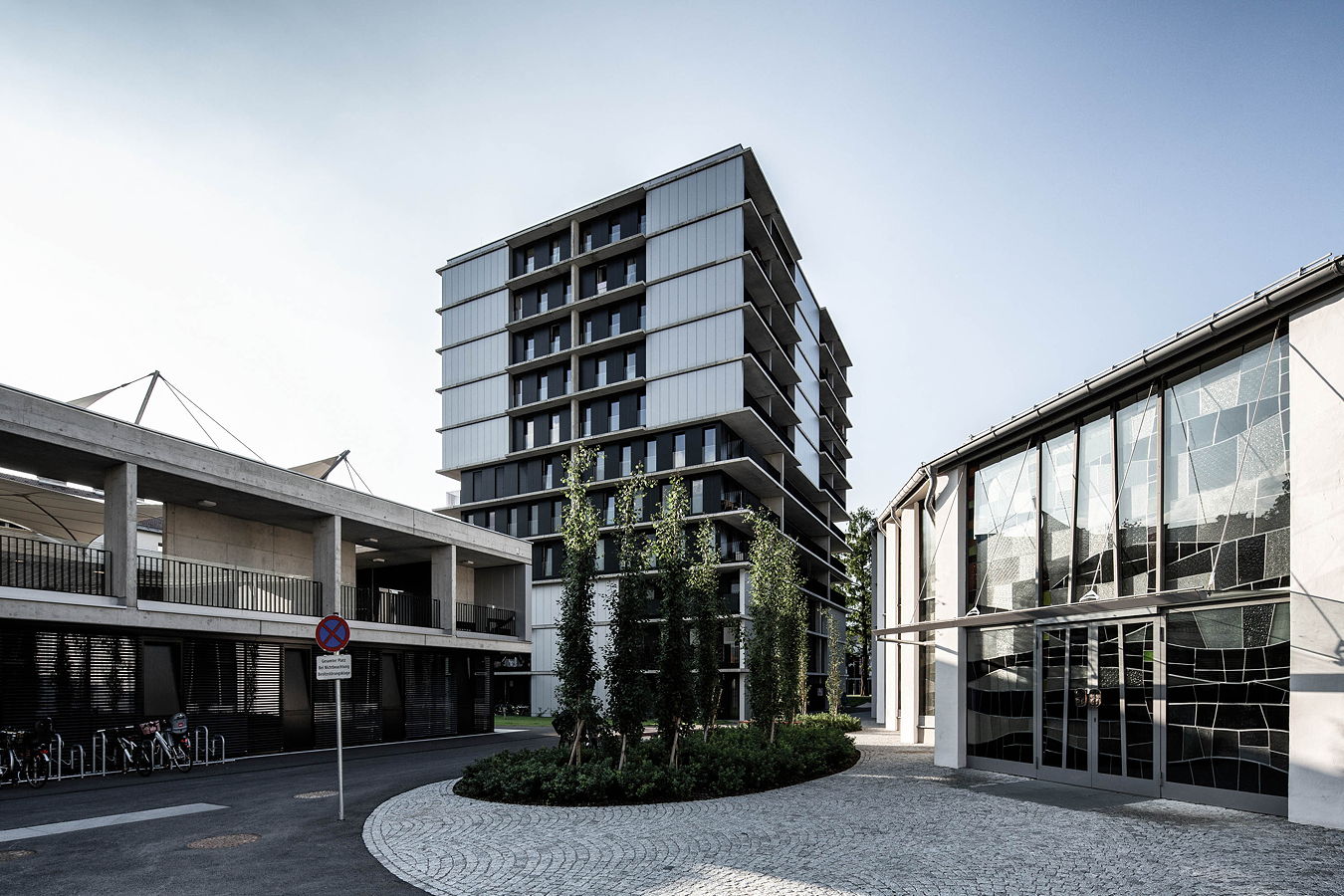 Das äußere Erscheinungsbild bestimmen helle Sichtbetonflächen mit großen Fensterelementen in Schwarzgrau sowie Fassadenelemente in natureloxiertem Aluminium. Durch die einheitliche Materialisierung wurde trotz der unterschiedlichsten Nutzungsanforderungen ein homogenes Ensemble geschaffen. Besondere Aufmerksamkeit wurde auf die Freiflächen zwischen den Gebäuden gelegt, die fließend in den öffentlichen Park übergehen.