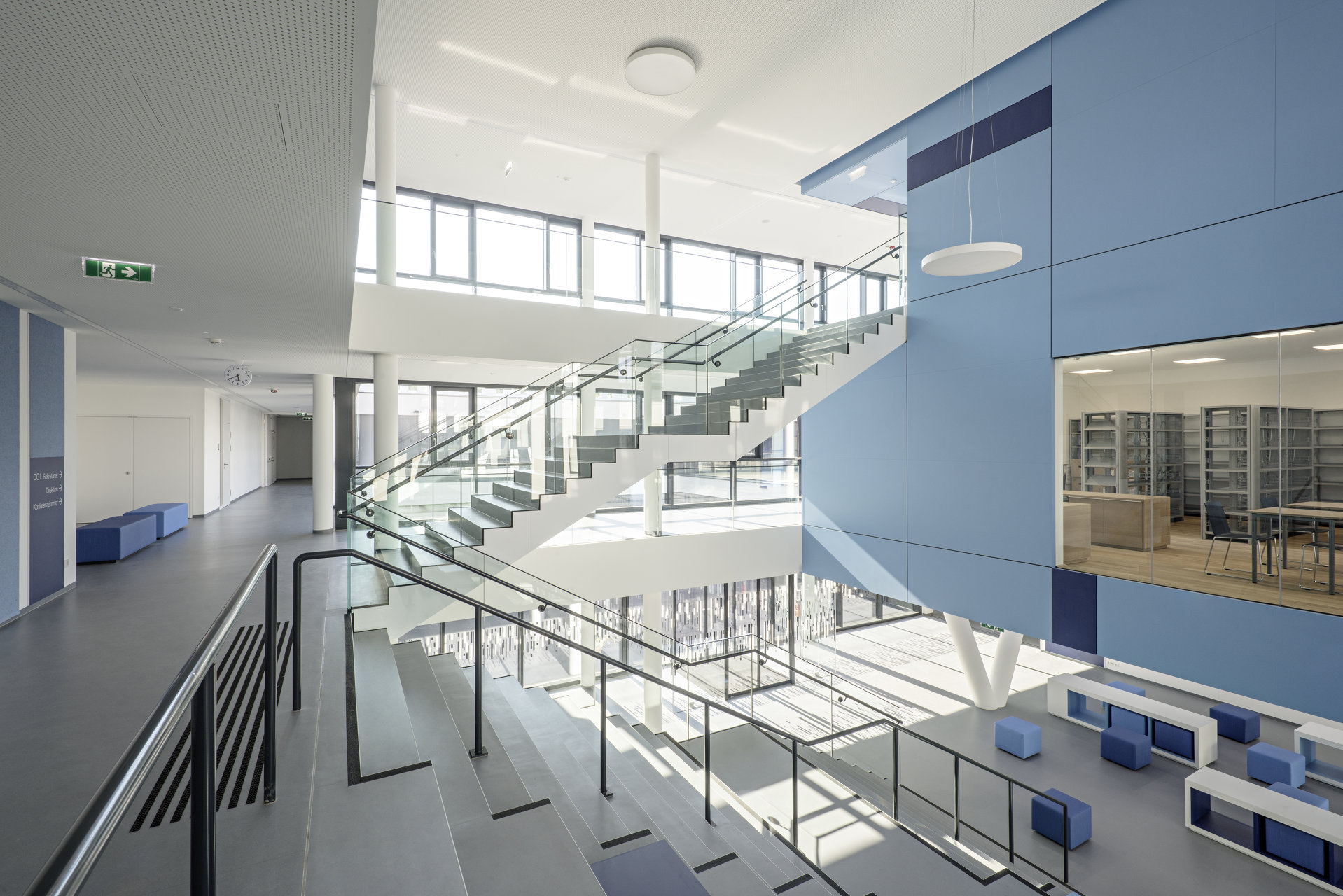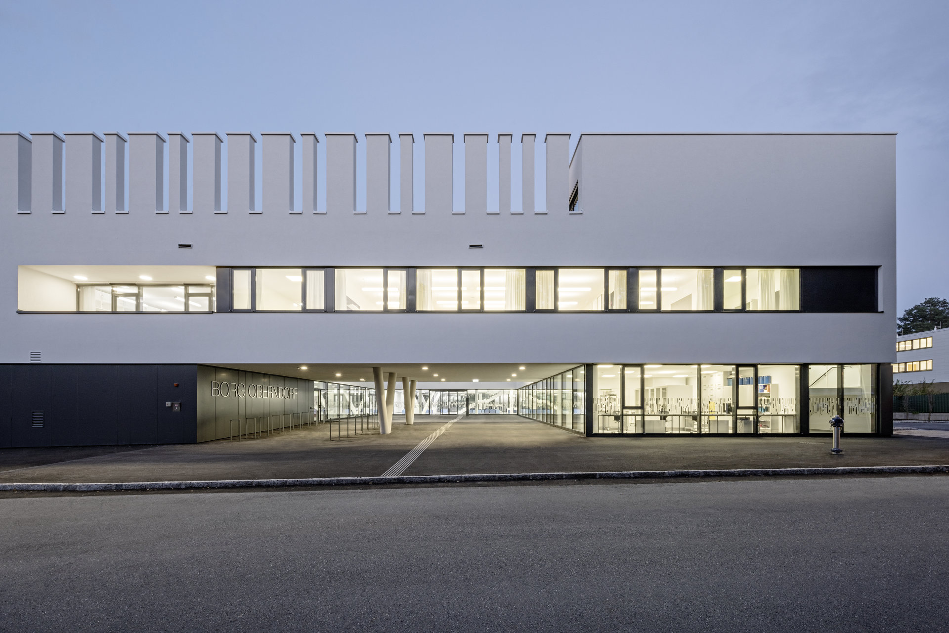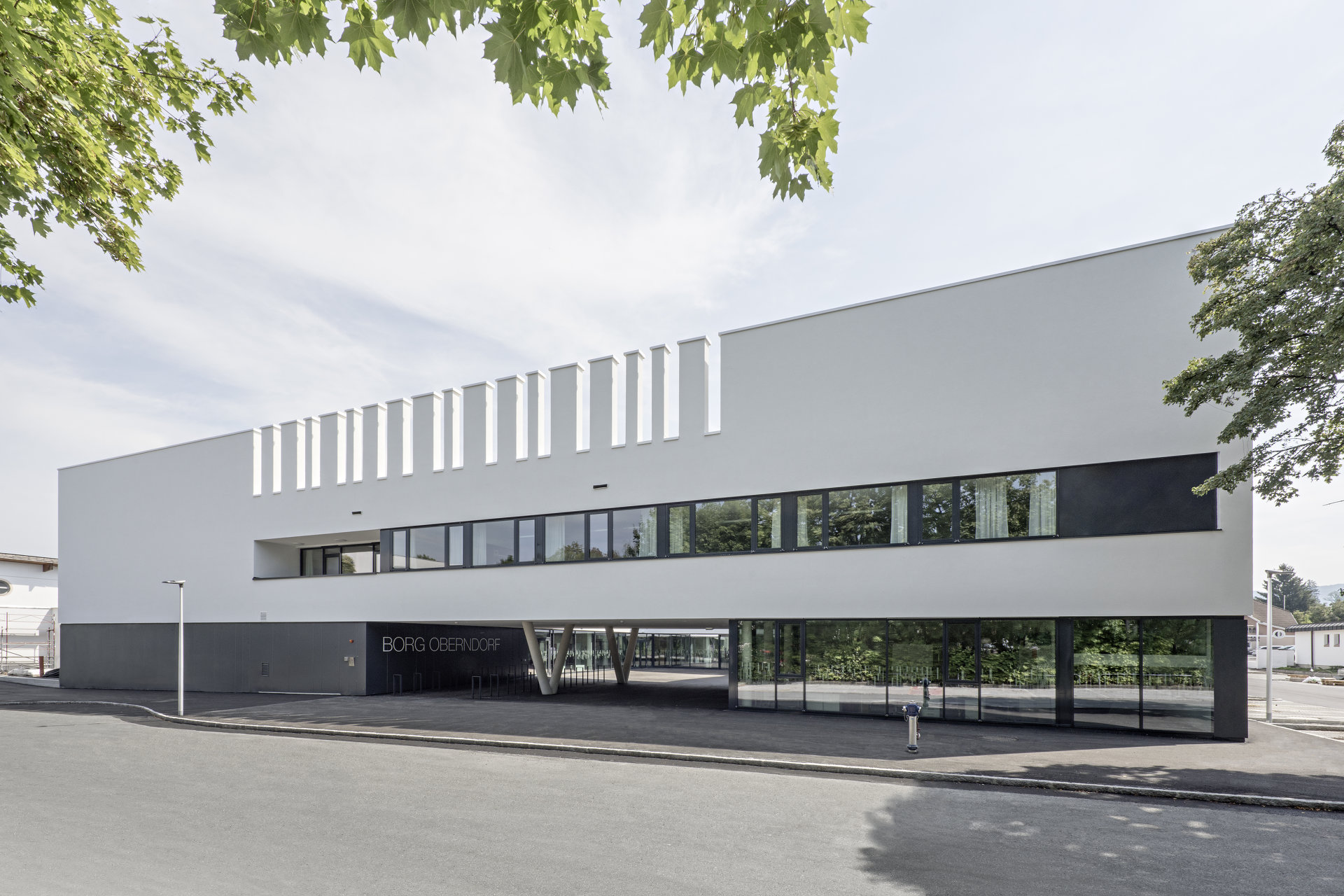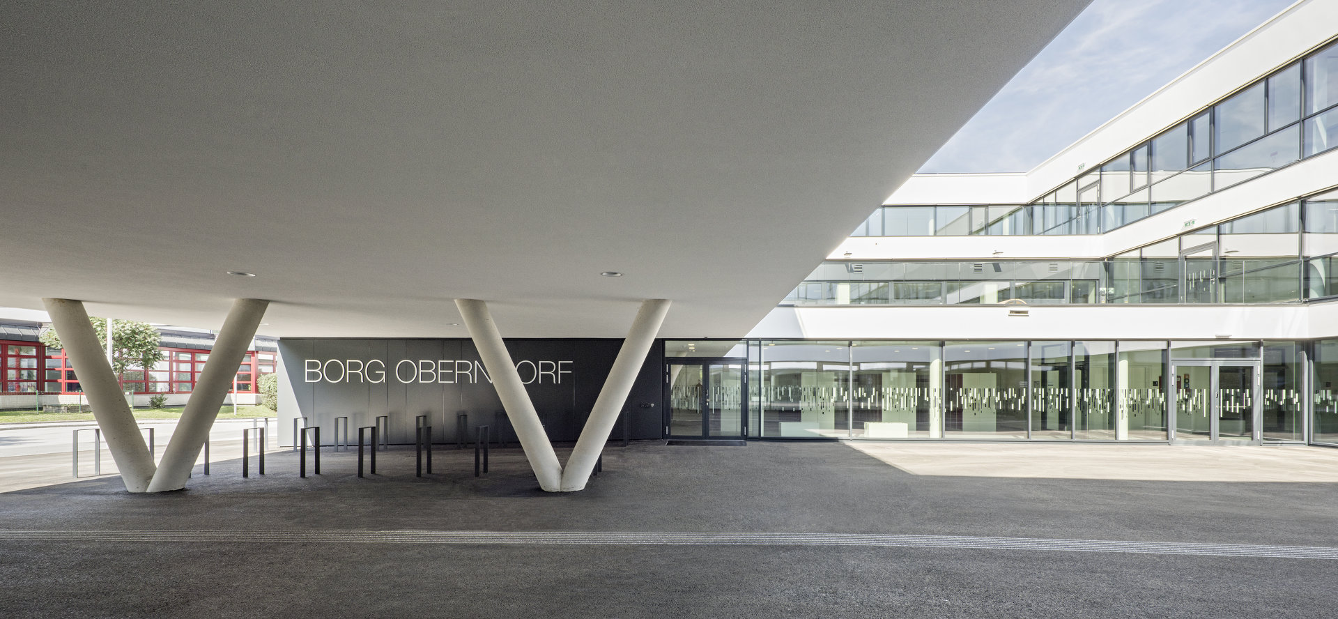 Um einen zentralen Innenhof gruppieren sich die Räumlichkeiten des neuen Bundesoberstufenrealgymnasiums in Oberndorf. Die zweigeschoßige Eingangshalle erweitert die Treppe in die oberen Stockwerke zu Sitz- und Aufenthaltsräumen, die vielfältig genutzt werden können. In diese Aula ist die Bibliothek als zentraler Ort von Wissen und Wissensaneignung im ersten Obergeschoß sichtbar als Kubus eingeschoben. Terrassen auf verschiedenen Ebenen bieten Platz für Unterricht im Freien und komplettieren das differenzierte Grundrisskonzept. Auf Seiten der Ökologie konnten mit der beinahe gleichzeitigen Errichtung des Rathauses Synergien wie die gemeinsame Nutzung einer Grundwasserwärmepumpe zum Heizen und Kühlen gehoben werden. (Text: Staatspreis Architektur & Nachhaltigkeit 2019)