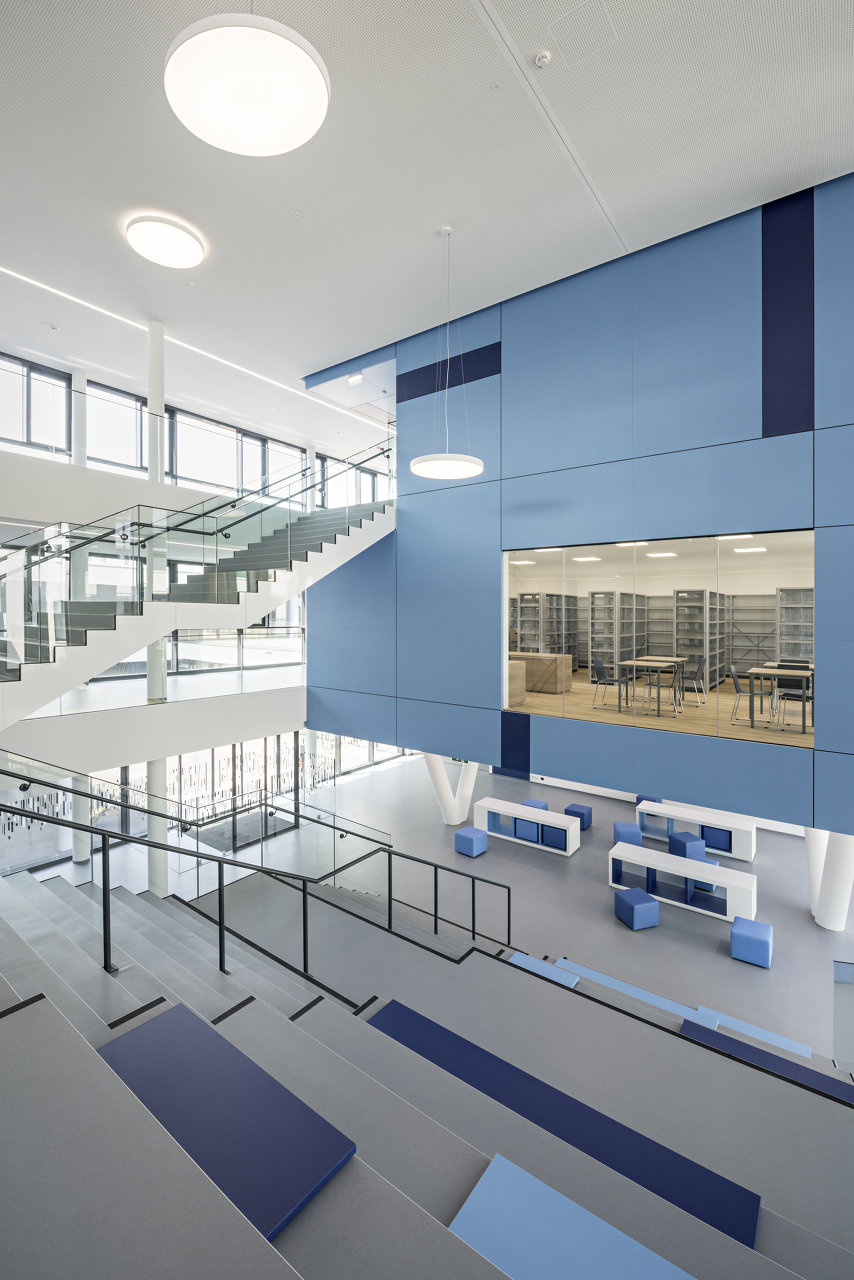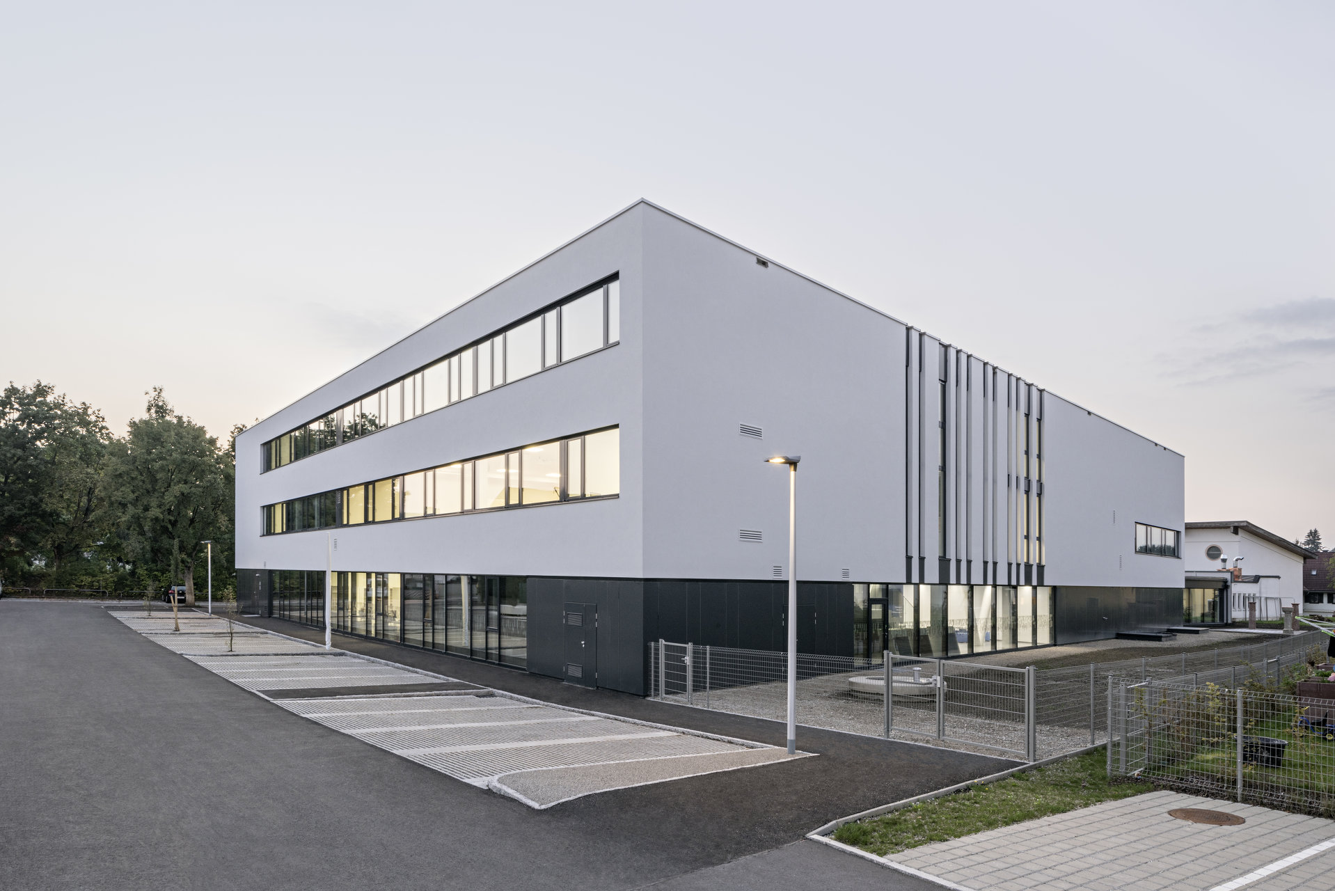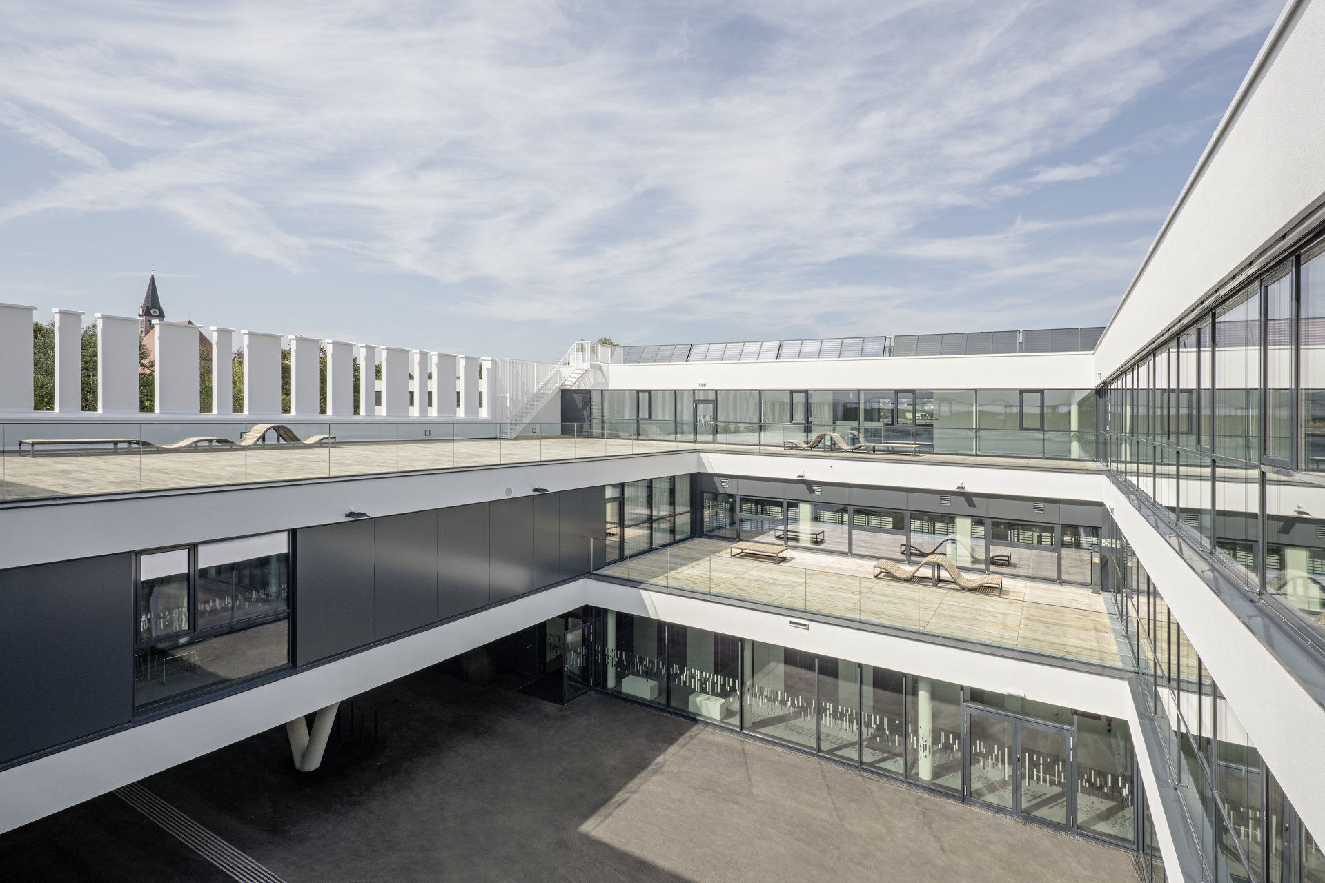 Um einen zentralen Innenhof gruppieren sich die Räumlichkeiten des neuen Bundesoberstufenrealgymnasiums in Oberndorf. Die zweigeschoßige Eingangshalle erweitert die Treppe in die oberen Stockwerke zu Sitz- und Aufenthaltsräumen, die vielfältig genutzt werden können. In diese Aula ist die Bibliothek als zentraler Ort von Wissen und Wissensaneignung im ersten Obergeschoß sichtbar als Kubus eingeschoben. Terrassen auf verschiedenen Ebenen bieten Platz für Unterricht im Freien und komplettieren das differenzierte Grundrisskonzept. Auf Seiten der Ökologie konnten mit der beinahe gleichzeitigen Errichtung des Rathauses Synergien wie die gemeinsame Nutzung einer Grundwasserwärmepumpe zum Heizen und Kühlen gehoben werden. (Text: Staatspreis Architektur & Nachhaltigkeit 2019)