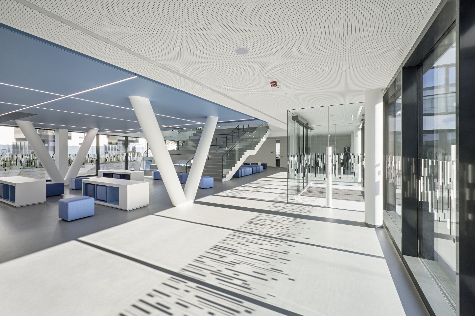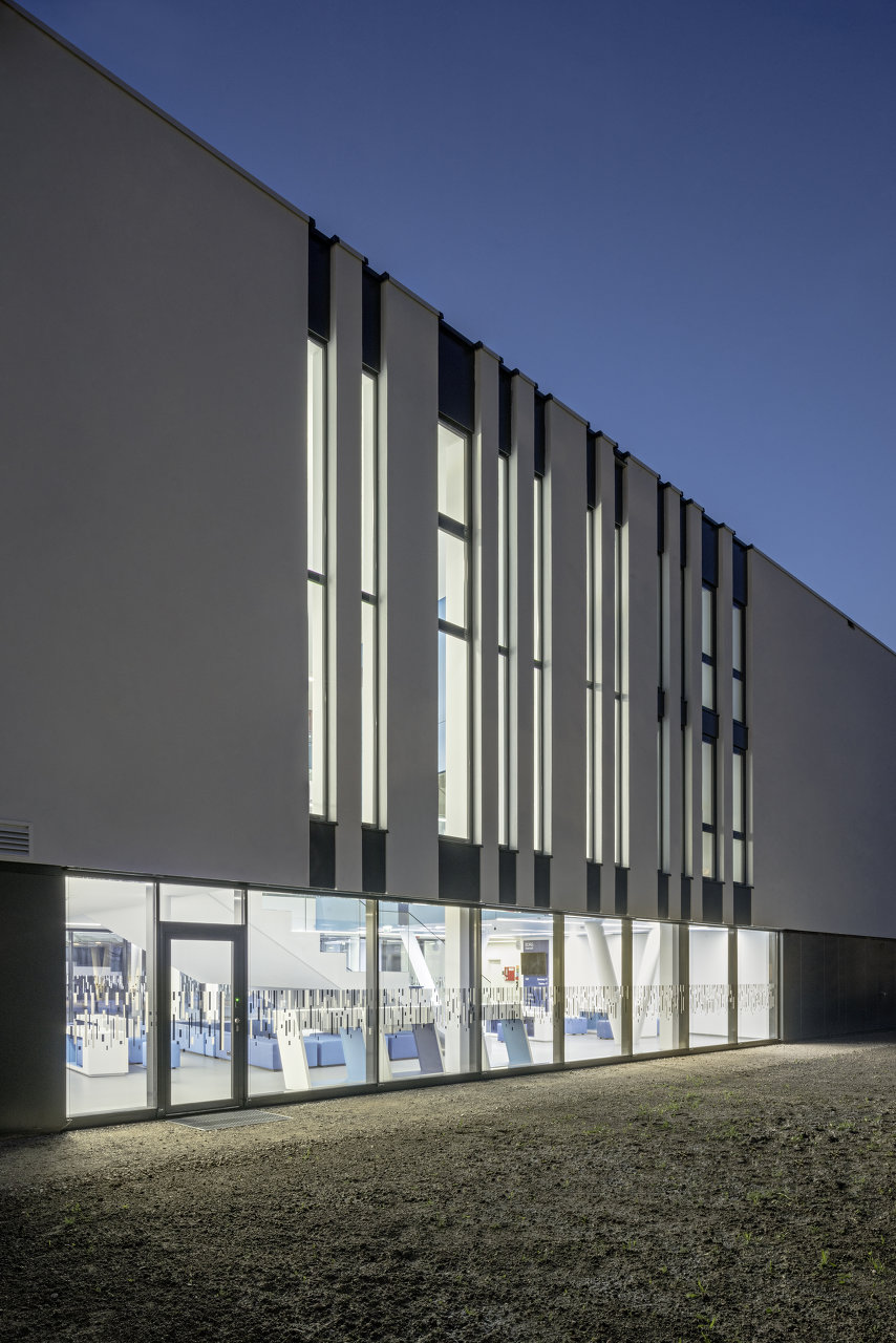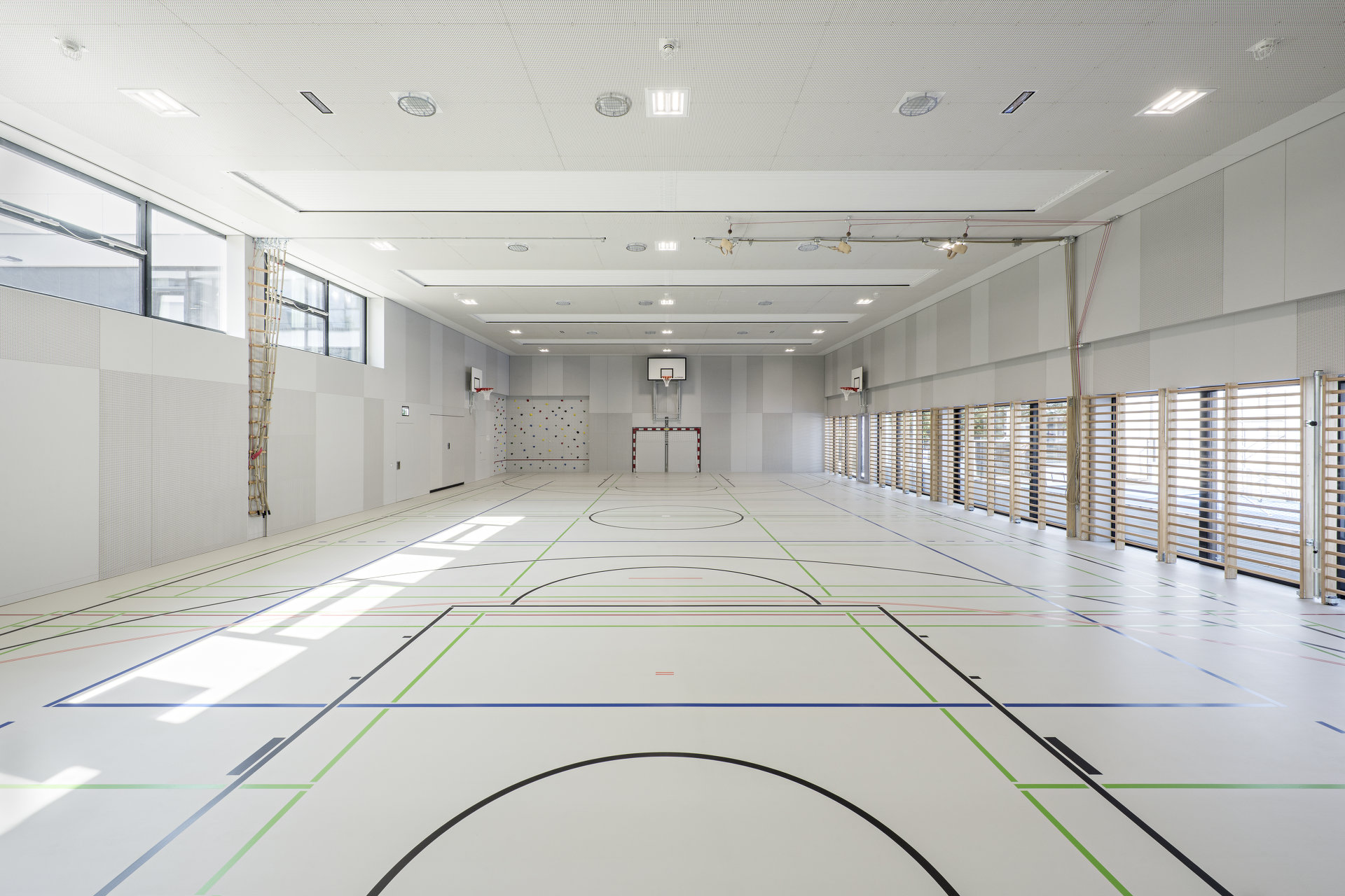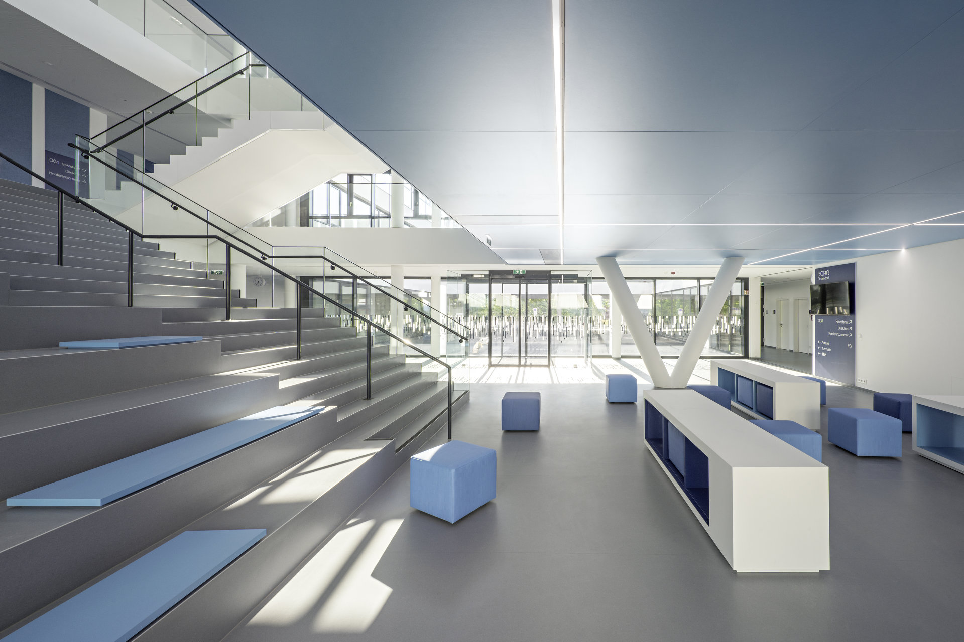 Um einen zentralen Innenhof gruppieren sich die Räumlichkeiten des neuen Bundesoberstufenrealgymnasiums in Oberndorf. Die zweigeschoßige Eingangshalle erweitert die Treppe in die oberen Stockwerke zu Sitz- und Aufenthaltsräumen, die vielfältig genutzt werden können. In diese Aula ist die Bibliothek als zentraler Ort von Wissen und Wissensaneignung im ersten Obergeschoß sichtbar als Kubus eingeschoben. Terrassen auf verschiedenen Ebenen bieten Platz für Unterricht im Freien und komplettieren das differenzierte Grundrisskonzept. Auf Seiten der Ökologie konnten mit der beinahe gleichzeitigen Errichtung des Rathauses Synergien wie die gemeinsame Nutzung einer Grundwasserwärmepumpe zum Heizen und Kühlen gehoben werden. (Text: Staatspreis Architektur & Nachhaltigkeit 2019)