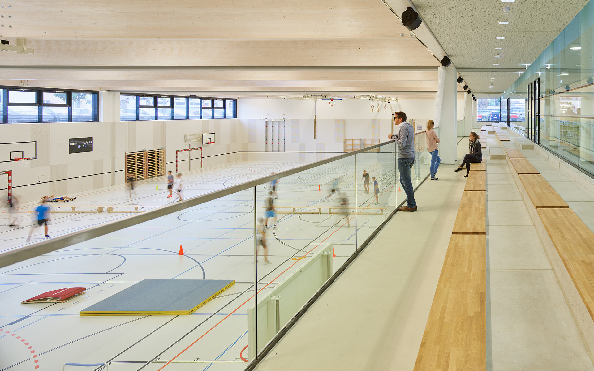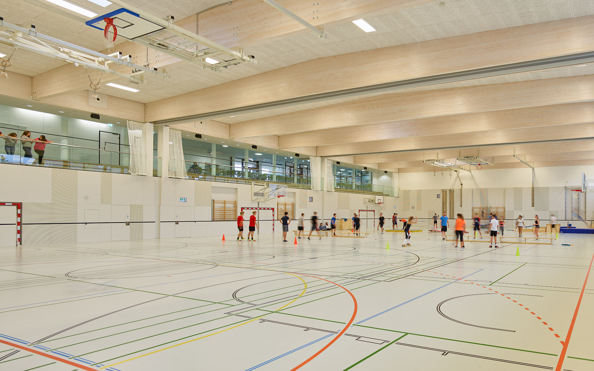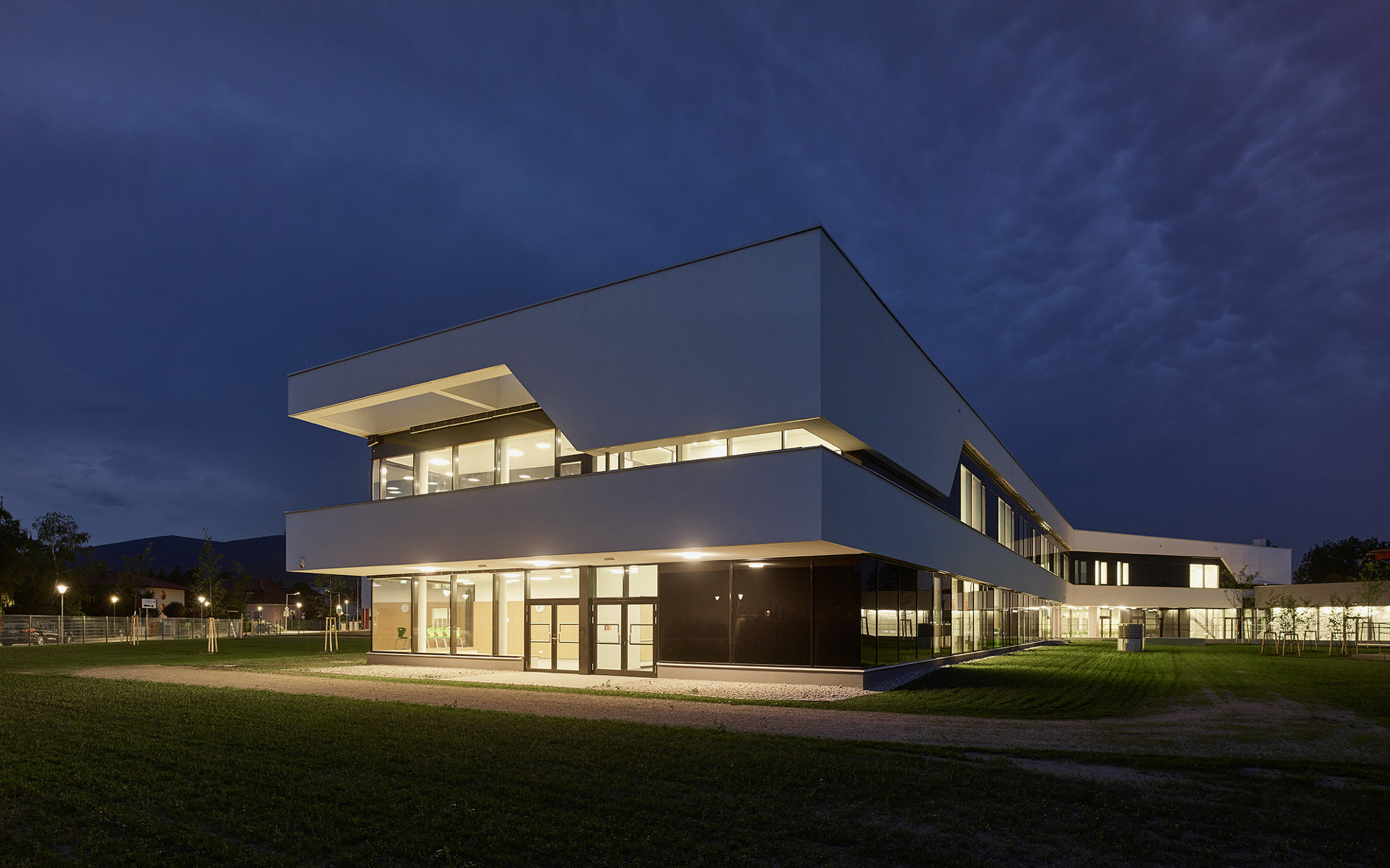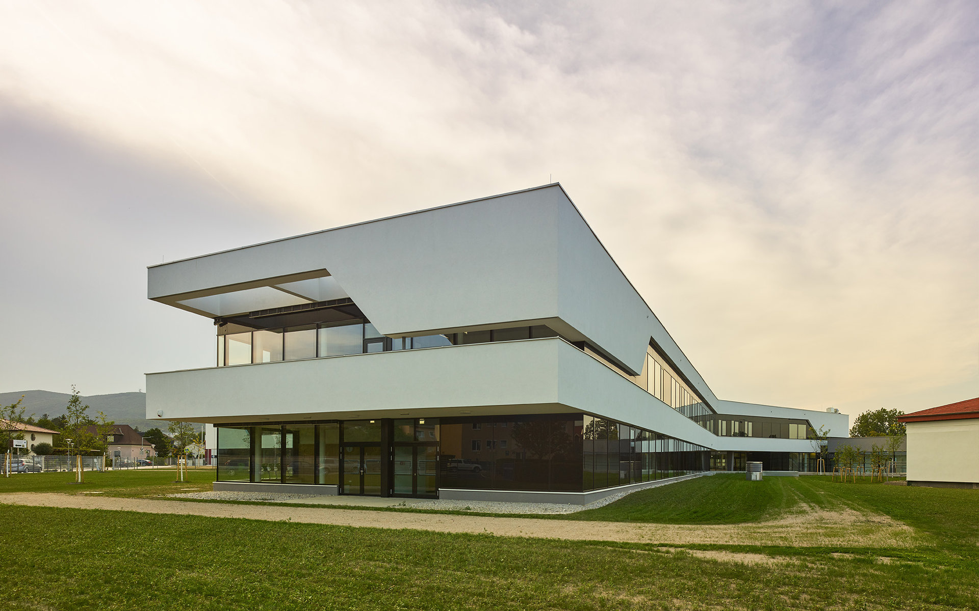 Gleich den Fingern einer sich öffnenden Hand erstreckt sich die dreiflügelige Schulanlage auf dem Bauplatz. Durch ihre sternförmige Gebäudekonfiguration verzahnt sie sich mit ihrer unmittelbaren Umgebung, schafft eine schlüssige Verbindung zur benachbarten Neuen Mittelschule (NMS) und öffnet sich zur Gemeinde und dem umliegenden Außenraum.Der Schulkomplex mit 16 Stammklassen entspricht mit seiner 2-Geschossigkeit dem umgebenden städtebaulichen Maßstab und schafft mit dem zum Zentrum hin verdichteten Profil weiträumige Frei- und Grünräume mit Aufenthaltsqualität. Die Formulierung des Gebäudekörpers resultiert aus dem Anspruch einer übersichtlichen und gut überschaubaren Gesamtstruktur sowie kurzen Erschließungswegen von gleichzeitig hoher und raumhafter Qualität. Eine Schnittstelle mit der unmittelbar anliegenden NMS bildet die Nachmittagsbetreuung, der Speisesaal und die 3-fach Turnhalle, die im nördlichen Gebäudeflügel angesiedelt wurde, um für beide Schulen gute Erreichbarkeit zu gewährleisten.