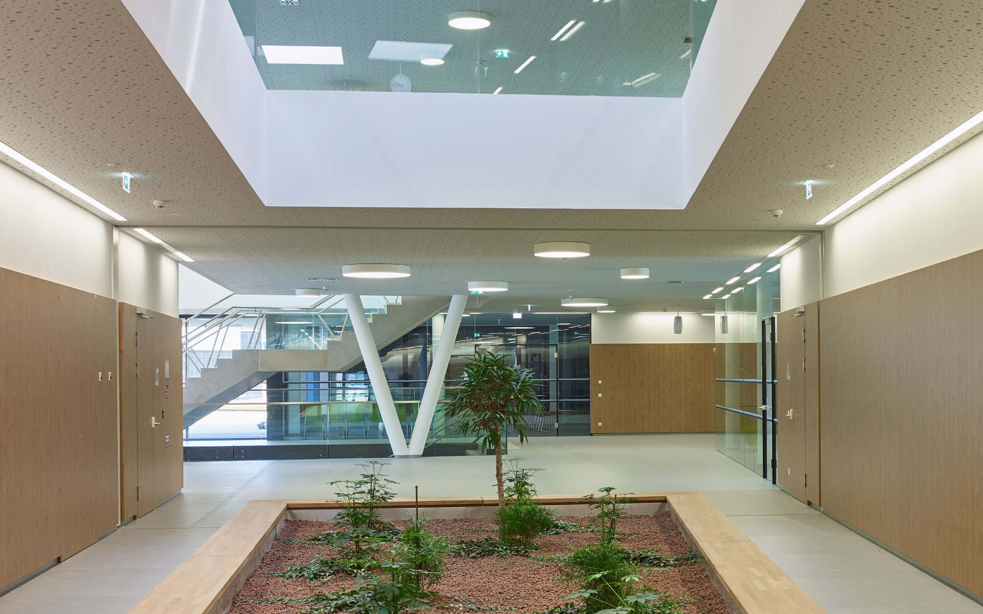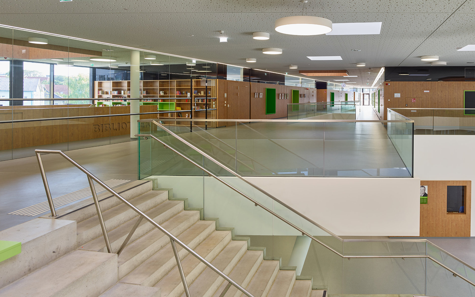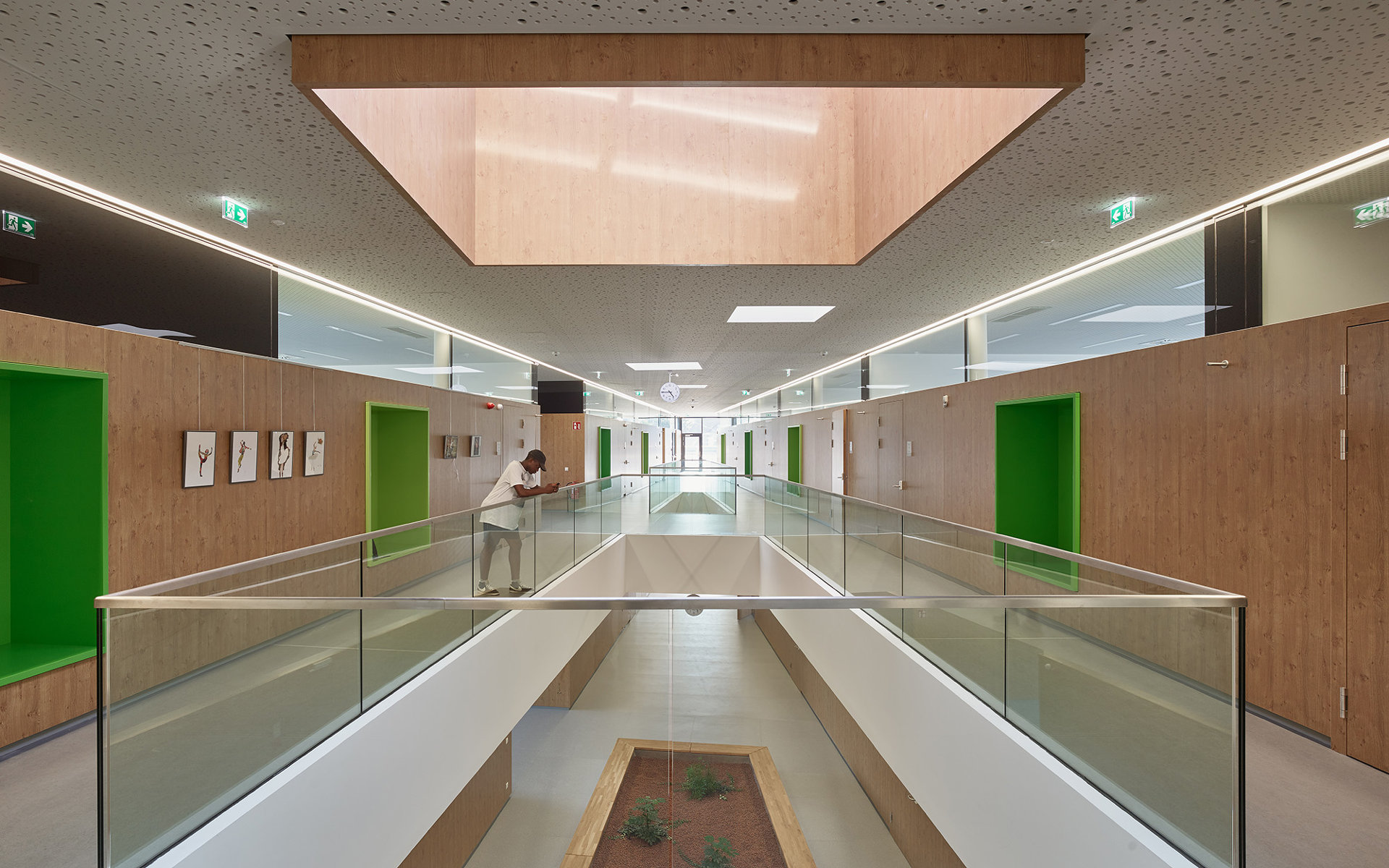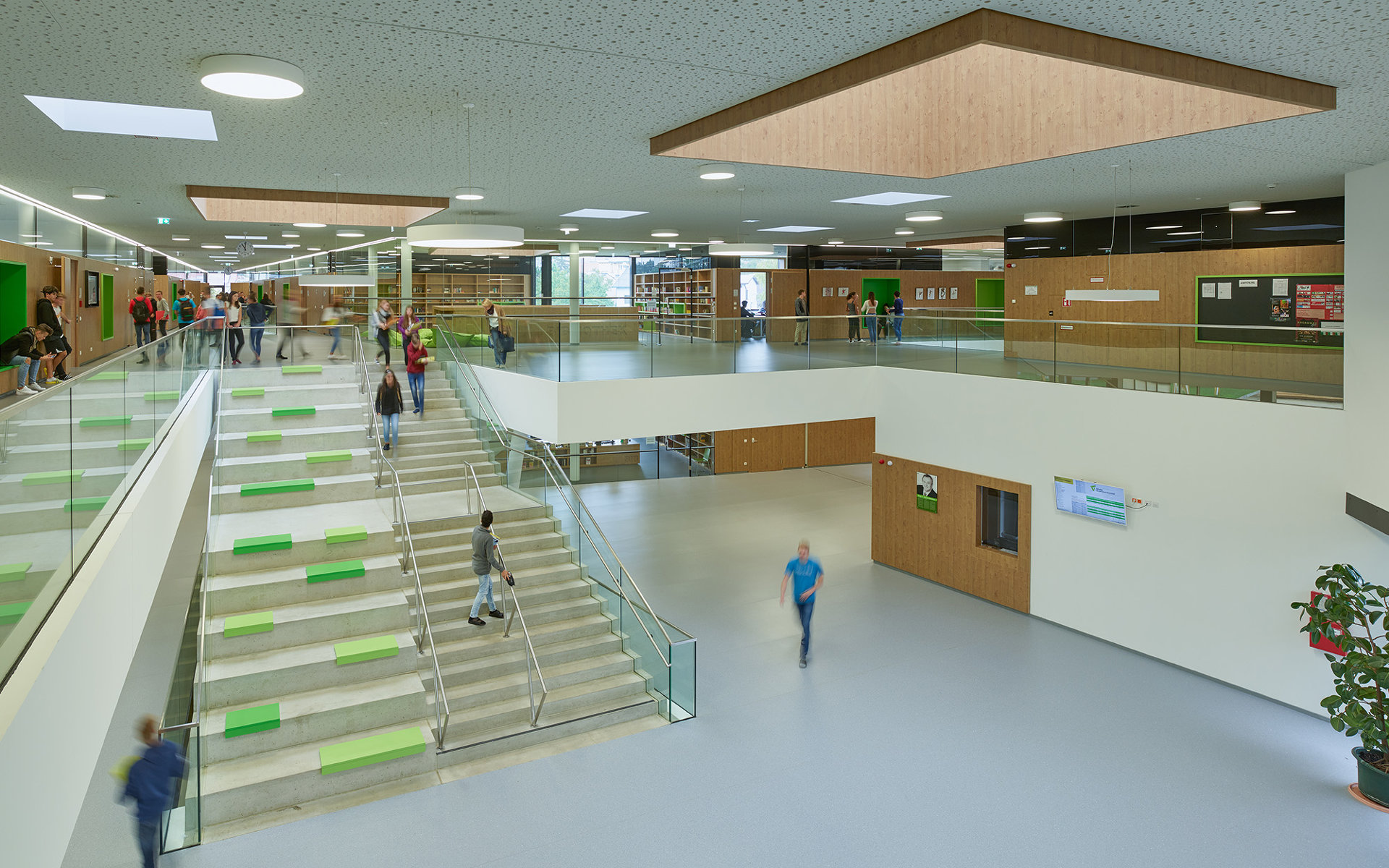 Die Haupterschließung des BORG erfolgt über den überdachten Eingangsbereich in die zentrale, 2-geschossige Aula. An diese schließen hochwertige Verkehrs- und Kommunikationszonen mit großzügigen Lufträumen an, die neben der Erschließung einer vielfältigen und offenen Unterrichtsgestaltung dienen. Großflächige Lichtöffnungen im Dach schaffen einen offenen, lichtdurchfluteten Raum mit Wohlfühlcharakter. Rückzugsmöglichkeiten sind mit unterschiedlich gestalteten Lernbereichen gegeben, die an die mittige Interaktionszone anschließen, dieser zugeschaltet oder individuell bespielt werden können. Den Sonderunterrichtsräumen im EG wird ein großzügiger Frei- und Terrassenbereich zuteil. (Text: Architekten)