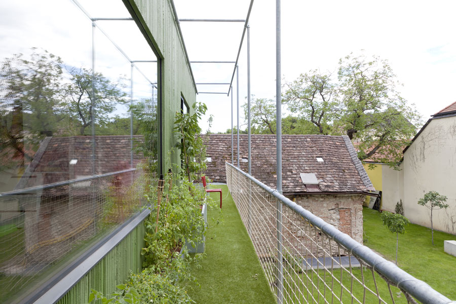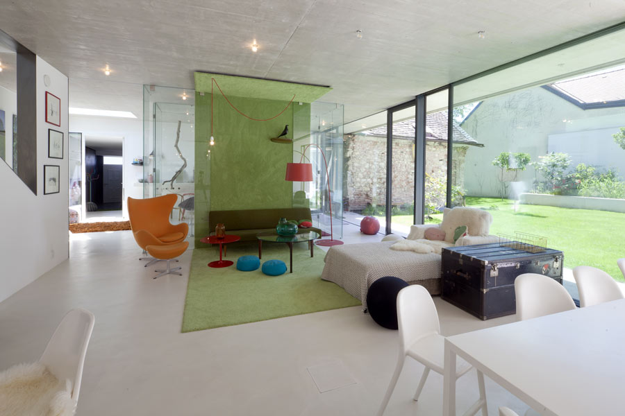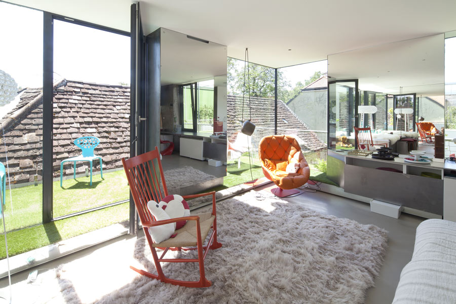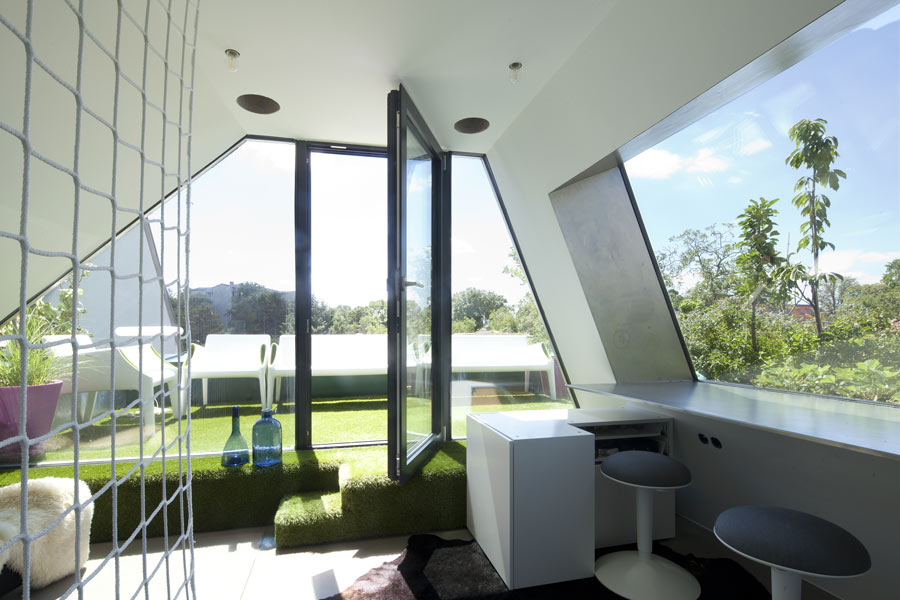 Das erste Geschoss beherbergt jeweils einen großzügigen Eltern-Schlafraum mit Sanitäreinrichtunger sowie ein kompromissorientiertes Schlaf-Arbeits-Zimmer mit Bad für drei Mädchen. Im Dachgeschoss befindet sich ein lichtdurchfluteter Arbeitsbereich mit offenem Ausblick über umliegende Gärten und Bauwerke. Das im Untergeschoss untergebrachte Spielzimmer, wird über einen offen verglasten Stiegenbereich mit Licht versorgt. (Text: Architekten, leicht gekürzt)