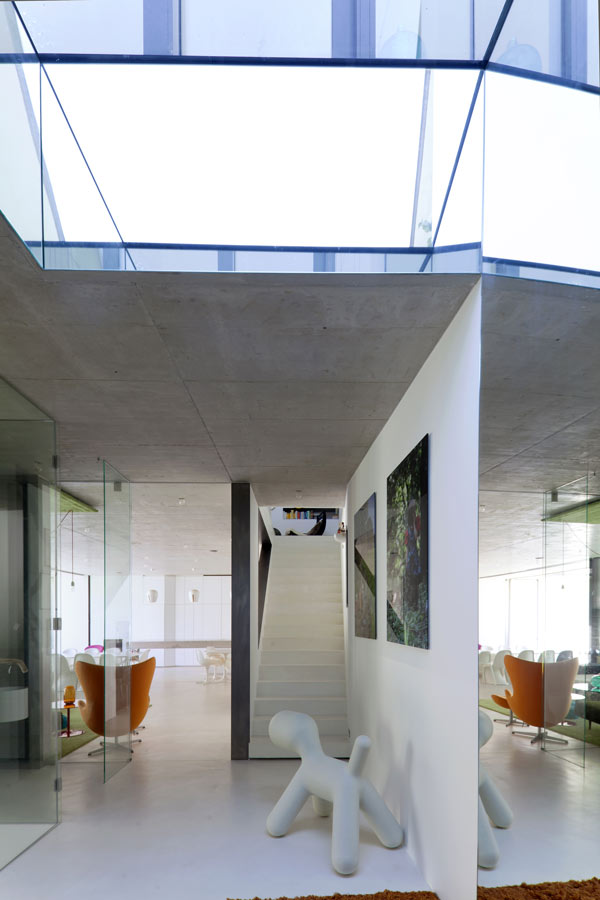 Das Erdgeschoss blieb eine offene Fläche, auf welcher lediglich die durchgehende Glasfassade einen Kalt und einen Warmbereich definiert. Die auskragende Sichtbetondecke spielt harmonisch mit der Betonoberfläche der Gartenterrasse und bietet lebhaften Wasserspiegelungen Kontrast.